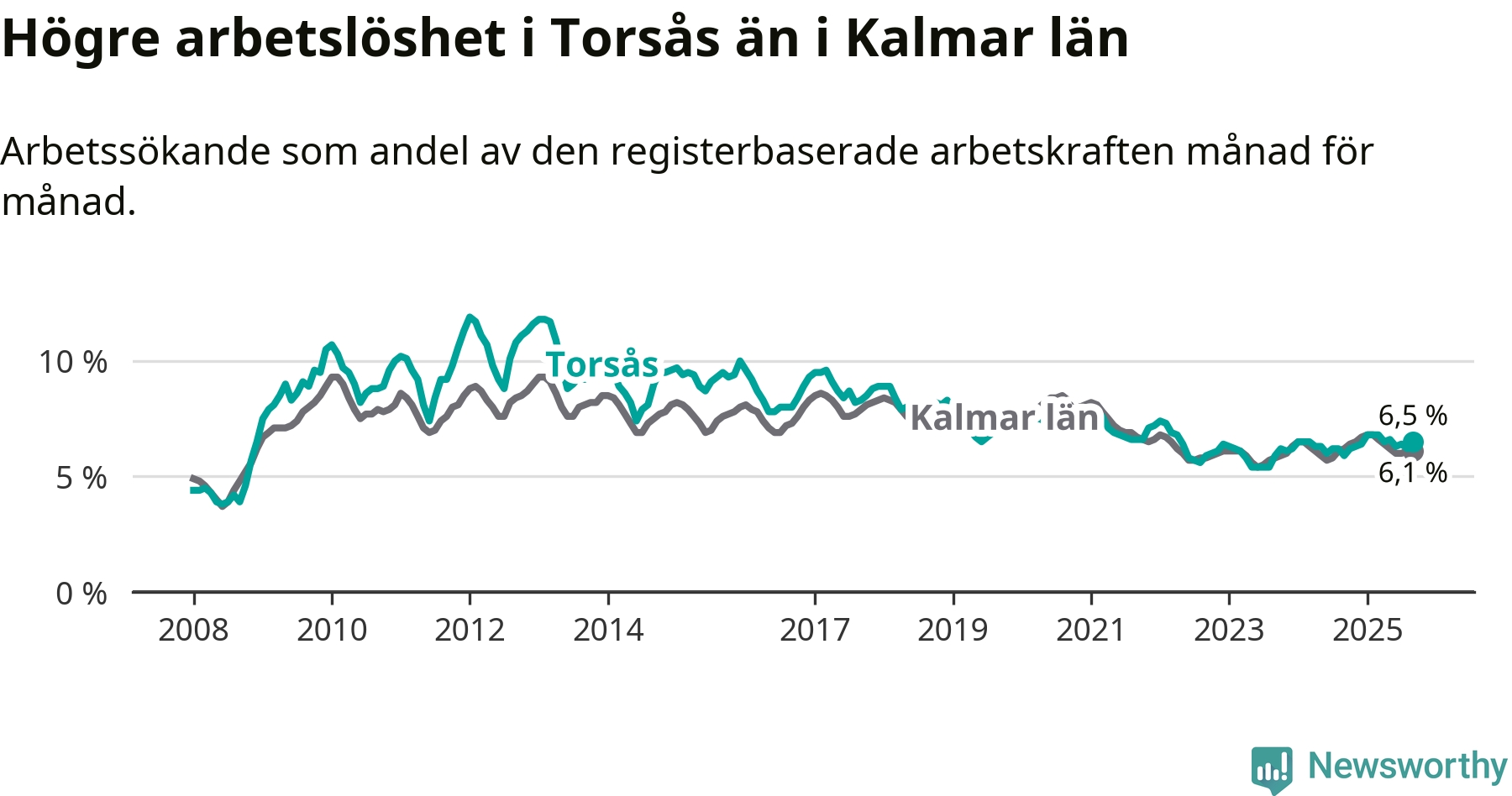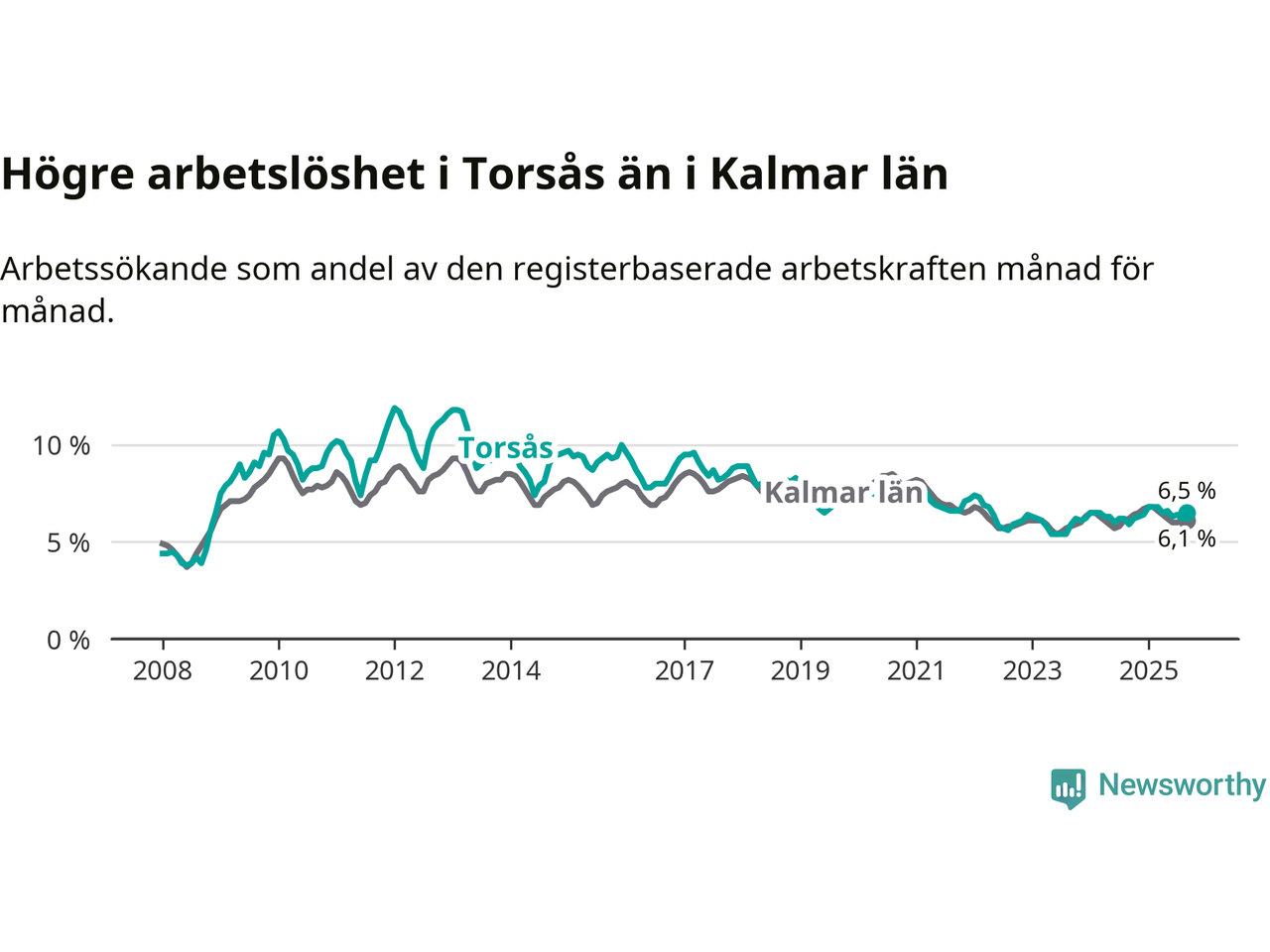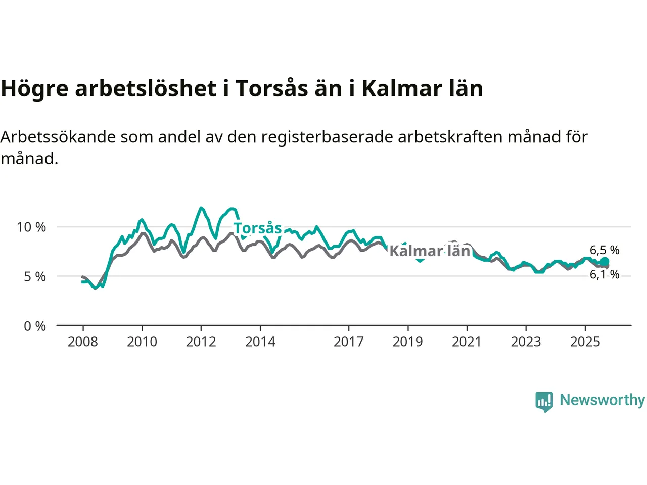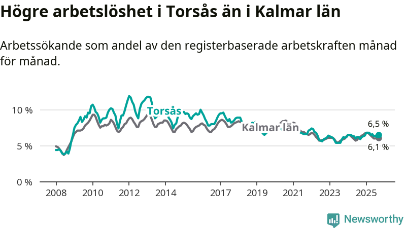 Under september månad rapporterade Torsås kommun en total arbetslöshet på 6,5 procent. Det är en ökning jämfört med samma tidpunkt i fjol (+0,6 procentenheter). I Kalmar län däremot sjunker arbetslösheten något.