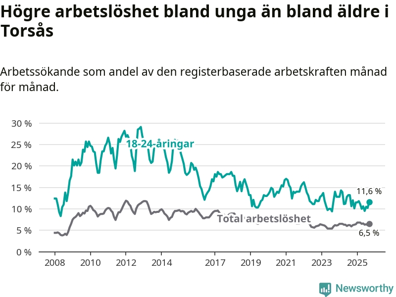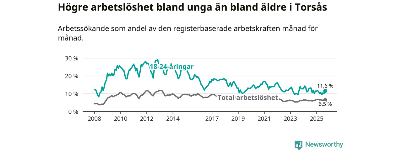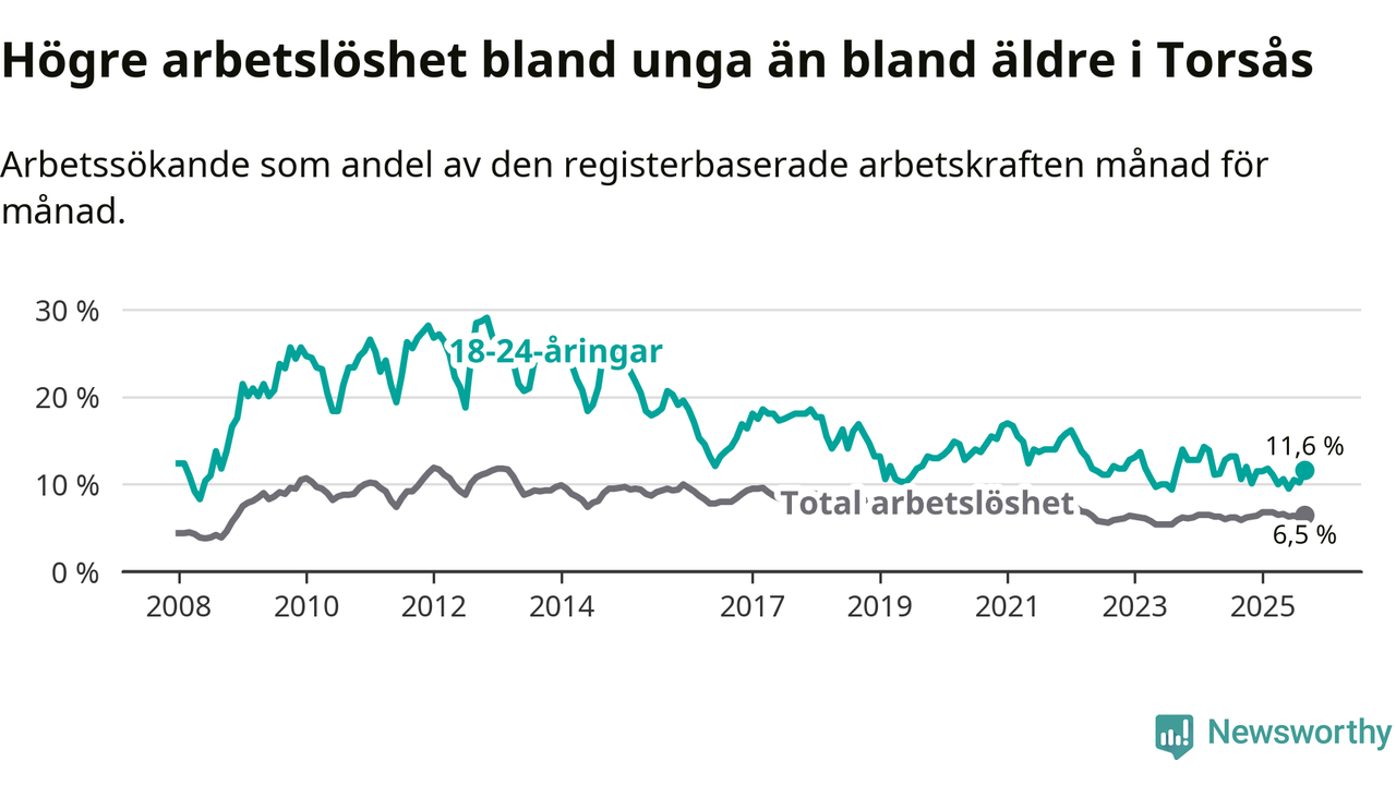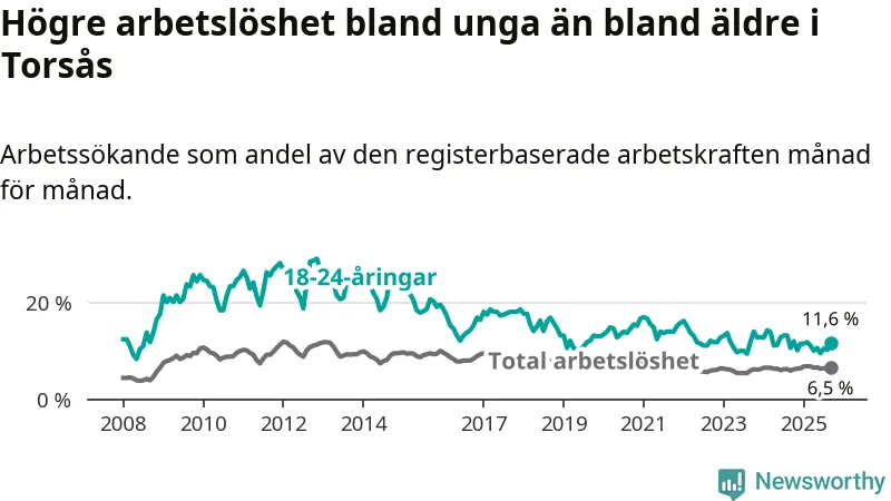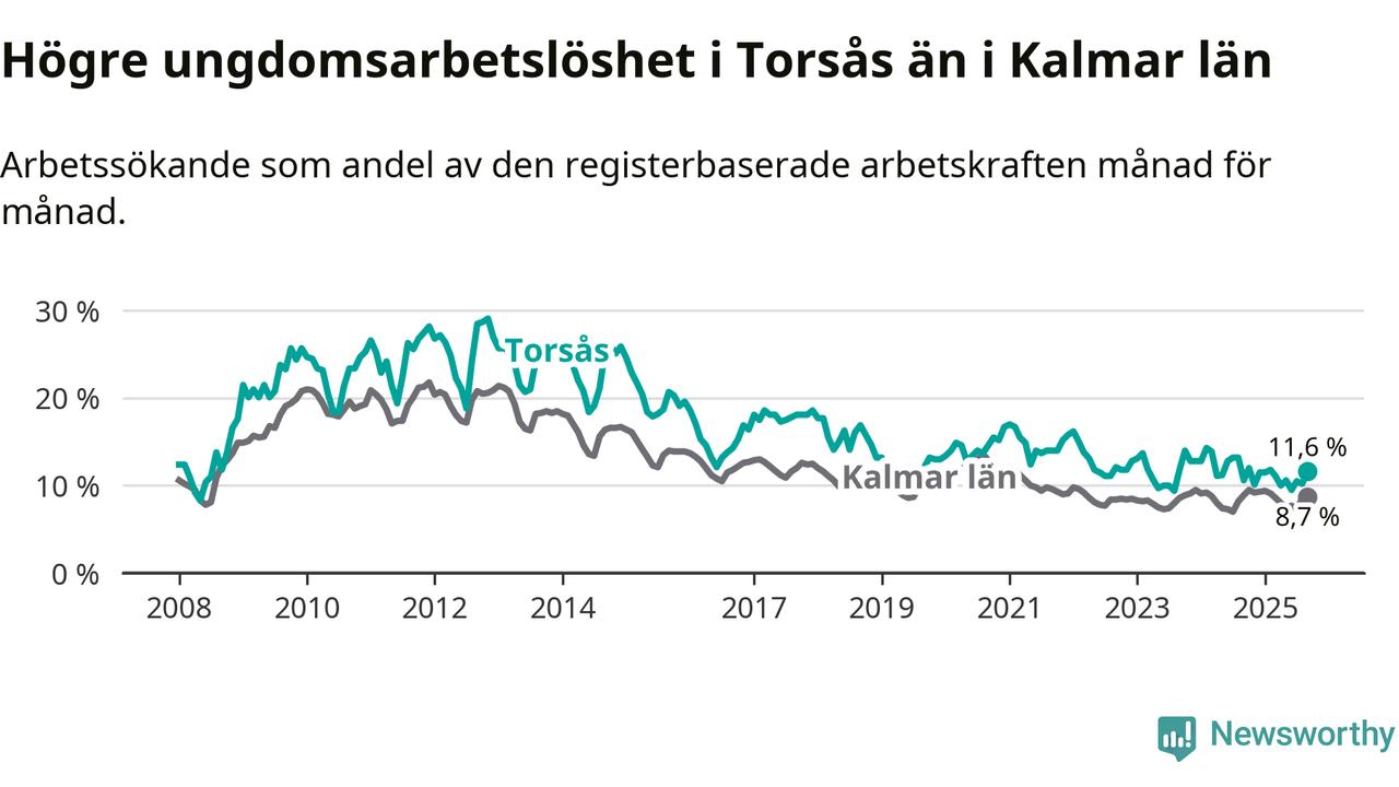 Den senaste månadsstatistiken från Arbetsförmedlingen visar på en uppgång i ungdomsarbetslöshet i Torsås kommun med 1,0 procentenheter. Arbetslösheten bland personer i åldern 18–24 år låg i september på 11,6 procent.