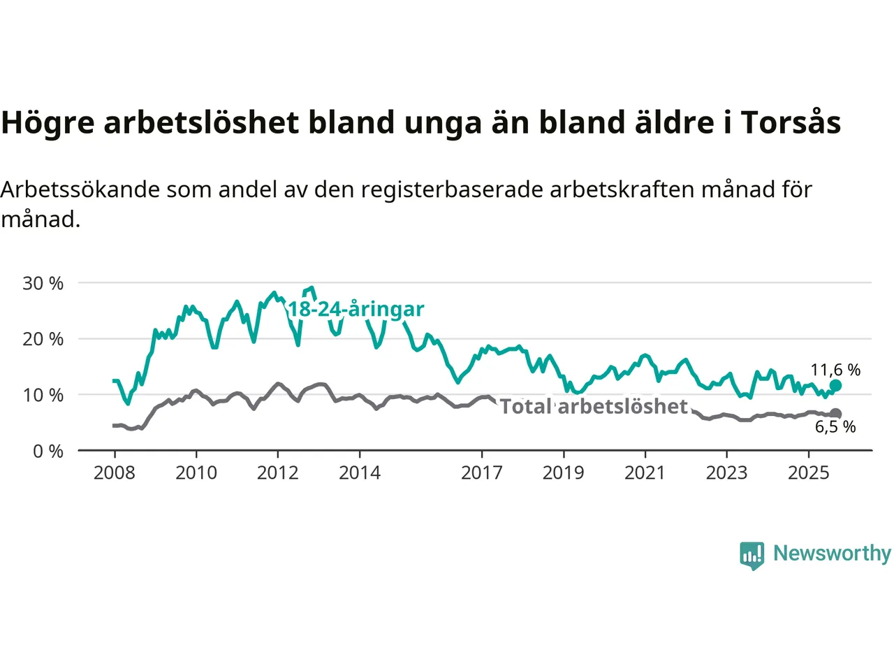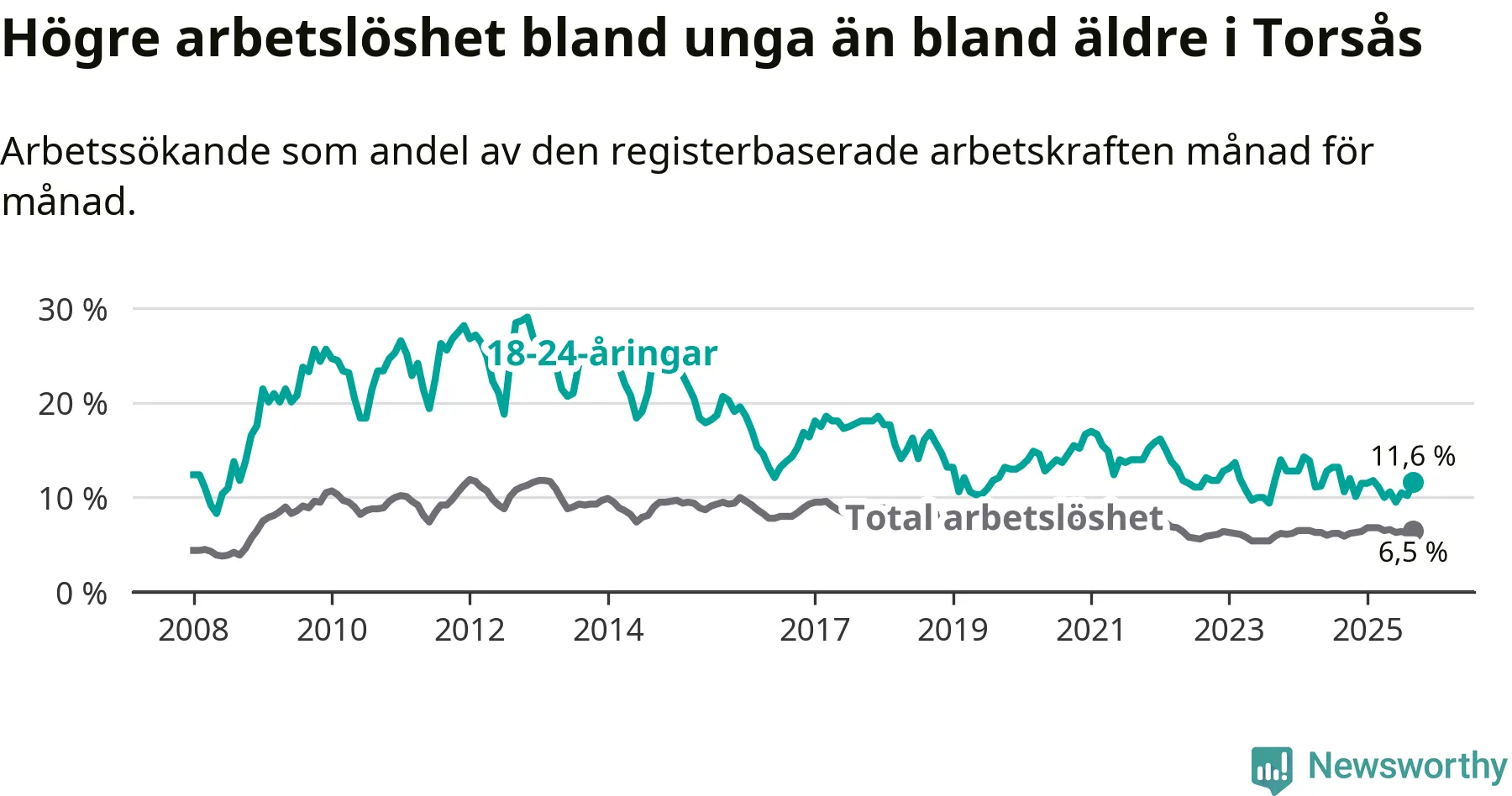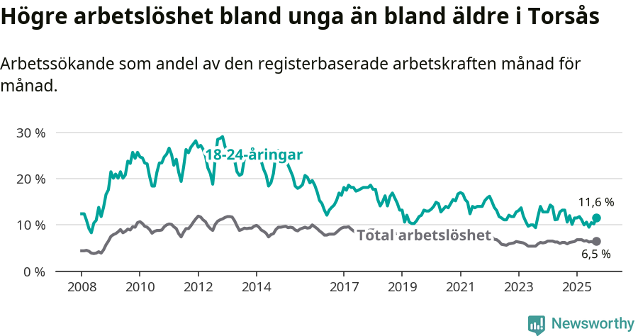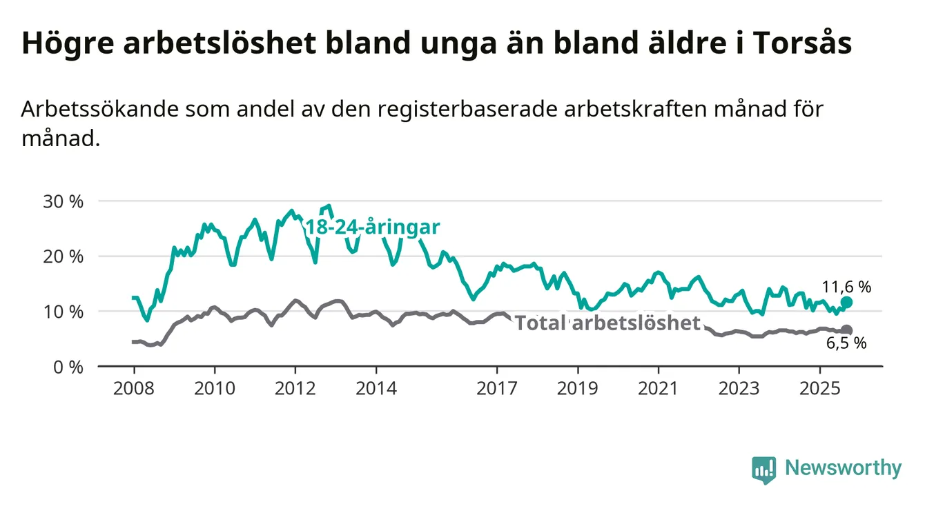 Den senaste månadsstatistiken från Arbetsförmedlingen visar på en uppgång i ungdomsarbetslöshet i Torsås kommun med 1,0 procentenheter. Arbetslösheten bland personer i åldern 18–24 år låg i september på 11,6 procent.