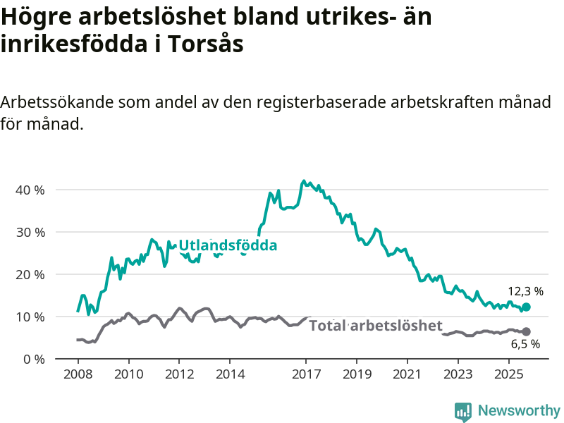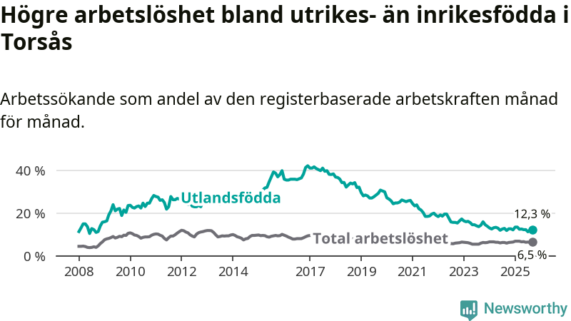 Arbetslösheten bland utlandsfödda var 12,3 procent i Torsås under september månad, motsvarande 46 av 374 personer. Det är 0,5 procentenheter fler än vid samma tidpunkt i fjol (+1 om man räknar personer). Den senaste månadens uppgång innebär ett trendbrott. Under de två föregående månaderna hade arbetslösheten bland utlandsfödda varit lägre än motsvarande tidpunkt året innan.