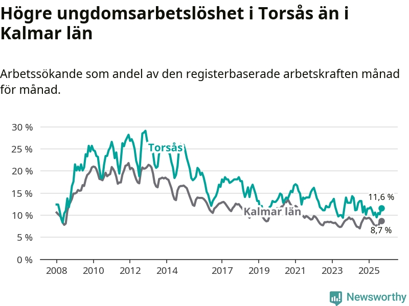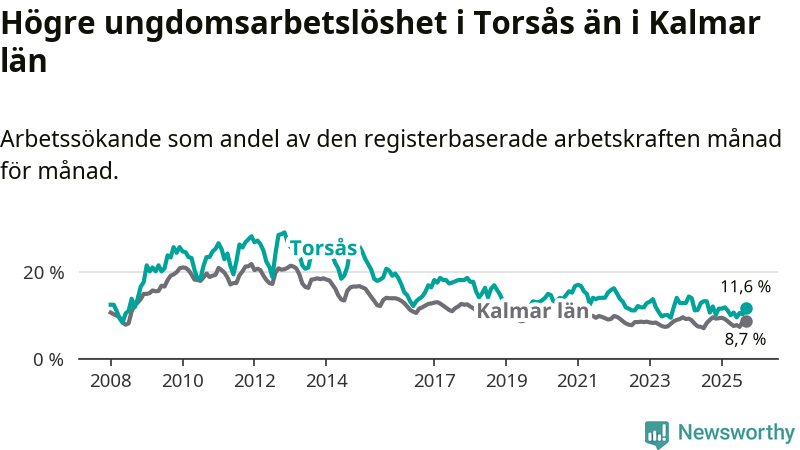 Precis som den totala arbetslösheten ligger ungdomsarbetslösheten i Torsås högre än i Kalmar län som helhet. Skillnaden mellan kommunen och länet är 2,9 procentenheter.