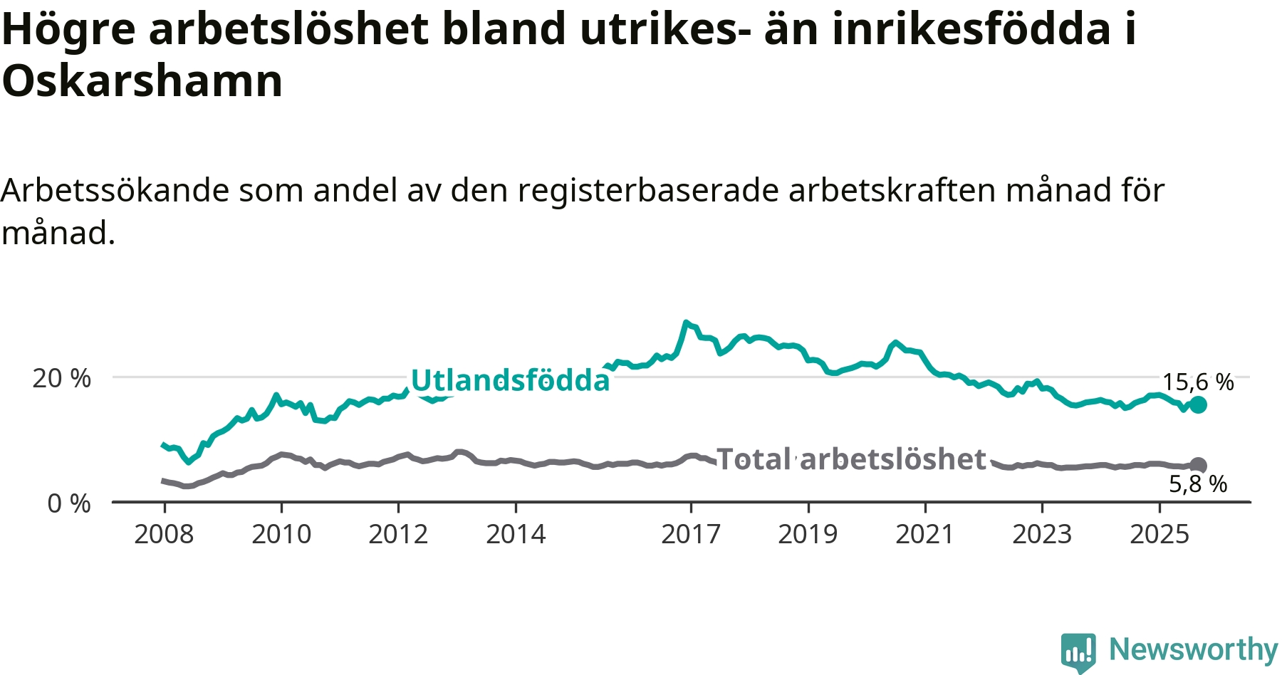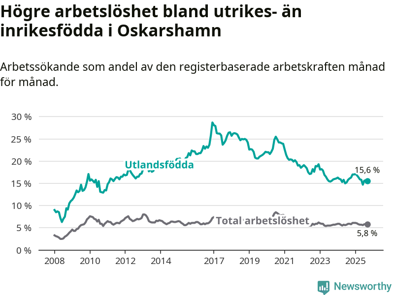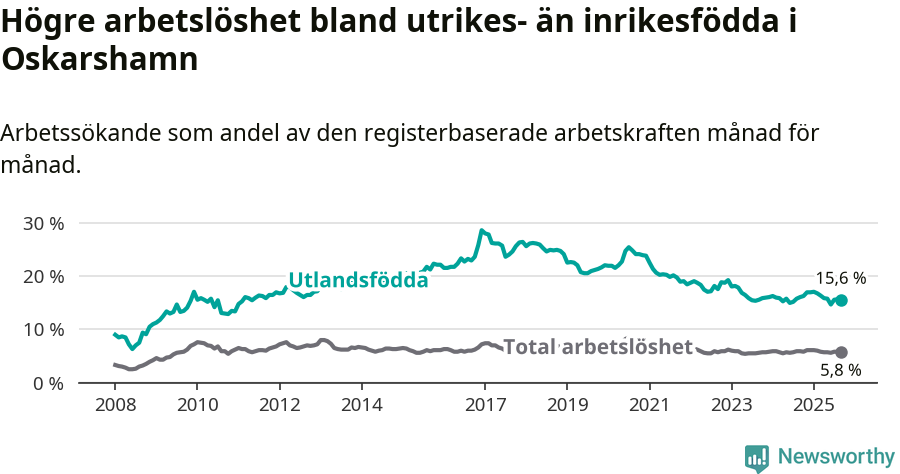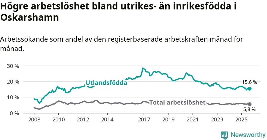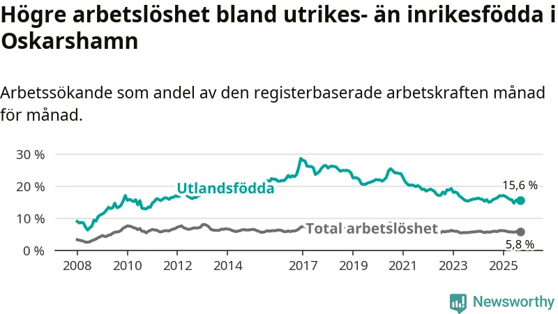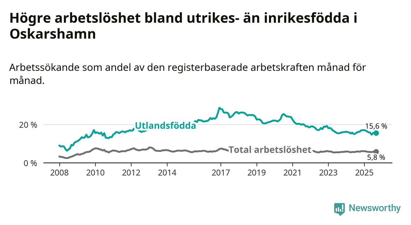 Arbetslösheten bland utlandsfödda var 15,6 procent i Oskarshamn under september månad, motsvarande 394 av 2 526 personer. Det är 0,5 procentenheter färre än vid samma tidpunkt i fjol (−14 om man räknar personer).
