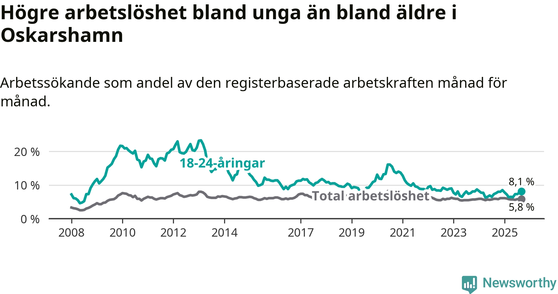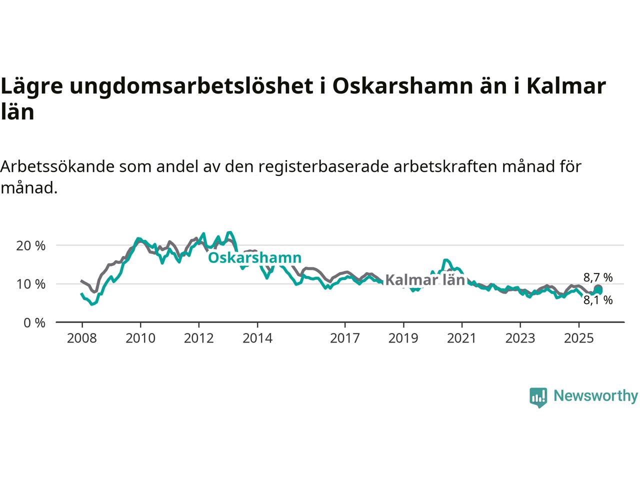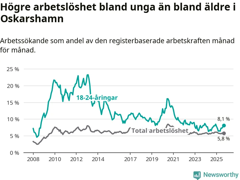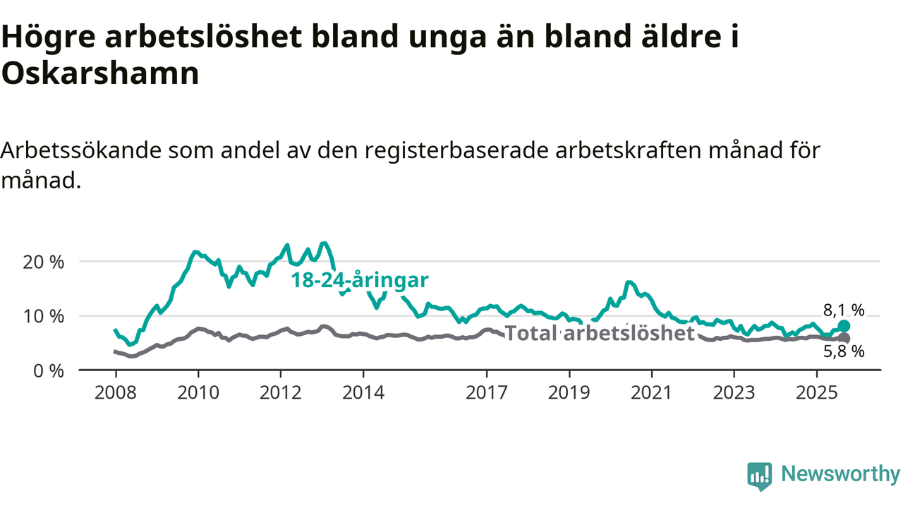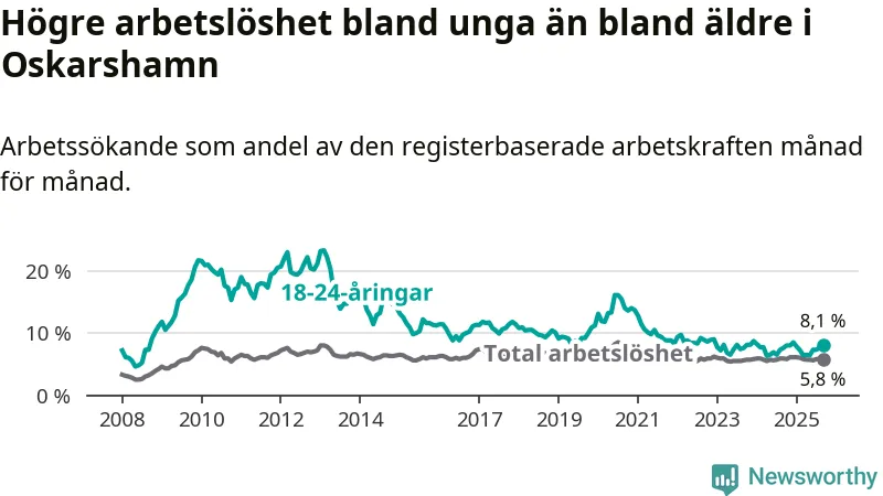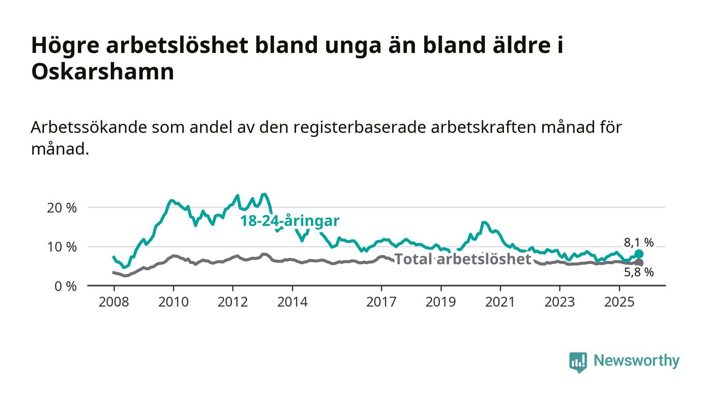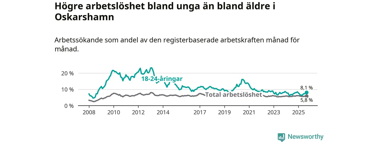 Graf: Arbetslöshet bland unga i Oskarshamns kommun och Kalmar län