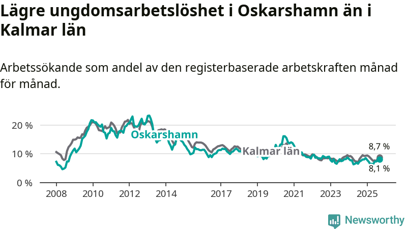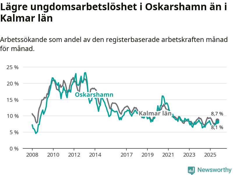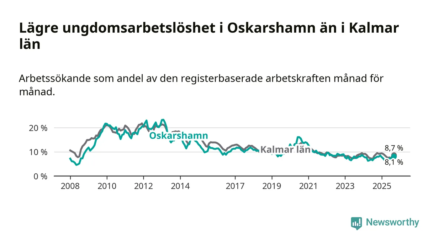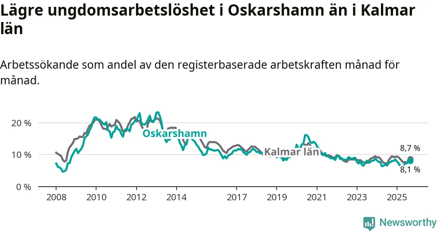 Precis som den totala arbetslösheten ligger ungdomsarbetslösheten i Oskarshamn lägre än i Kalmar län som helhet. Skillnaden mellan kommunen och länet är 0,6 procentenheter.