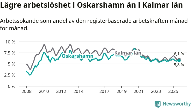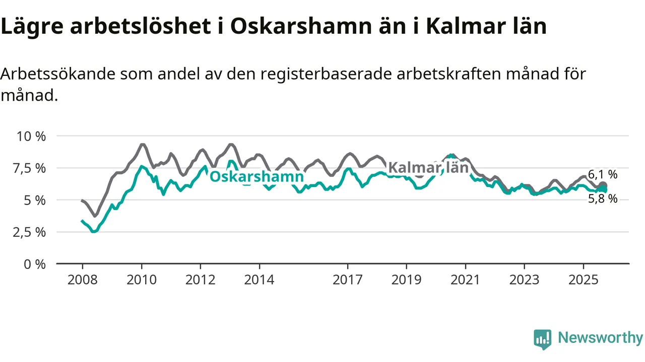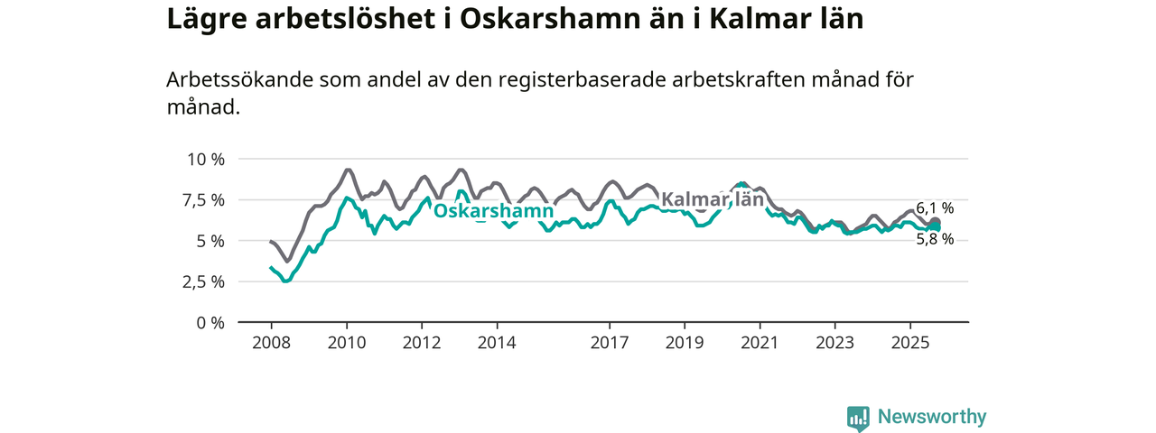 Under september månad rapporterade Oskarshamns kommun en total arbetslöshet på 5,8 procent. Det är en minskning jämfört med samma tidpunkt i fjol (−0,1 procentenheter). Även i Kalmar län sjunker arbetslösheten något.