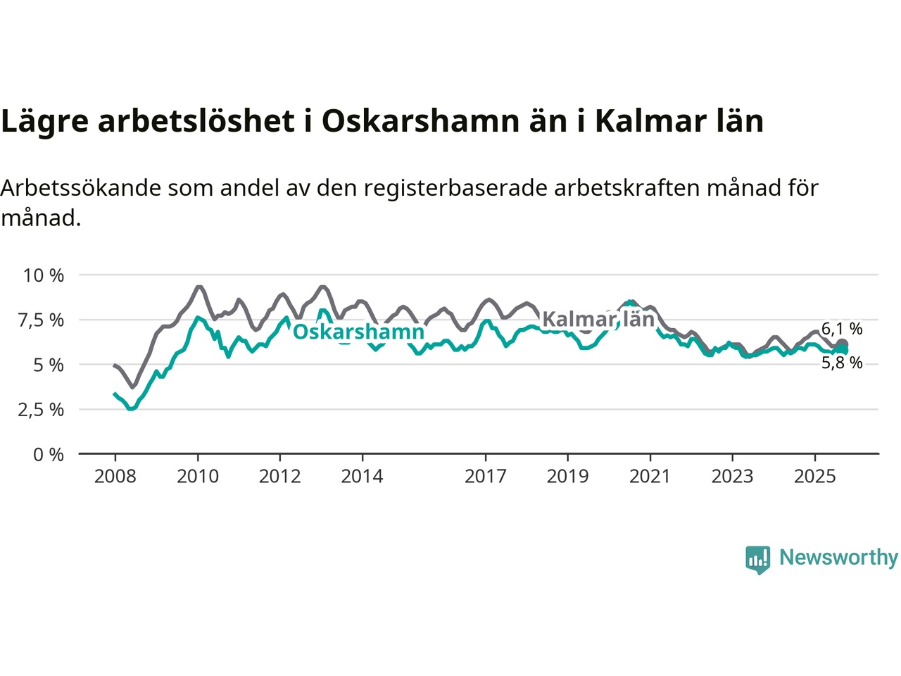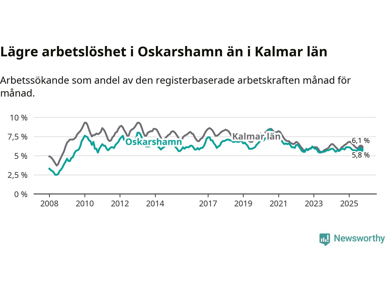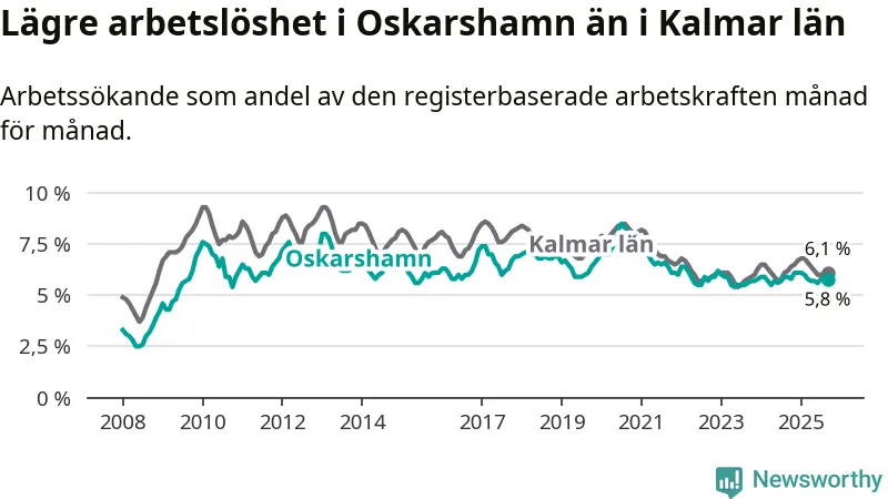 Oskarshamn hade redan tidigare lägre arbetslöshet än snittet i hela Kalmar län och nu växer klyftan (5,8 procent i kommunen, jämfört med 6,1 procent i hela länet). Mörbylånga har den lägsta arbetslösheten i länet (3,4 procent), medan Högsby har den högsta (8,1 procent). För att Oskarshamn skulle komma ner i samma arbetslöshetsnivå som Mörbylånga skulle 313 personer behöva sysselsättas.