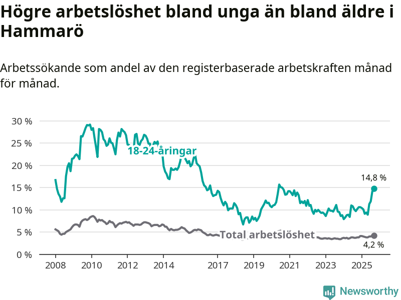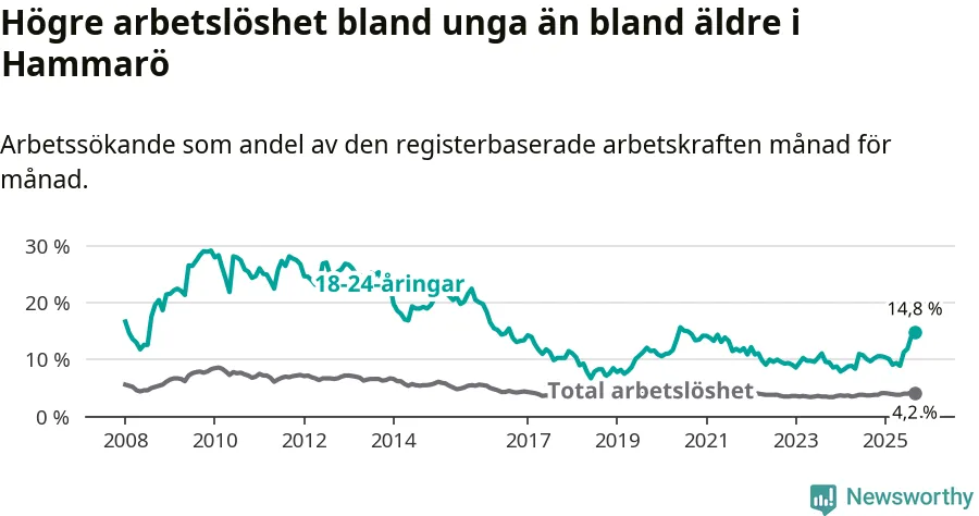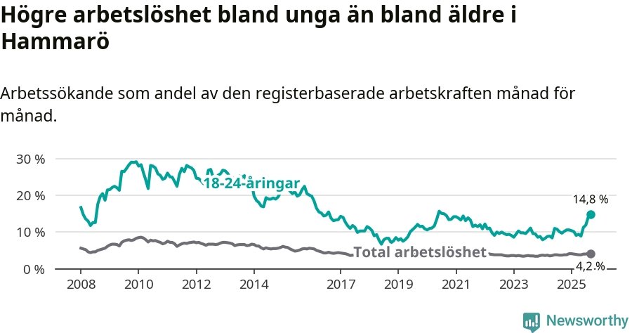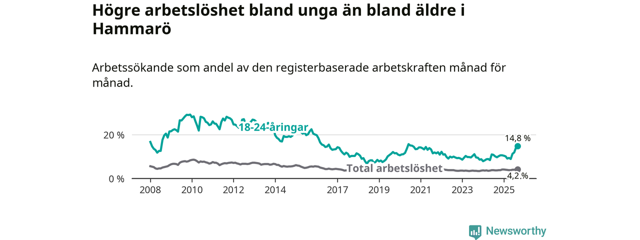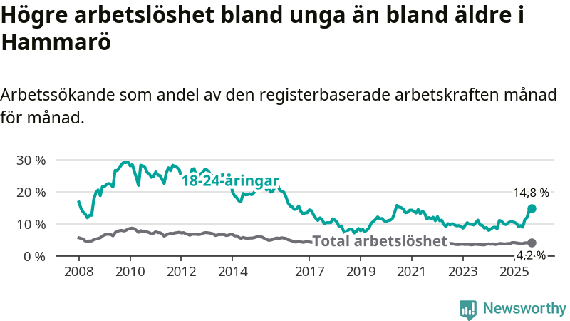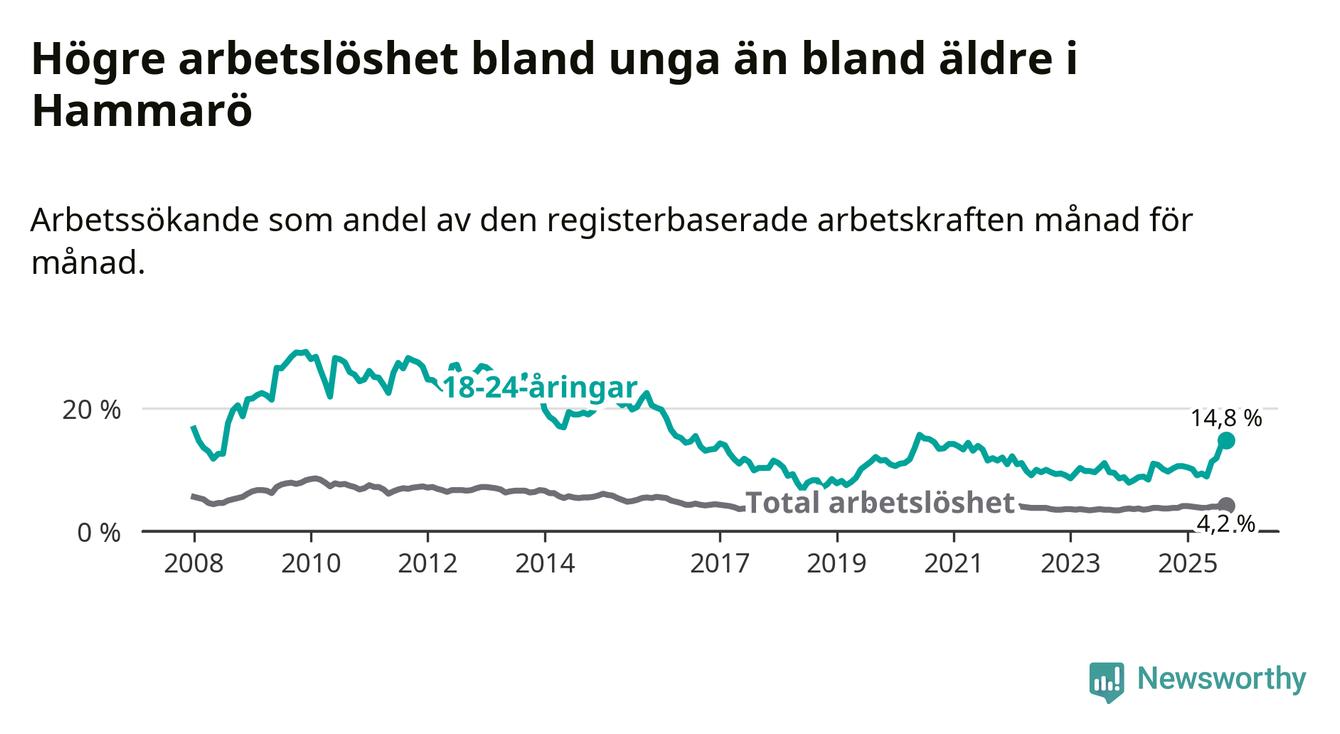 I och med den senaste månadens uppgång har de ungas arbetslöshet på Hammarö stigit 13 månader i följd (upp från 10,1 procent i augusti 2024 till 14,8 procent nu). Den nuvarande arbetslöshetsnivån är den högsta sedan augusti 2020.