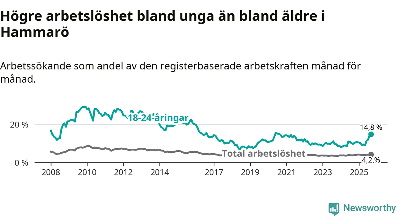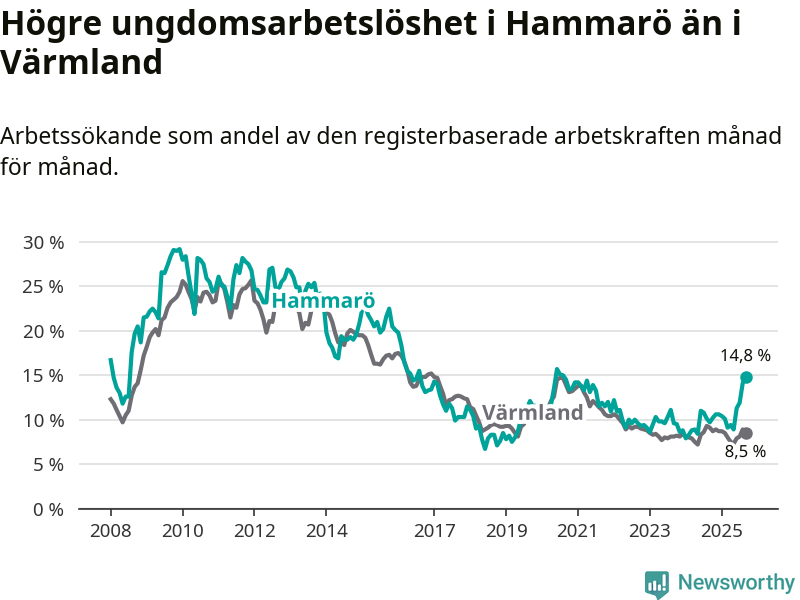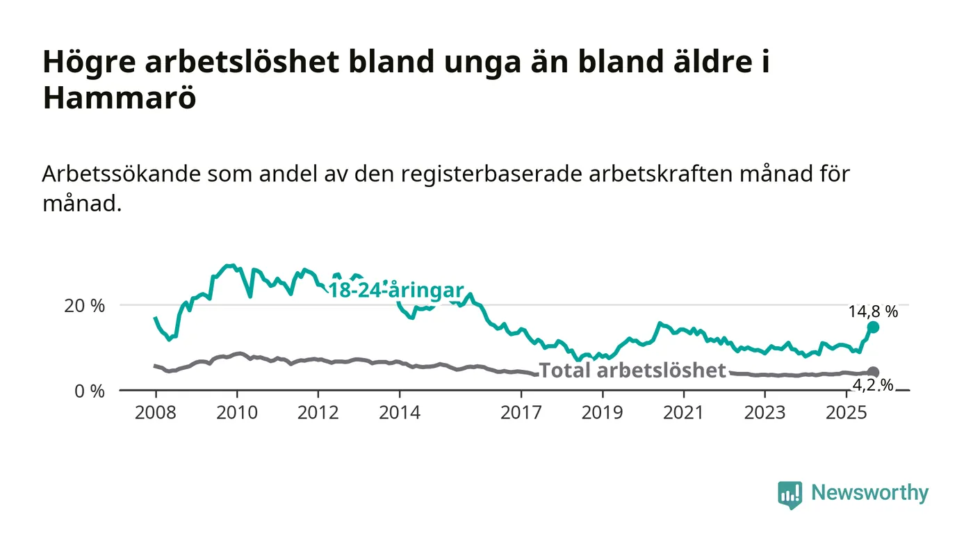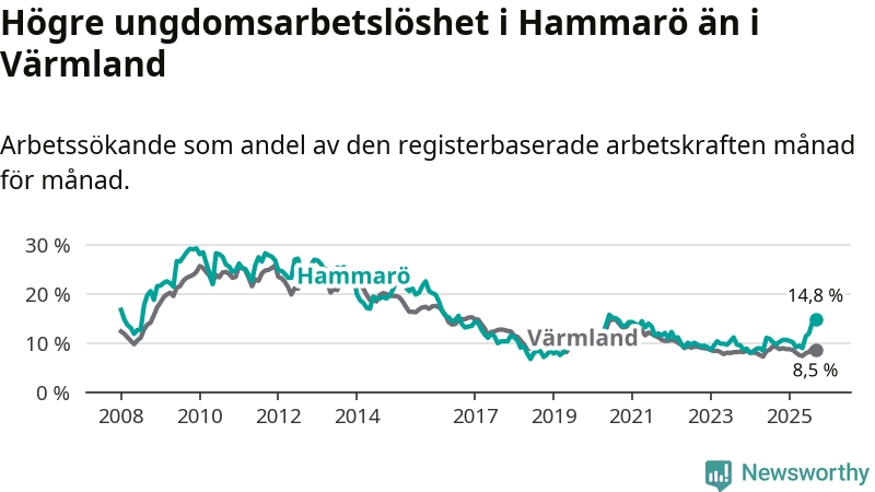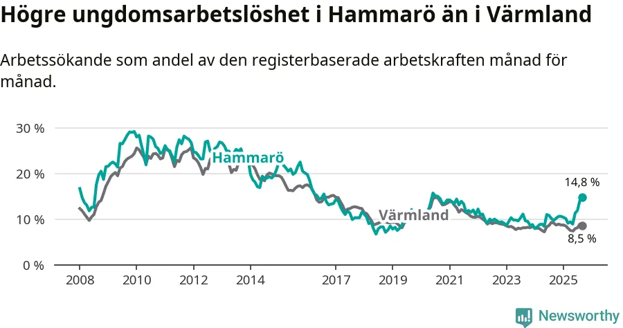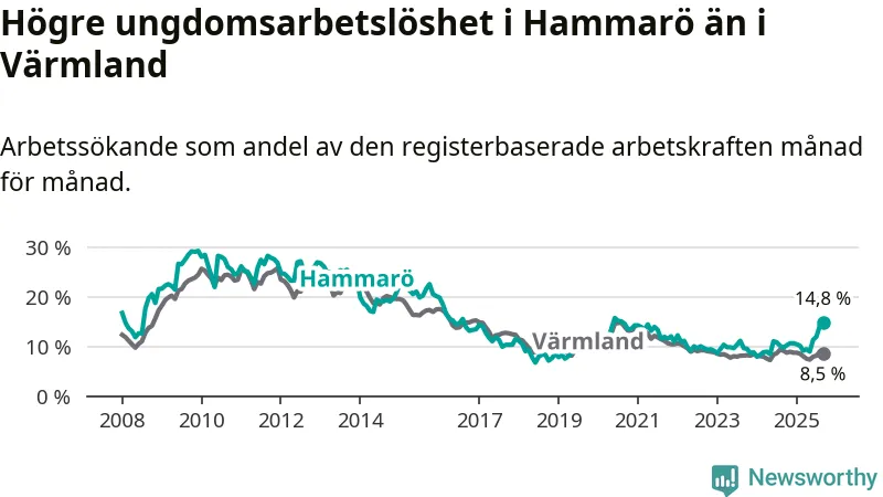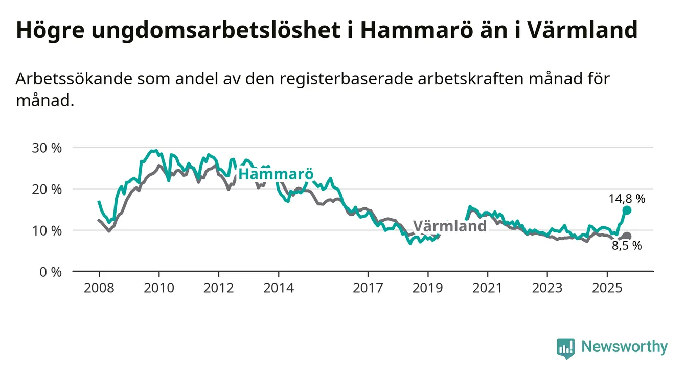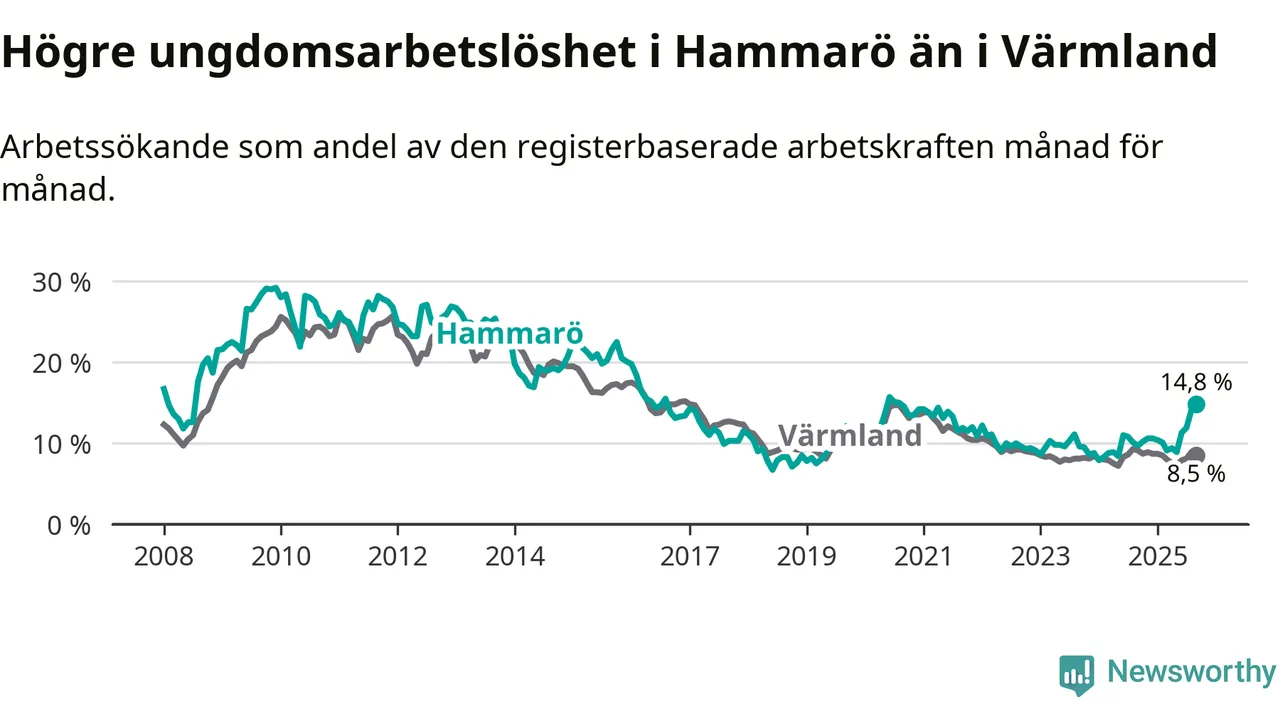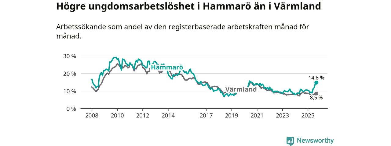 Medan Hammarö har lägre total arbetslöshet än Värmland, ligger ungdomsarbetslösheten 6,3 procentenheter högre på Hammarö.