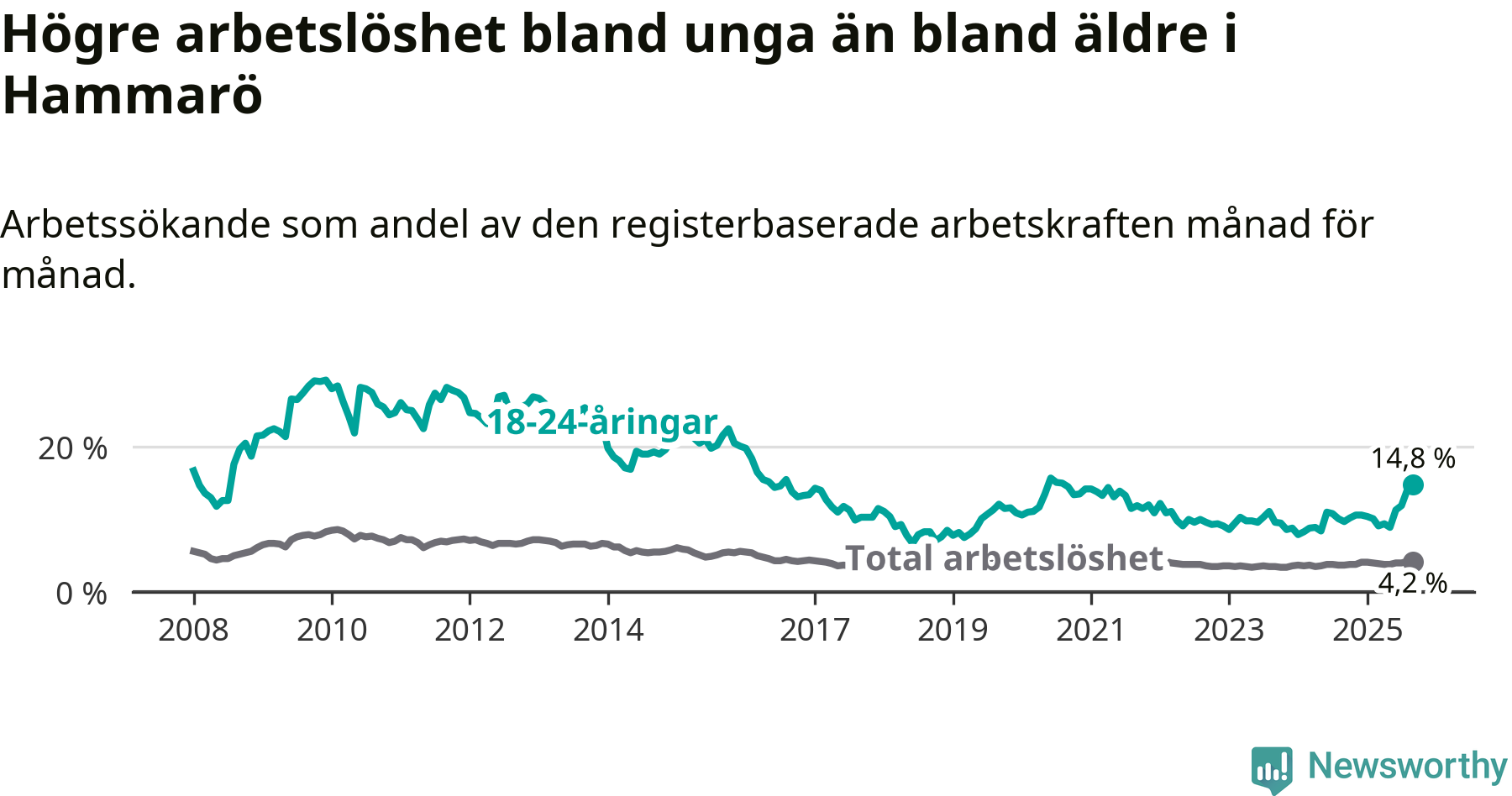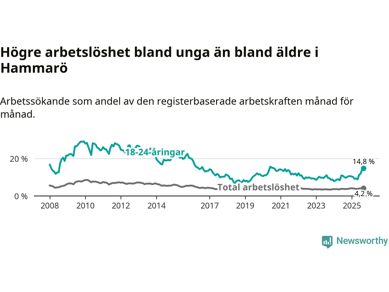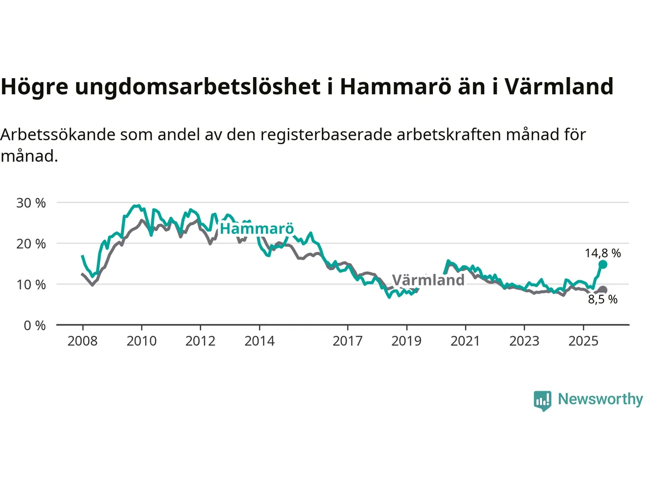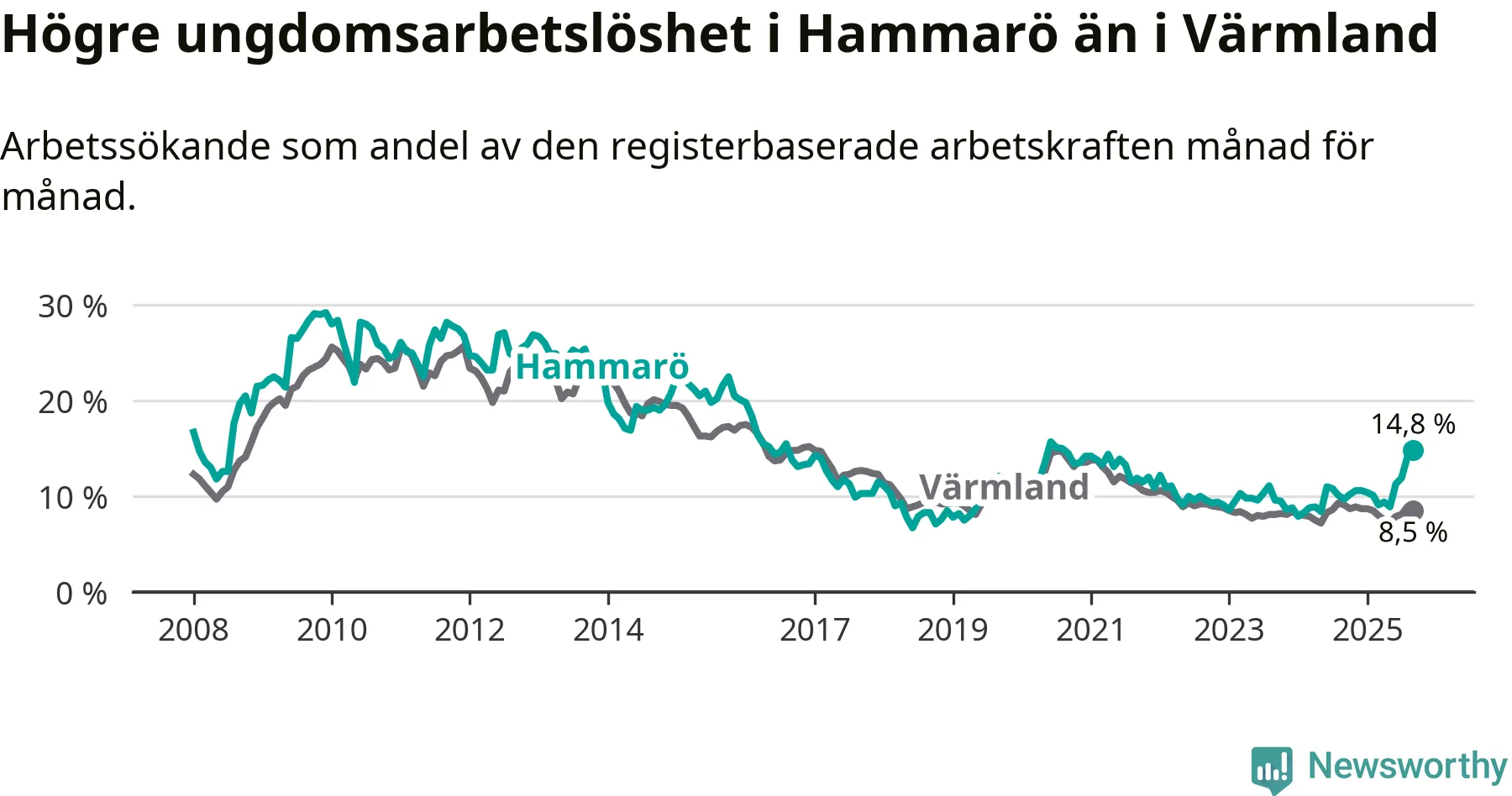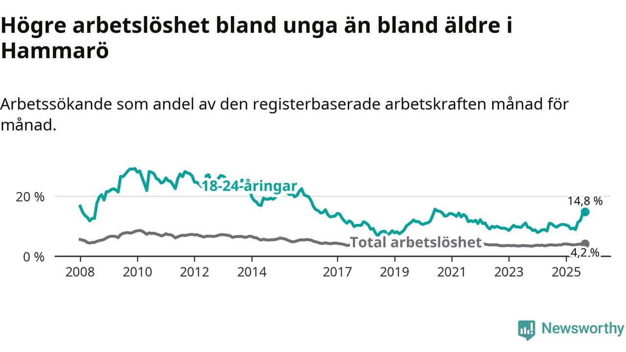 Medan Hammarö har lägre total arbetslöshet än Värmland, ligger ungdomsarbetslösheten 6,3 procentenheter högre på Hammarö.