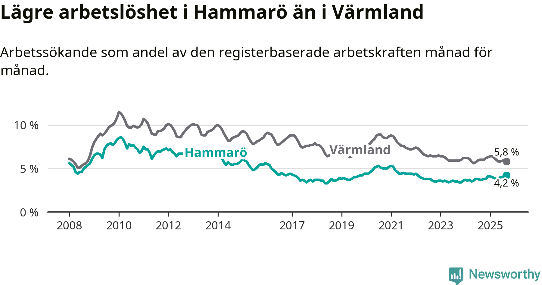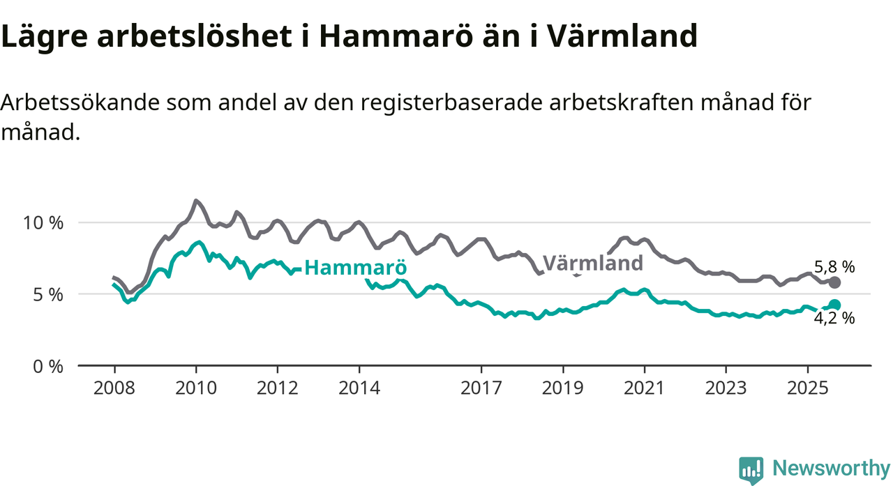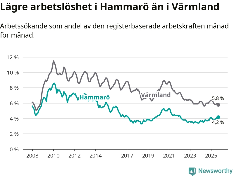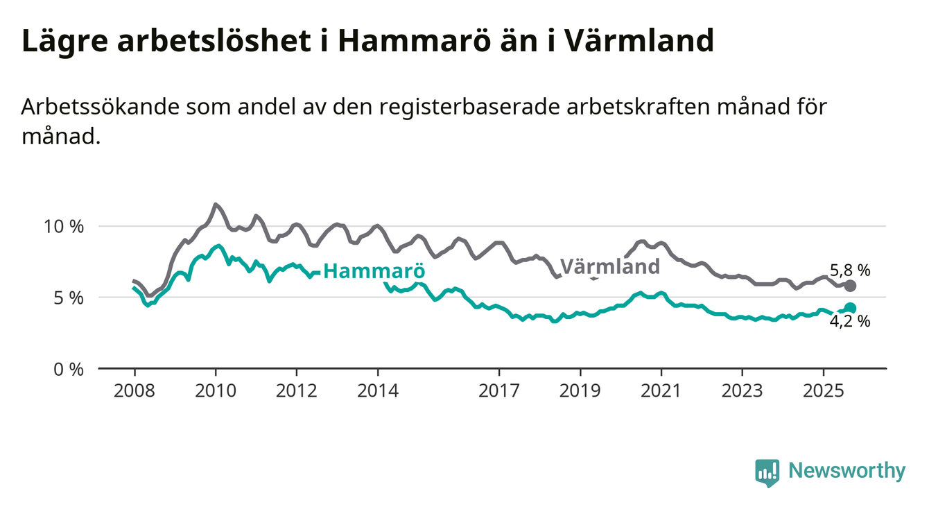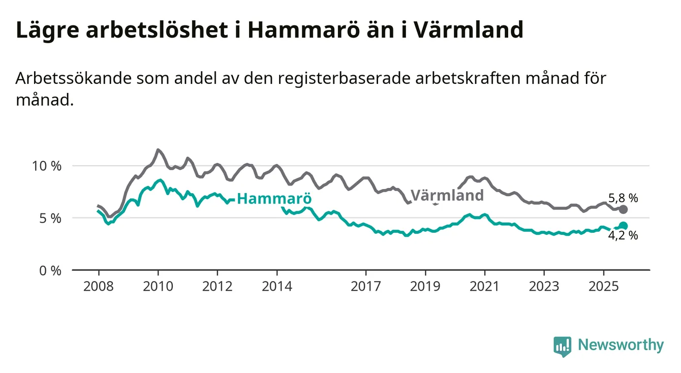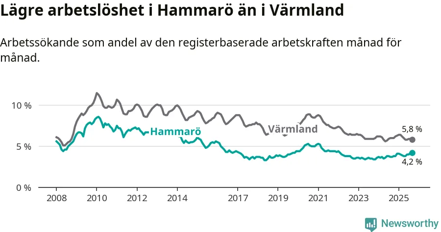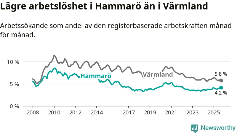 Under september månad rapporterade Hammarö kommun en total arbetslöshet på 4,2 procent. Det är en ökning jämfört med samma tidpunkt i fjol (+0,5 procentenheter). I Värmlands län däremot sjunker arbetslösheten något.