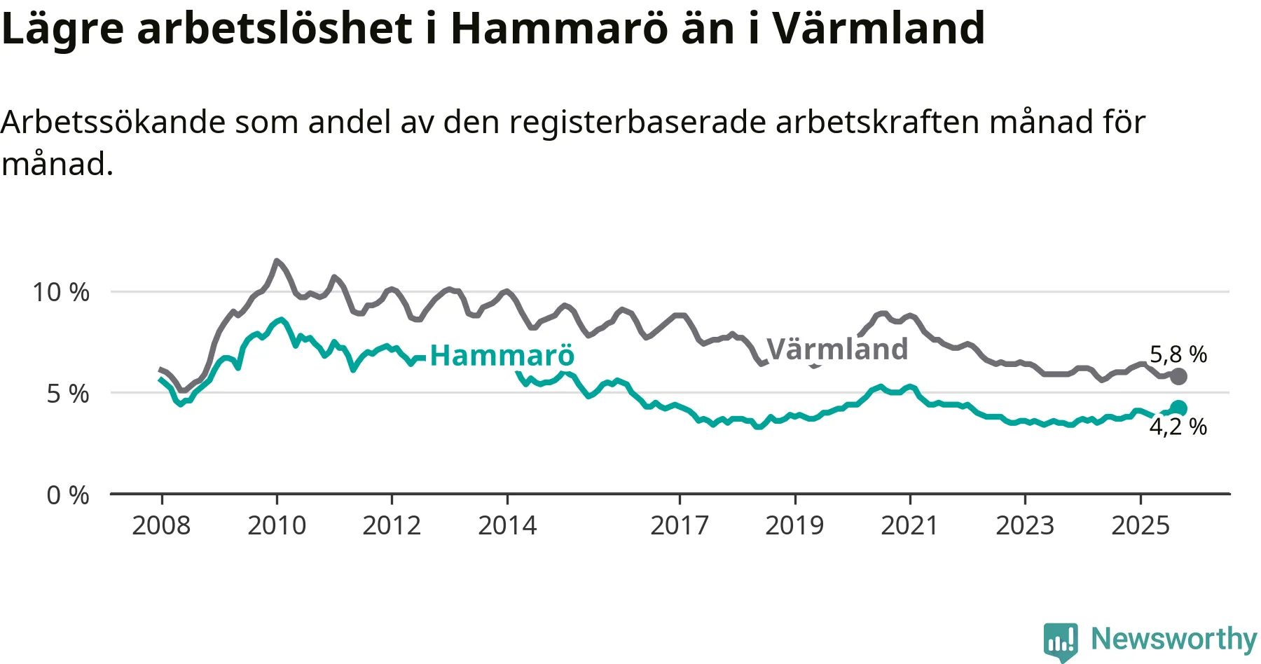 Även om arbetslösheten på Hammarö alltså ökar, så ligger den fortfarande under snittet i hela Värmlands län (4,2 procent i kommunen, jämfört med 5,8 procent i hela länet). Torsby har den lägsta arbetslösheten i länet (3,5 procent), medan Filipstad har den högsta (8,3 procent). För att Hammarö skulle komma ner i samma arbetslöshetsnivå som Torsby skulle 57 personer behöva sysselsättas.