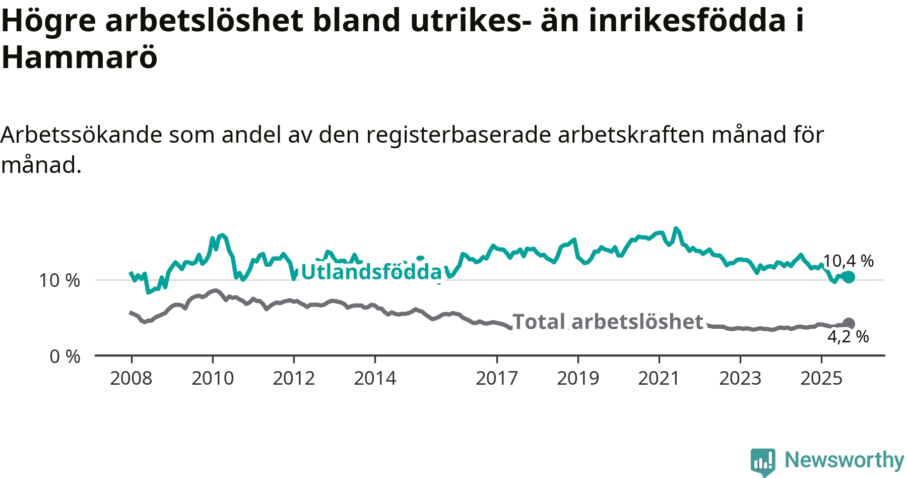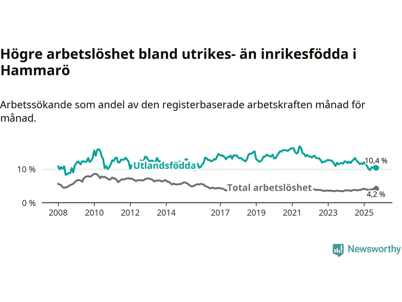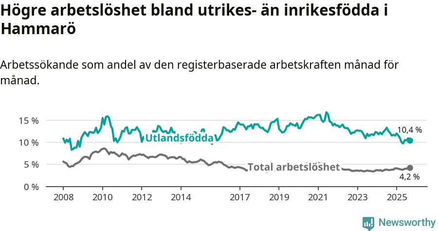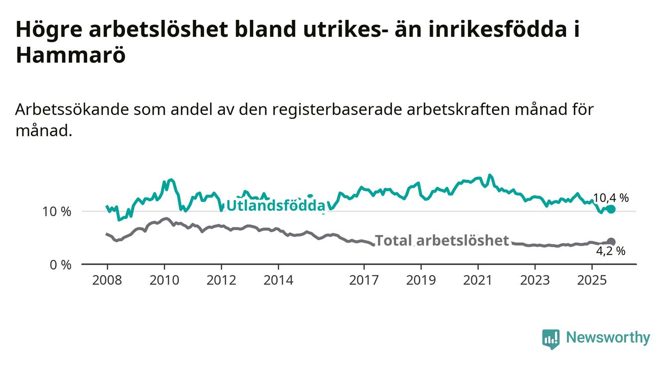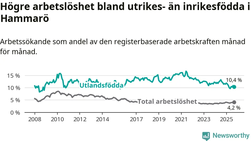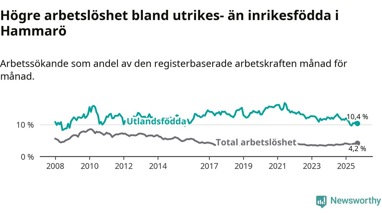 Arbetslösheten bland utlandsfödda var 10,4 procent på Hammarö under september månad, motsvarande 78 av 750 personer. Det är 1,7 procentenheter färre än vid samma tidpunkt i fjol (−10 om man räknar personer). Därmed är de utlandsföddas arbetslöshet lägre än vid samma tidpunkt i fjol för tionde månaden i följd. Sedan november 2024 har arbetslösheten bland utlandsfödda minskat från 11,7 till 10,4 procent.