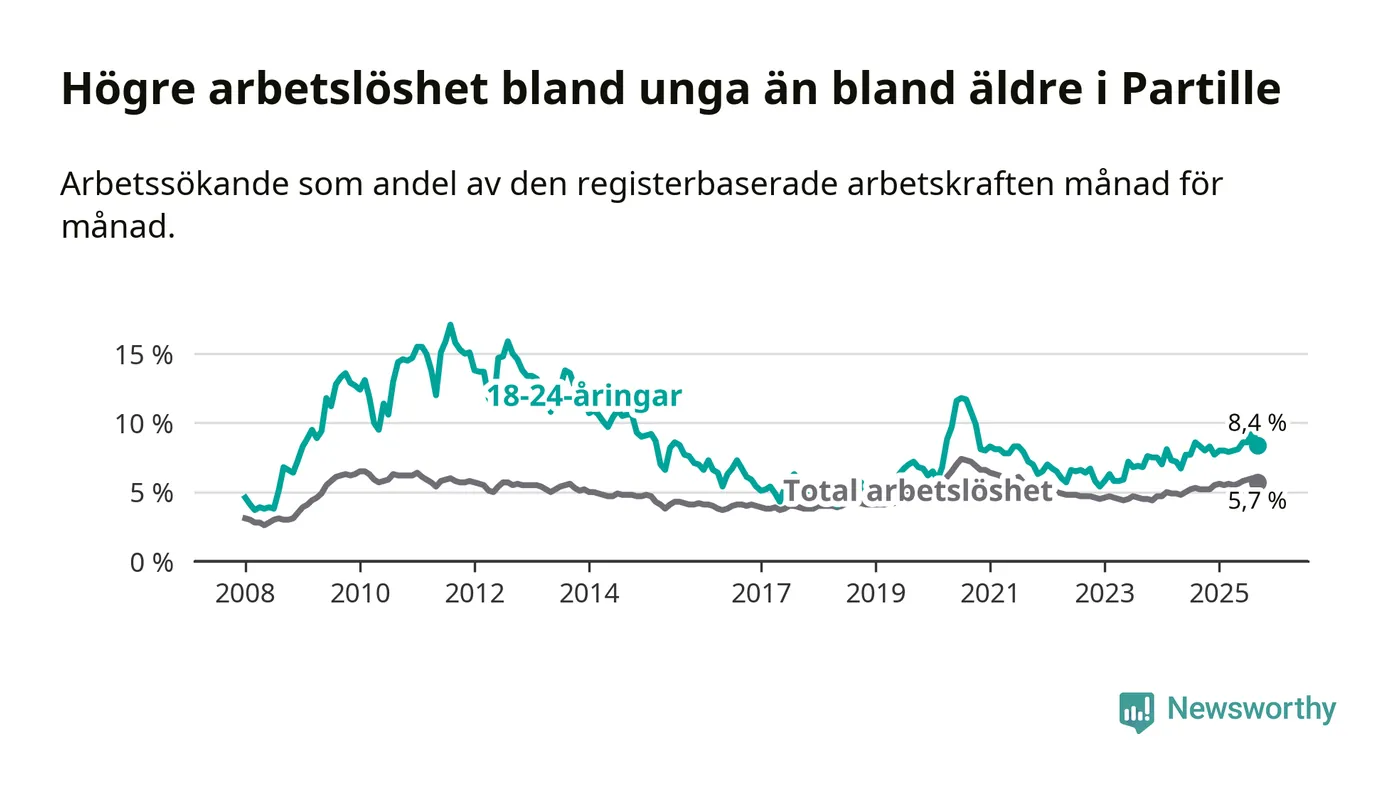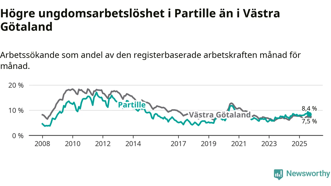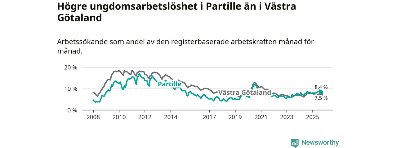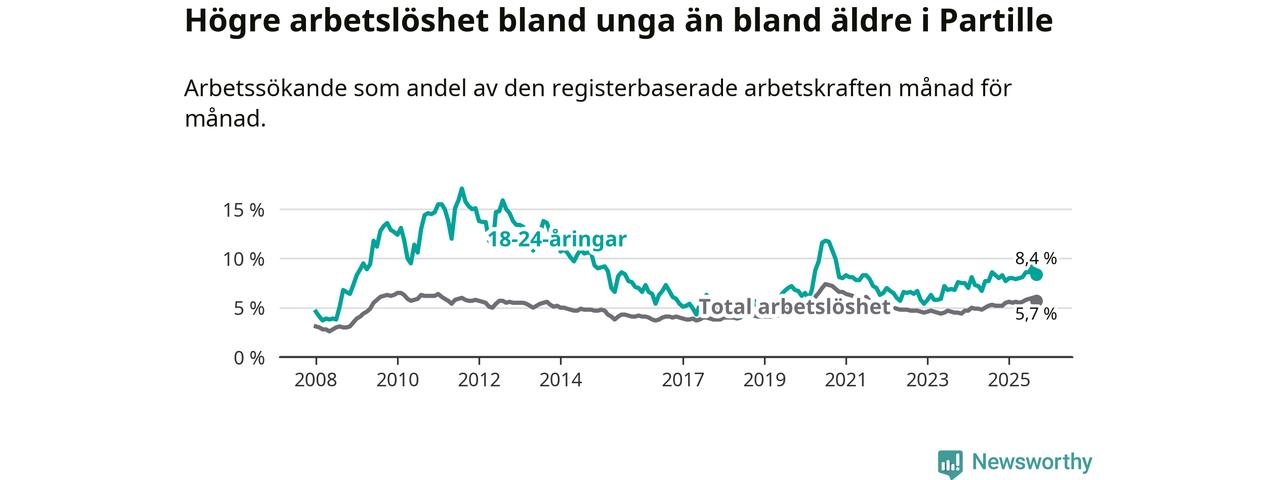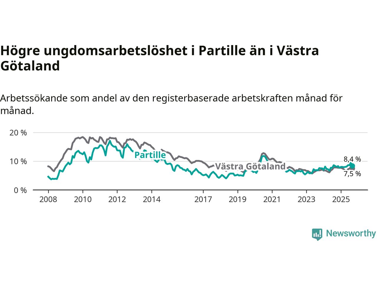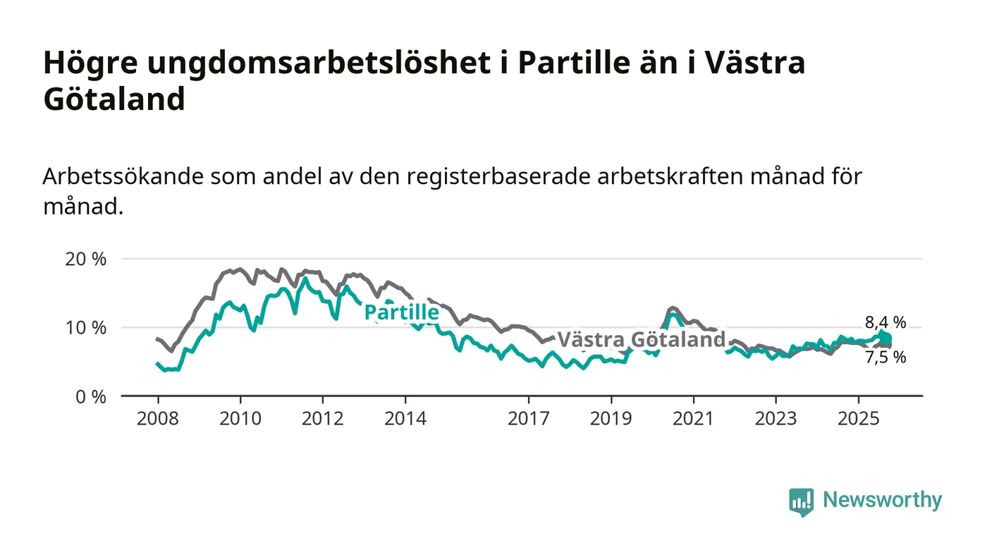 Medan Partille har lägre total arbetslöshet än Västra Götaland, ligger ungdomsarbetslösheten 0,9 procentenheter högre i Partille.