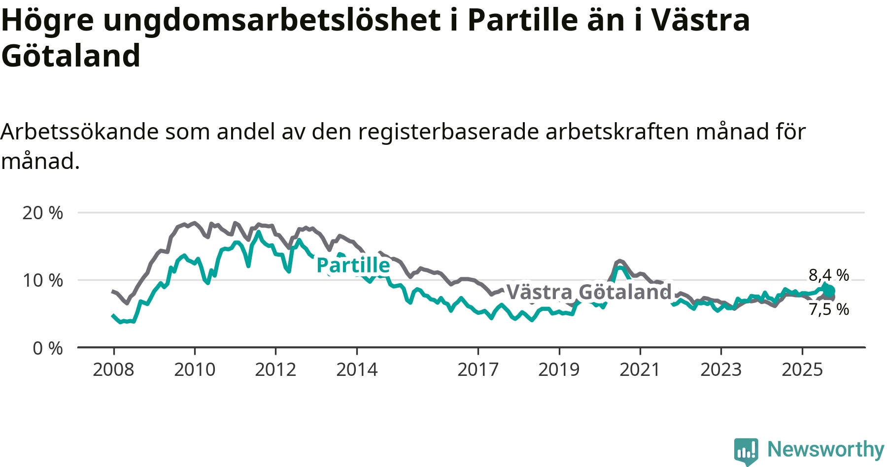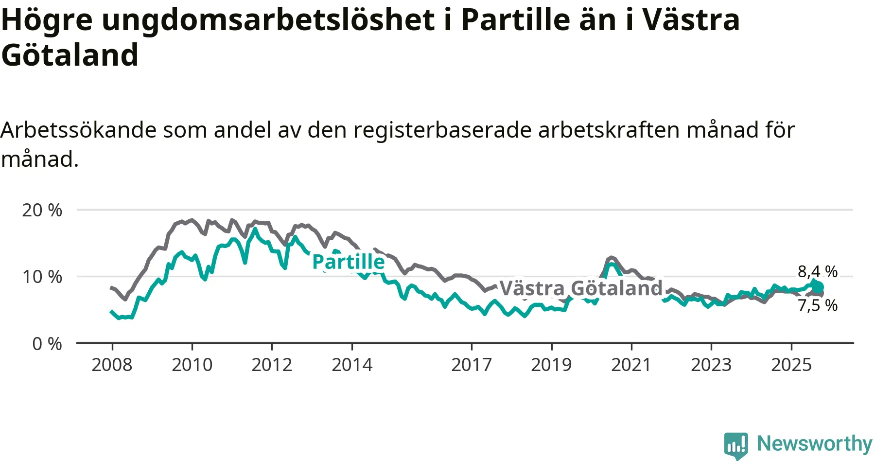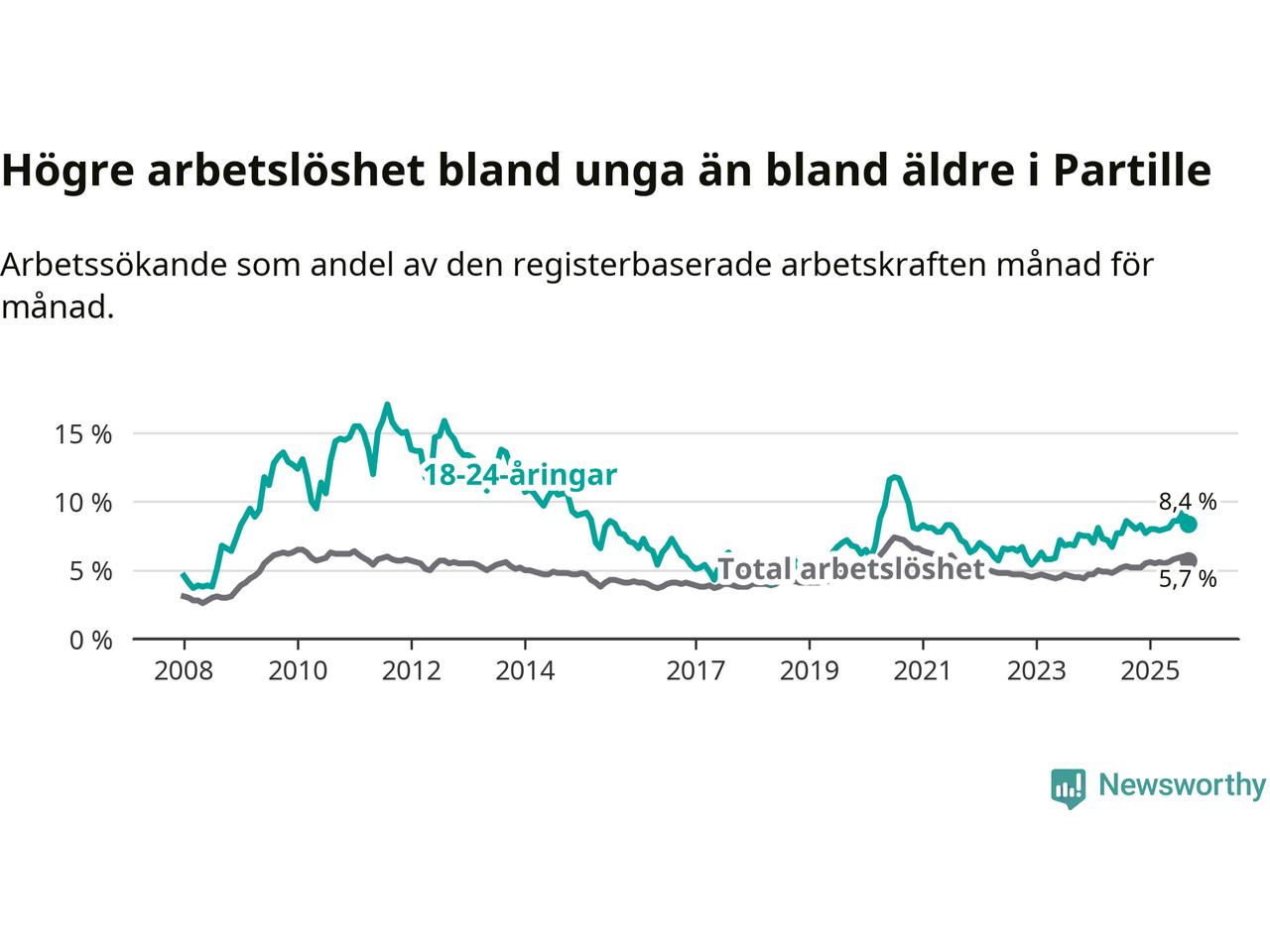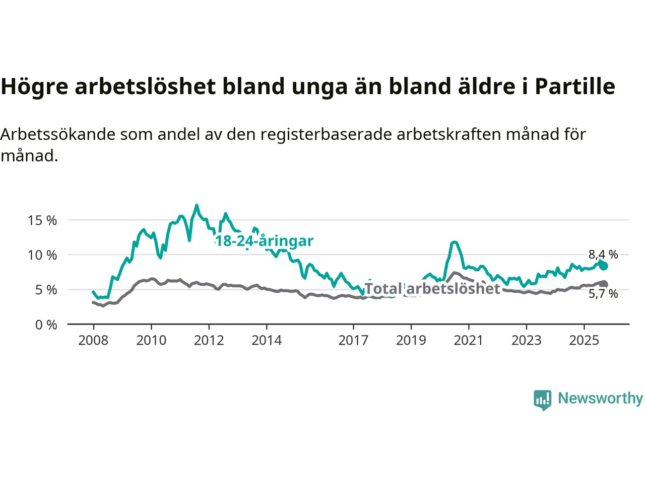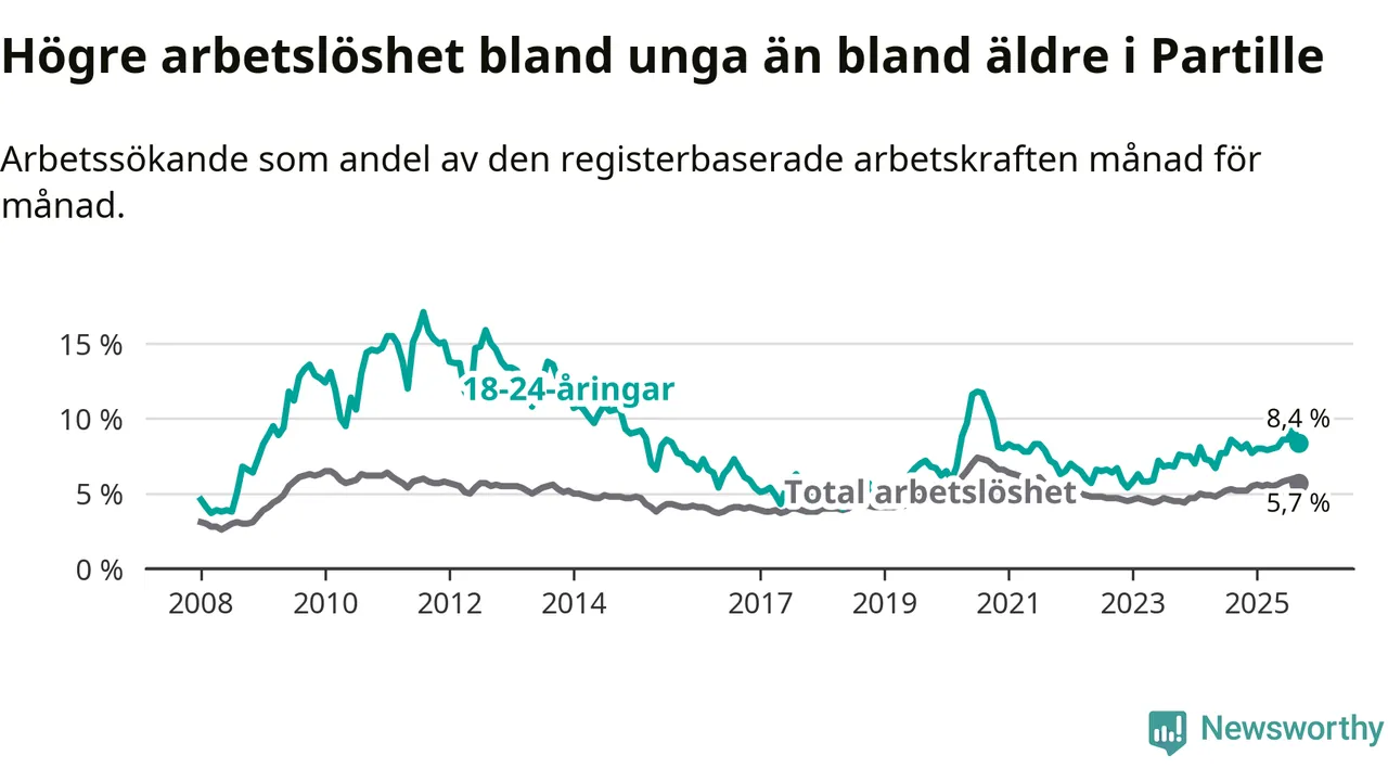 Medan Partille har lägre total arbetslöshet än Västra Götaland, ligger ungdomsarbetslösheten 0,9 procentenheter högre i Partille.