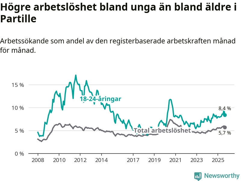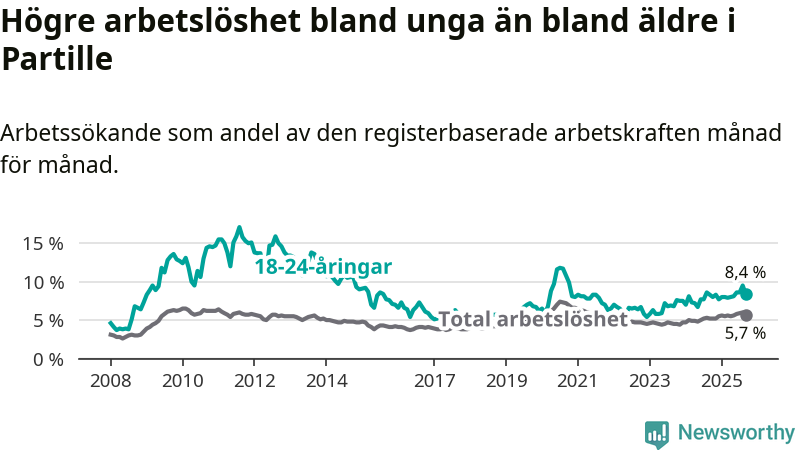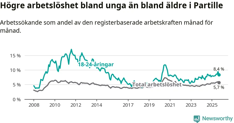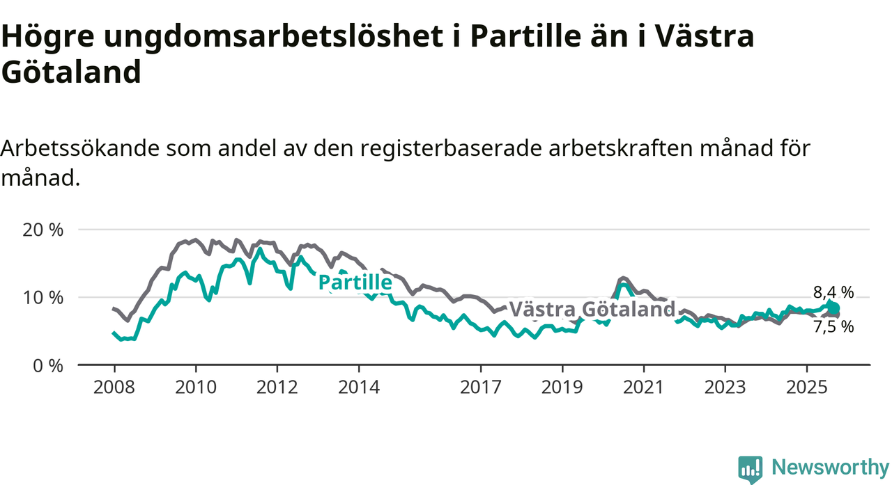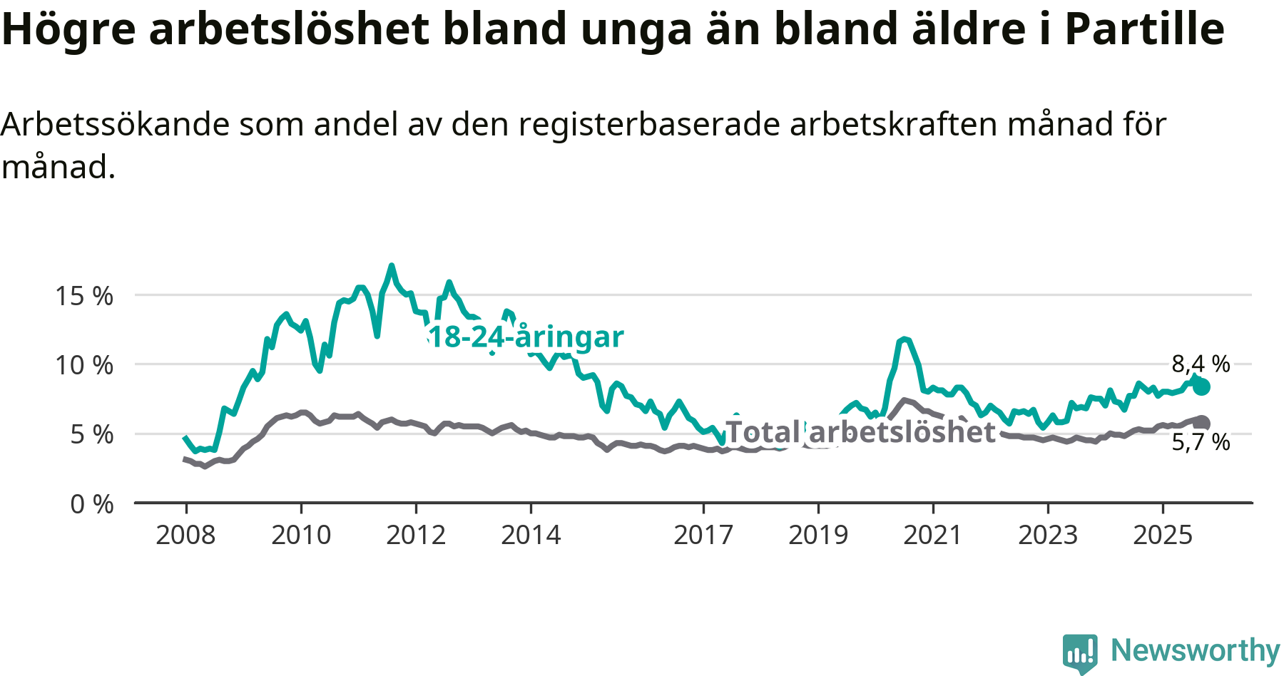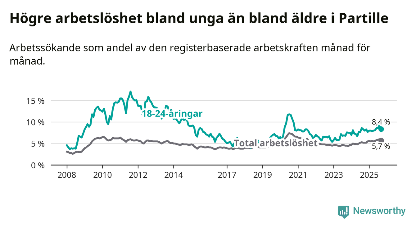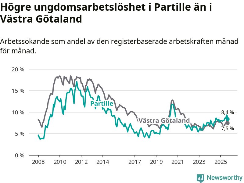 Medan Partille har lägre total arbetslöshet än Västra Götaland, ligger ungdomsarbetslösheten 0,9 procentenheter högre i Partille.