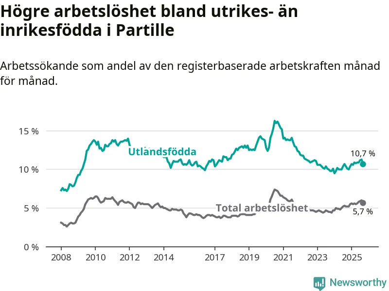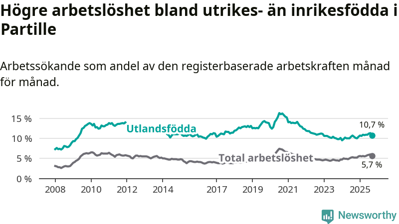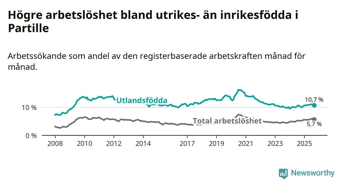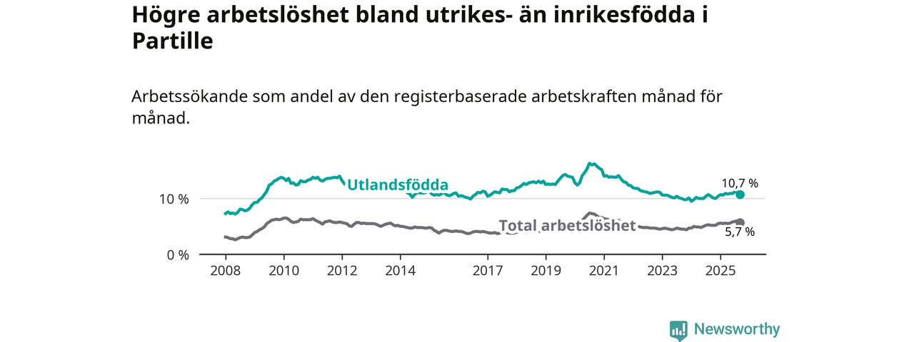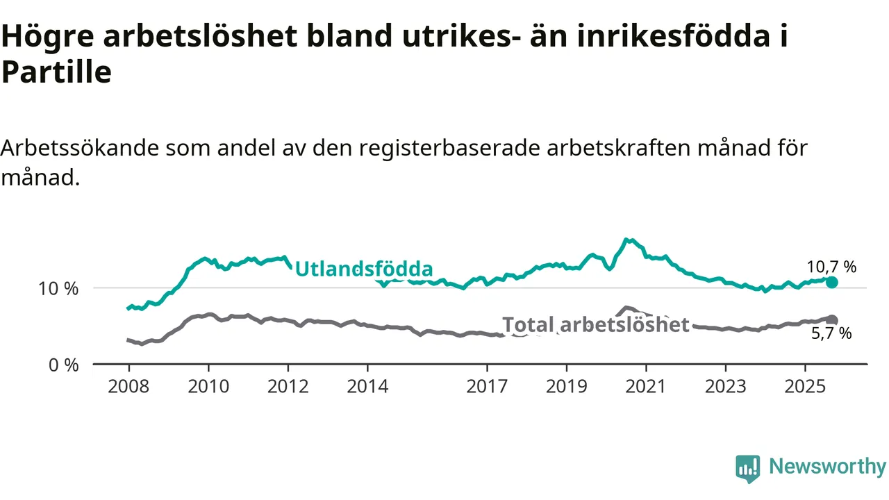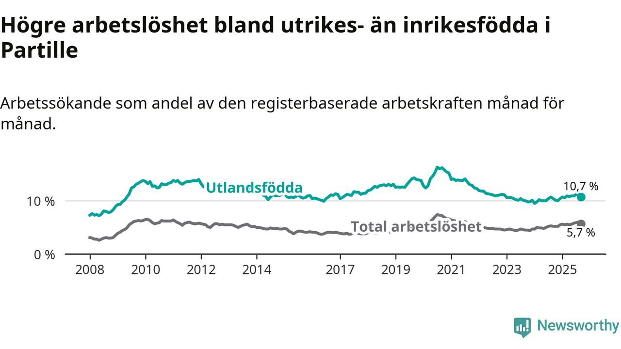 Arbetslösheten bland utlandsfödda var 10,7 procent i Partille under september månad, motsvarande 600 av 5 607 personer. Det är 0,3 procentenheter fler än vid samma tidpunkt i fjol (+29 om man räknar personer). Därmed är de utlandsföddas arbetslöshet högre än vid samma tidpunkt i fjol för 14:e månaden i följd.