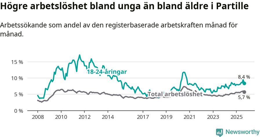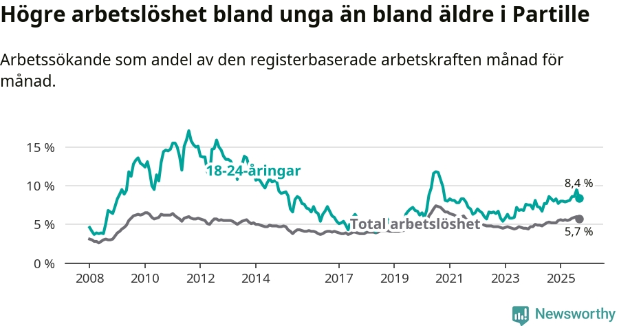 I och med den senaste månadens uppgång har de ungas arbetslöshet i Partille stigit sju månader i följd (upp från 8,0 procent i februari till 8,4 procent nu).