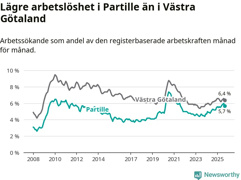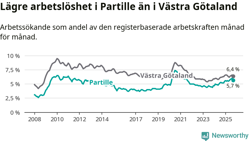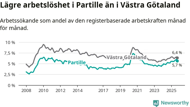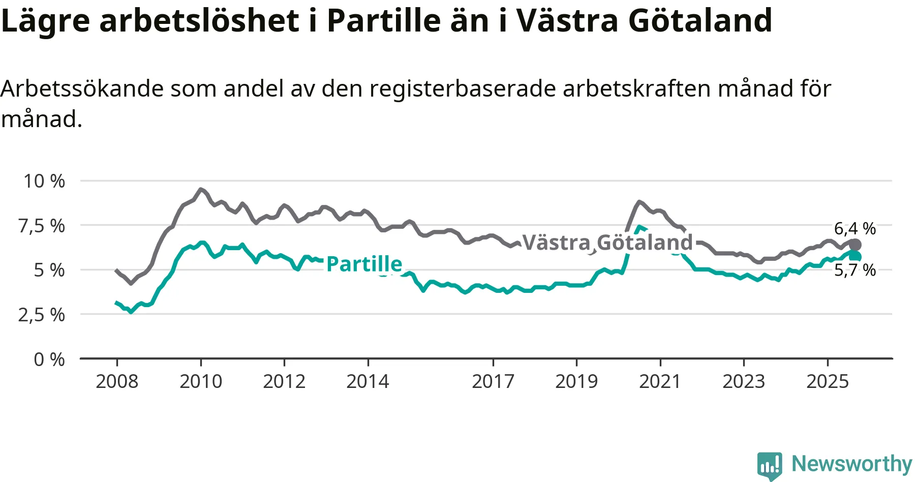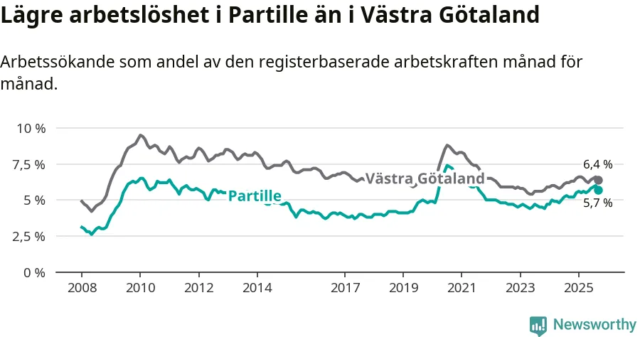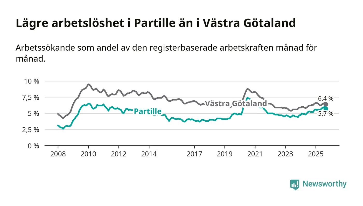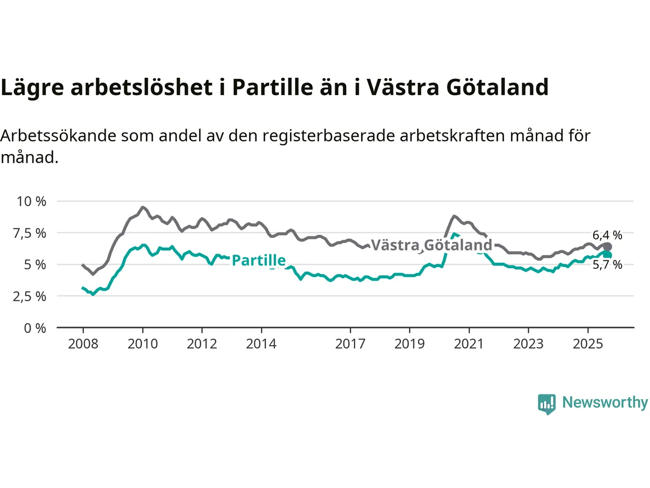 Även om arbetslösheten i Partille alltså ökar, så ligger den fortfarande under snittet i hela Västra Götalands län (5,7 procent i kommunen, jämfört med 6,4 procent i hela länet). Öckerö har den lägsta arbetslösheten i länet (2,7 procent), medan Gullspång har den högsta (8,5 procent). För att Partille skulle komma ner i samma arbetslöshetsnivå som Öckerö skulle 631 personer behöva sysselsättas.