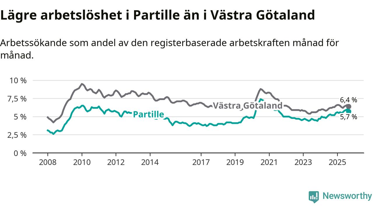 Under september månad rapporterade Partille kommun en total arbetslöshet på 5,7 procent. Det är en ökning jämfört med samma tidpunkt i fjol (+0,5 procentenheter). Även i Västra Götalands län stiger arbetslösheten .