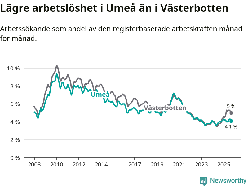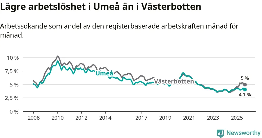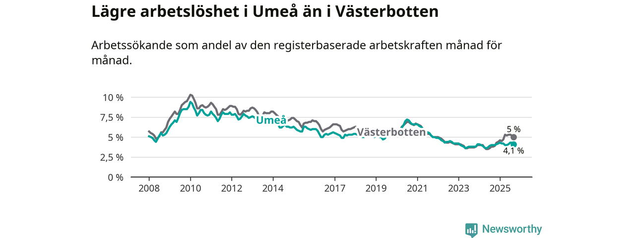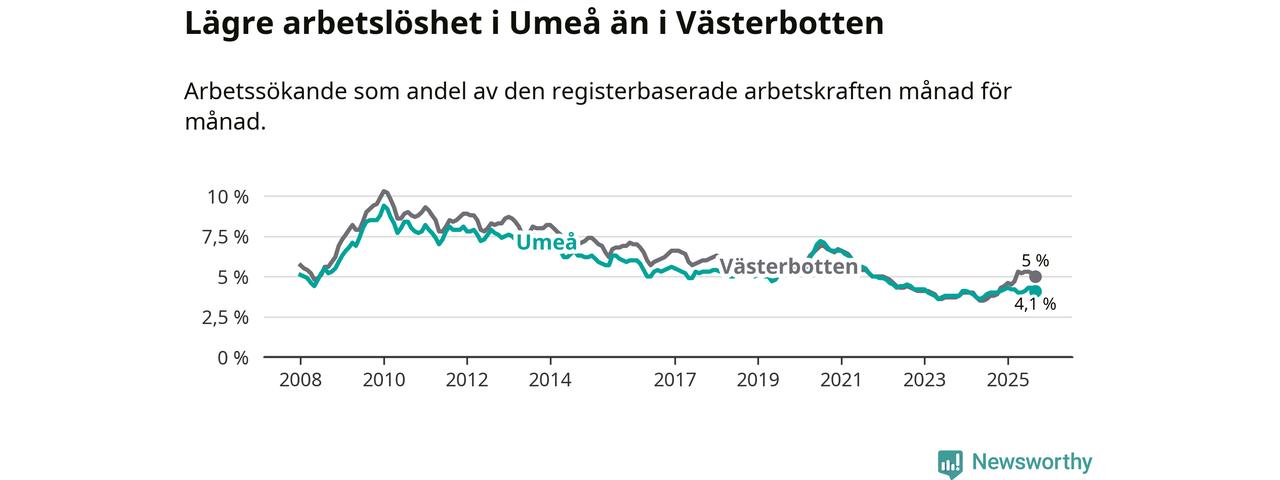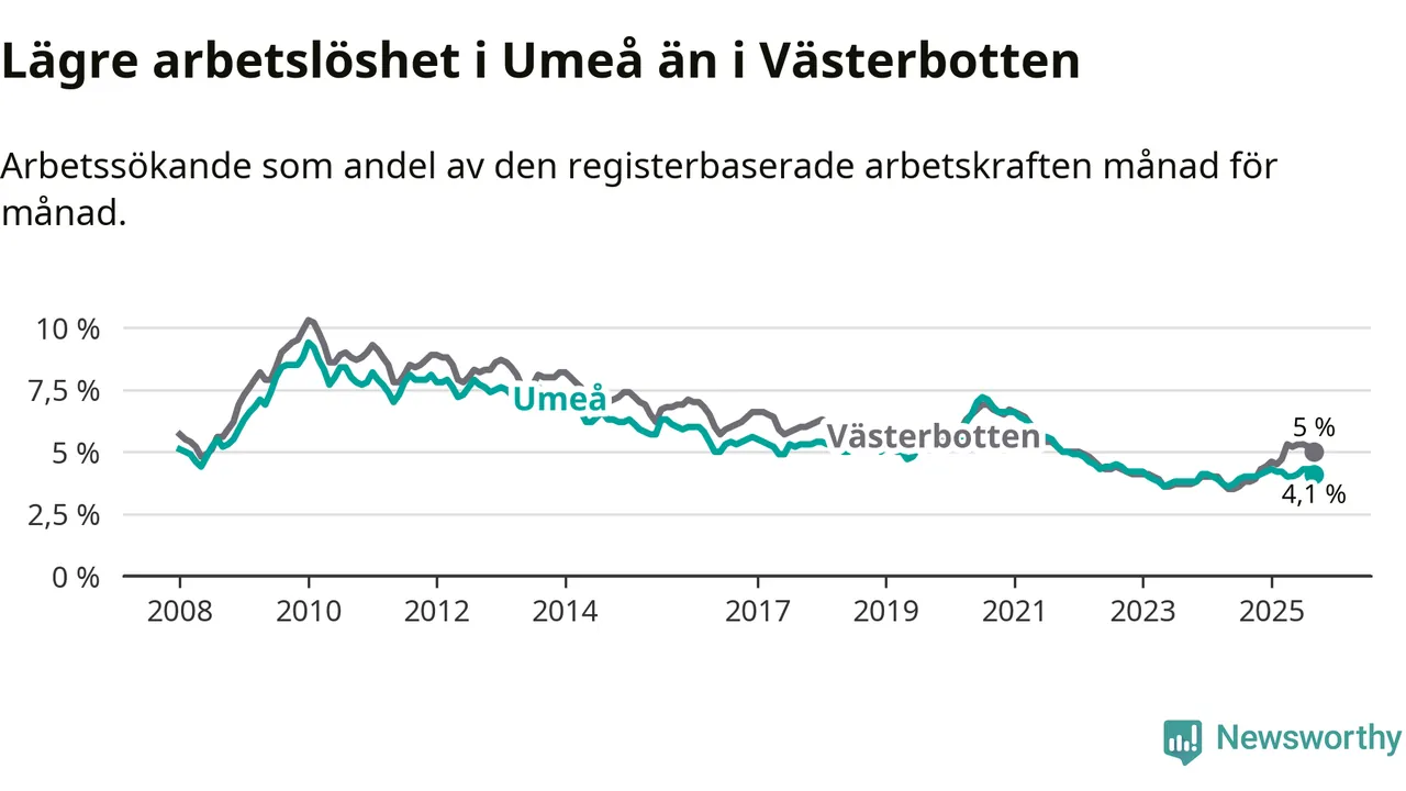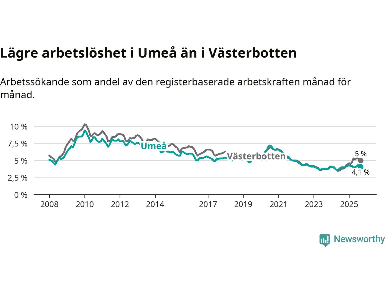 Även om arbetslösheten i Umeå alltså ökar, så ligger den fortfarande under snittet i hela Västerbottens län (4,1 procent i kommunen, jämfört med 5,0 procent i hela länet). Vindeln har den lägsta arbetslösheten i länet (3,2 procent), medan Skellefteå har den högsta (7,0 procent). För att Umeå skulle komma ner i samma arbetslöshetsnivå som Vindeln skulle 635 personer behöva sysselsättas.