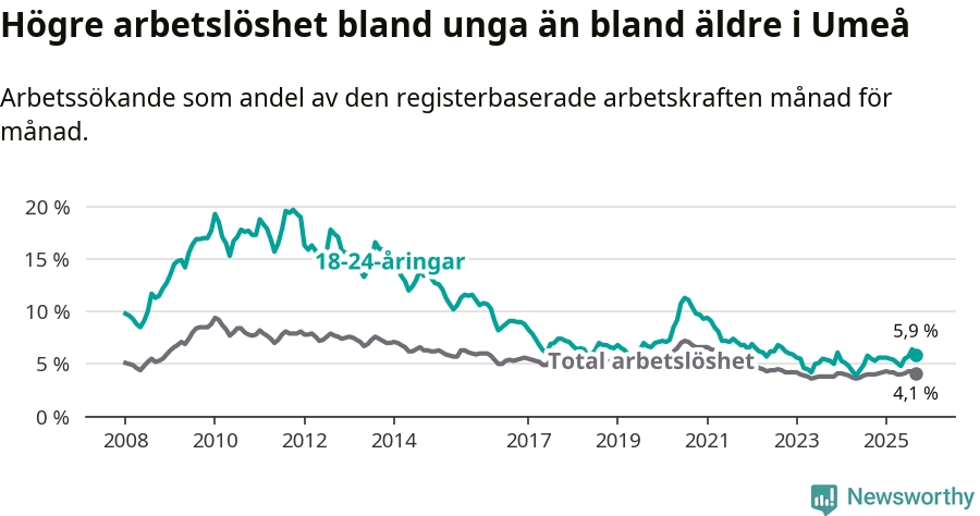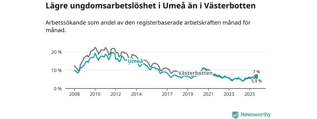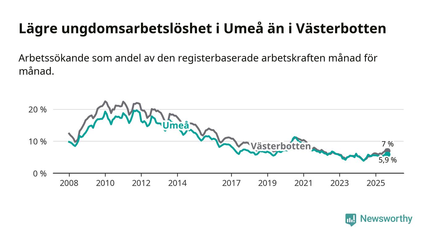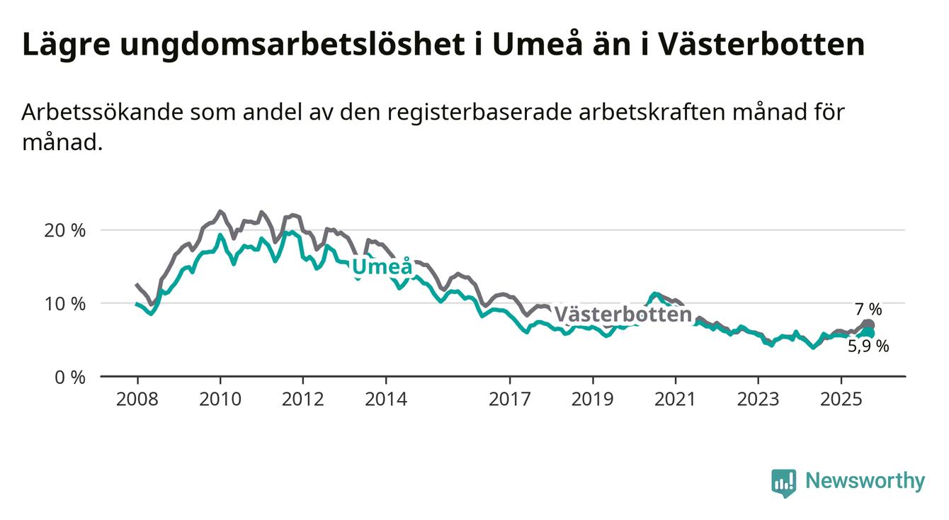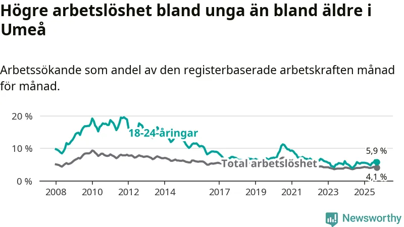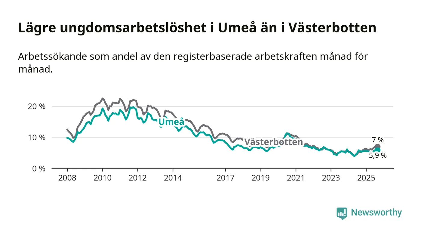 I och med den senaste månadens uppgång har de ungas arbetslöshet i Umeå stigit nio månader i följd (upp från 5,6 procent i december 2024 till 5,9 procent nu).