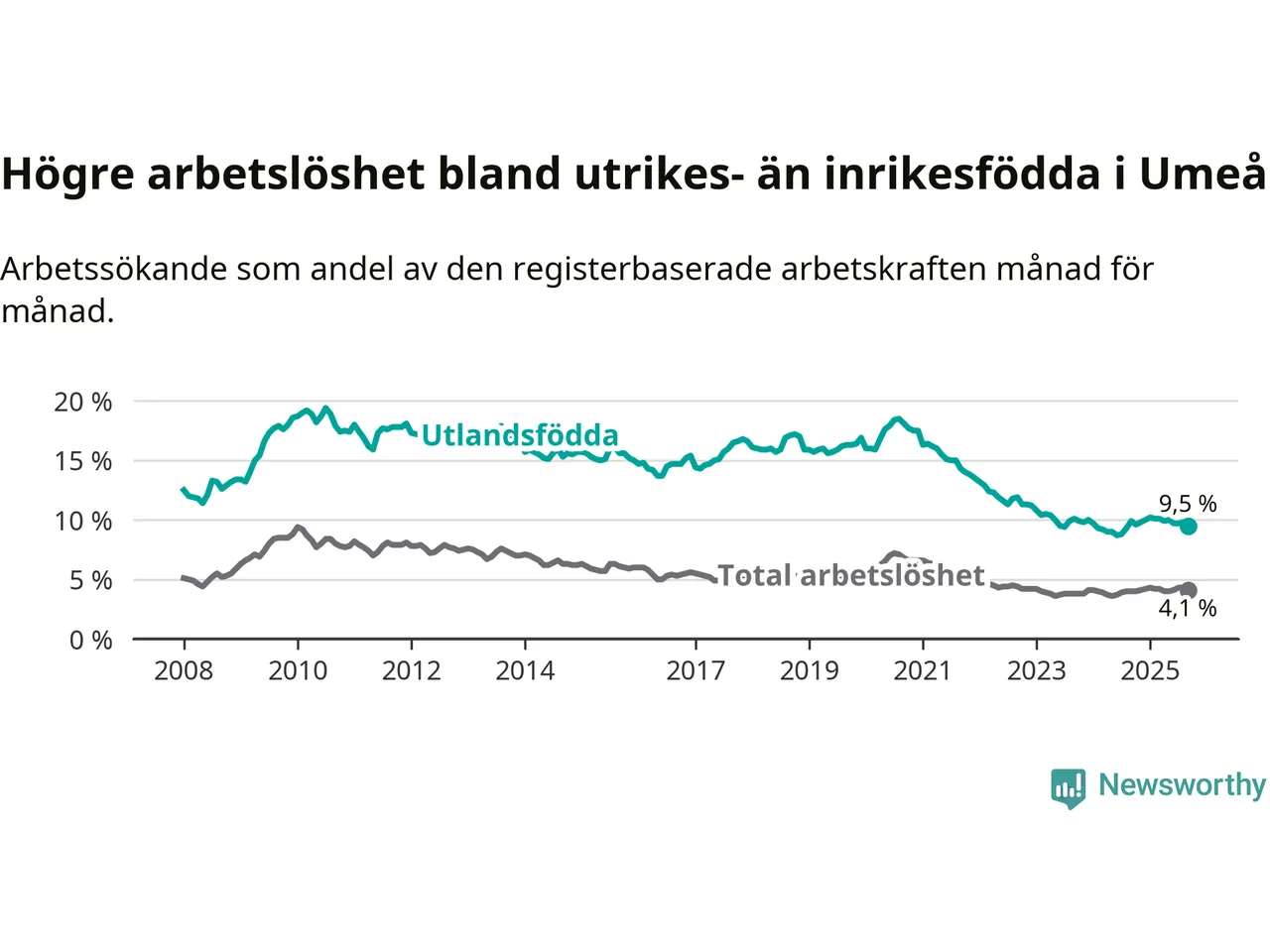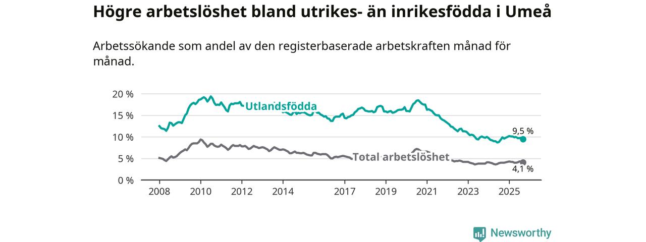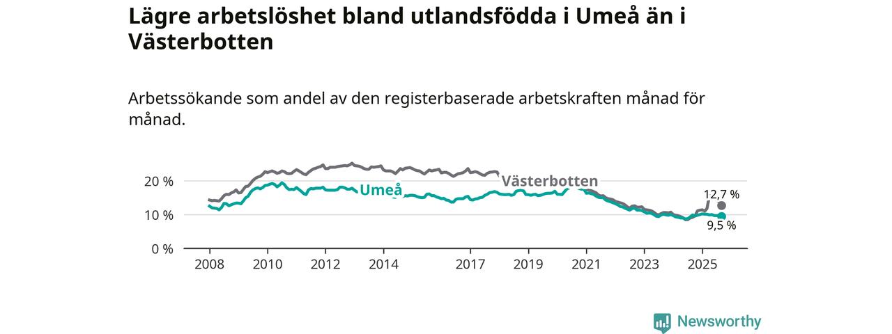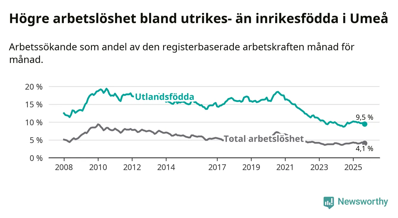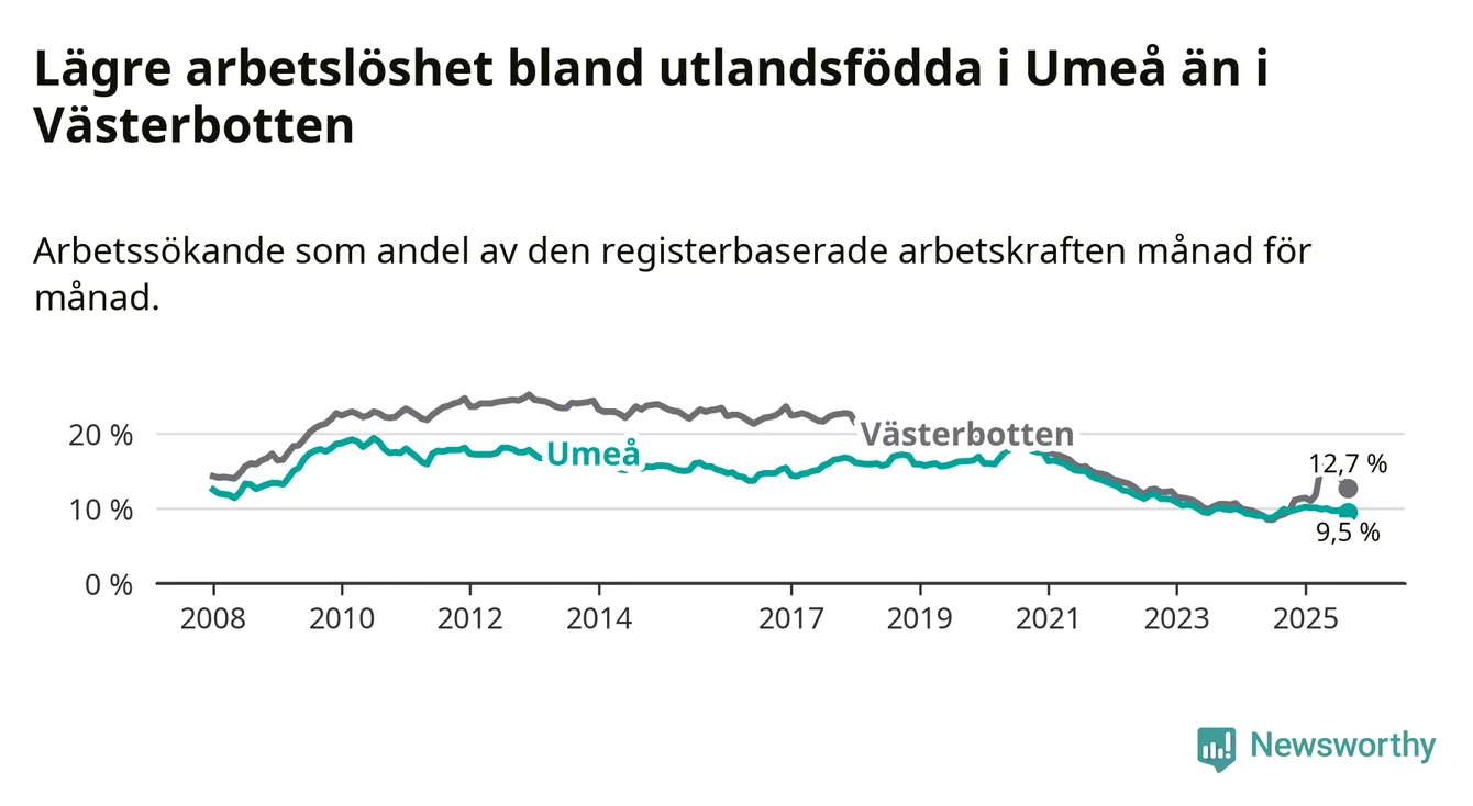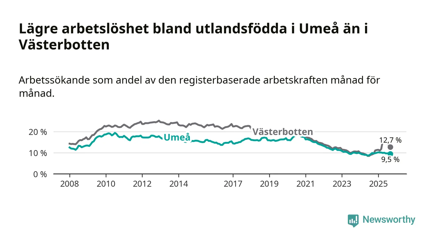 Arbetslösheten bland utlandsfödda var 9,5 procent i Umeå under september månad, motsvarande 1 055 av 11 105 personer. Det är 0,4 procentenheter färre än vid samma tidpunkt i fjol (−10 om man räknar personer). Den senaste månadens nedgång innebär ett trendbrott. Under de åtta föregående månaderna hade arbetslösheten bland utlandsfödda varit högre än motsvarande tidpunkt året innan.