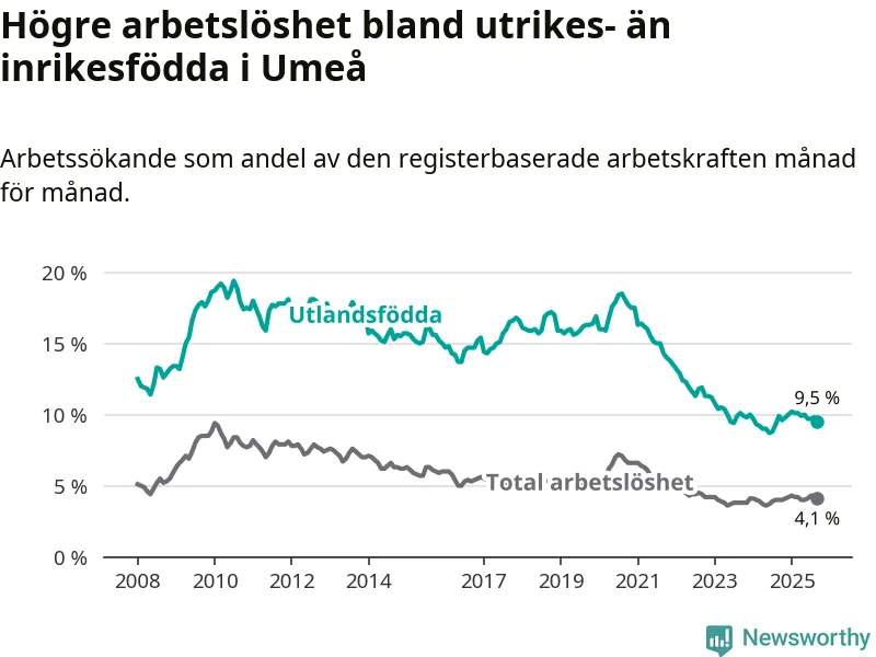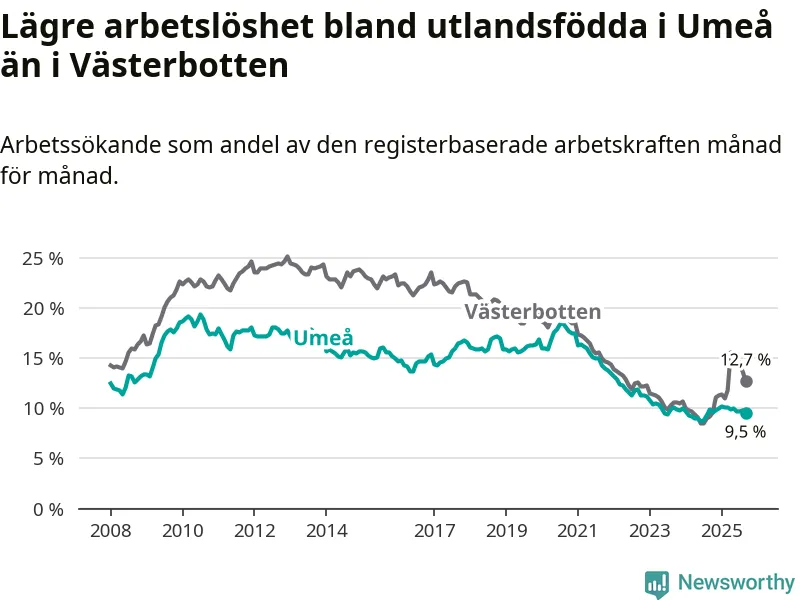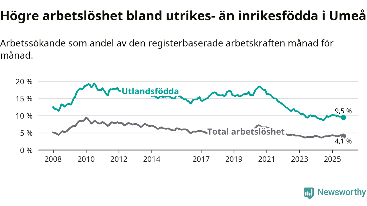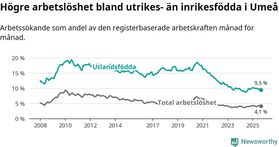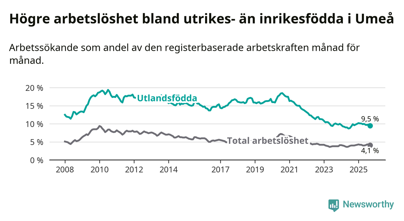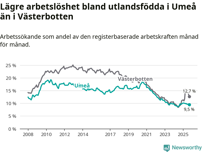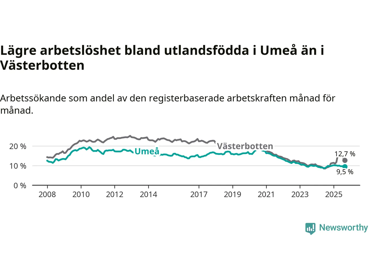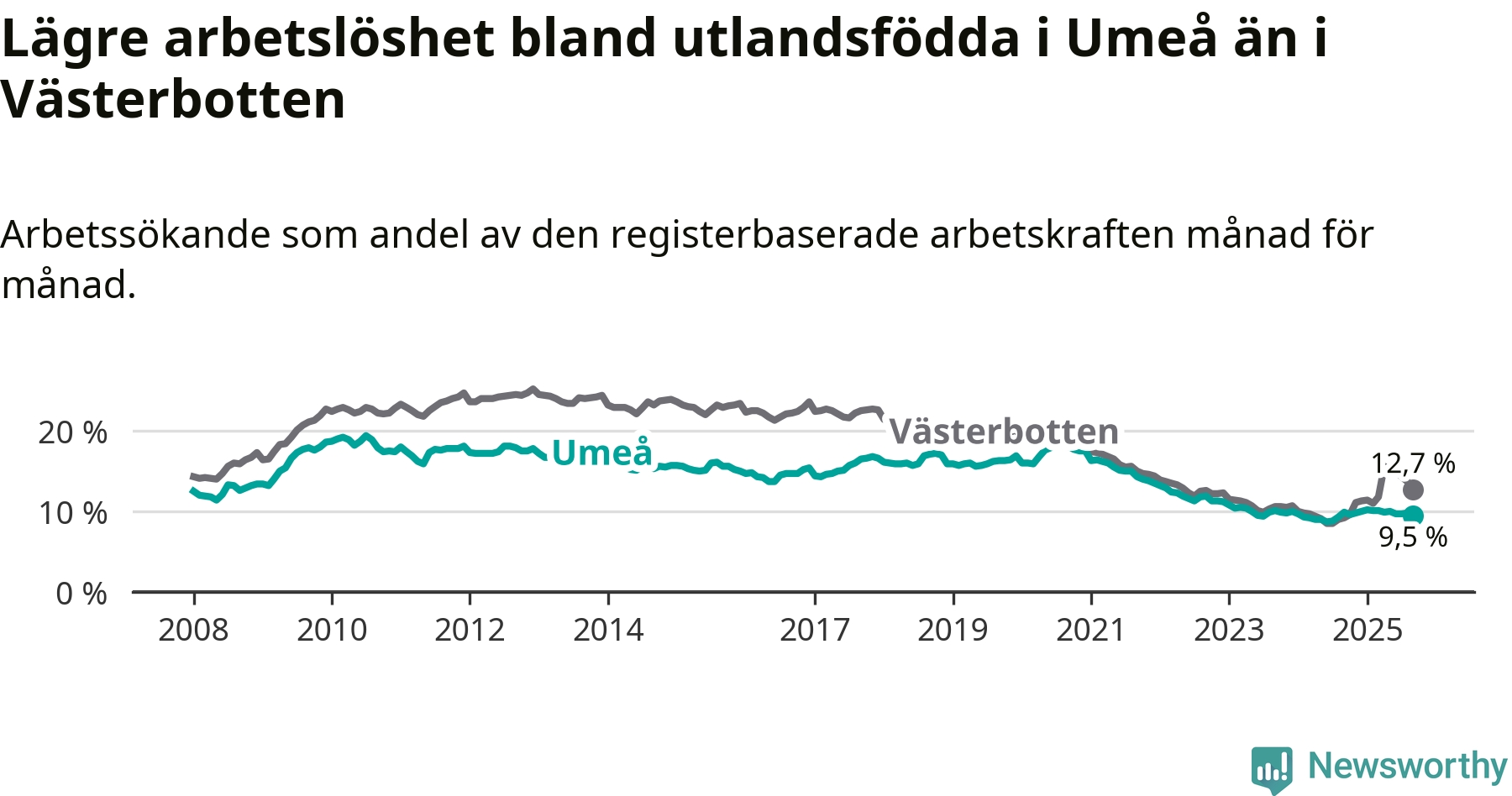 Arbetslösheten bland utlandsfödda var 9,5 procent i Umeå under september månad, motsvarande 1 055 av 11 105 personer. Det är 0,4 procentenheter färre än vid samma tidpunkt i fjol (−10 om man räknar personer). Den senaste månadens nedgång innebär ett trendbrott. Under de åtta föregående månaderna hade arbetslösheten bland utlandsfödda varit högre än motsvarande tidpunkt året innan.