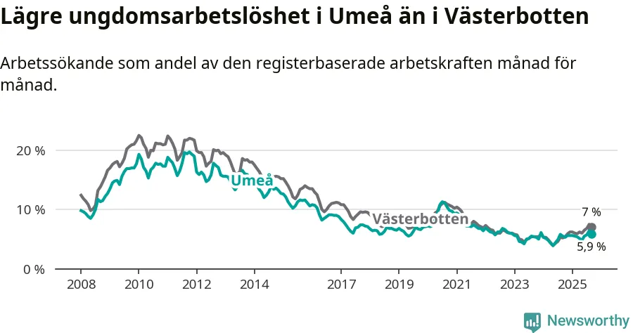 Precis som den totala arbetslösheten ligger ungdomsarbetslösheten i Umeå lägre än i Västerbotten som helhet. Skillnaden mellan kommunen och länet är 1,1 procentenheter.