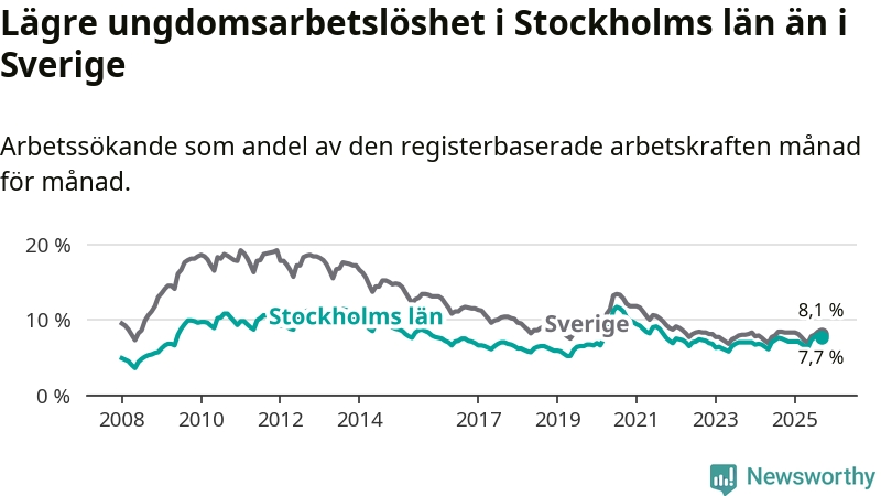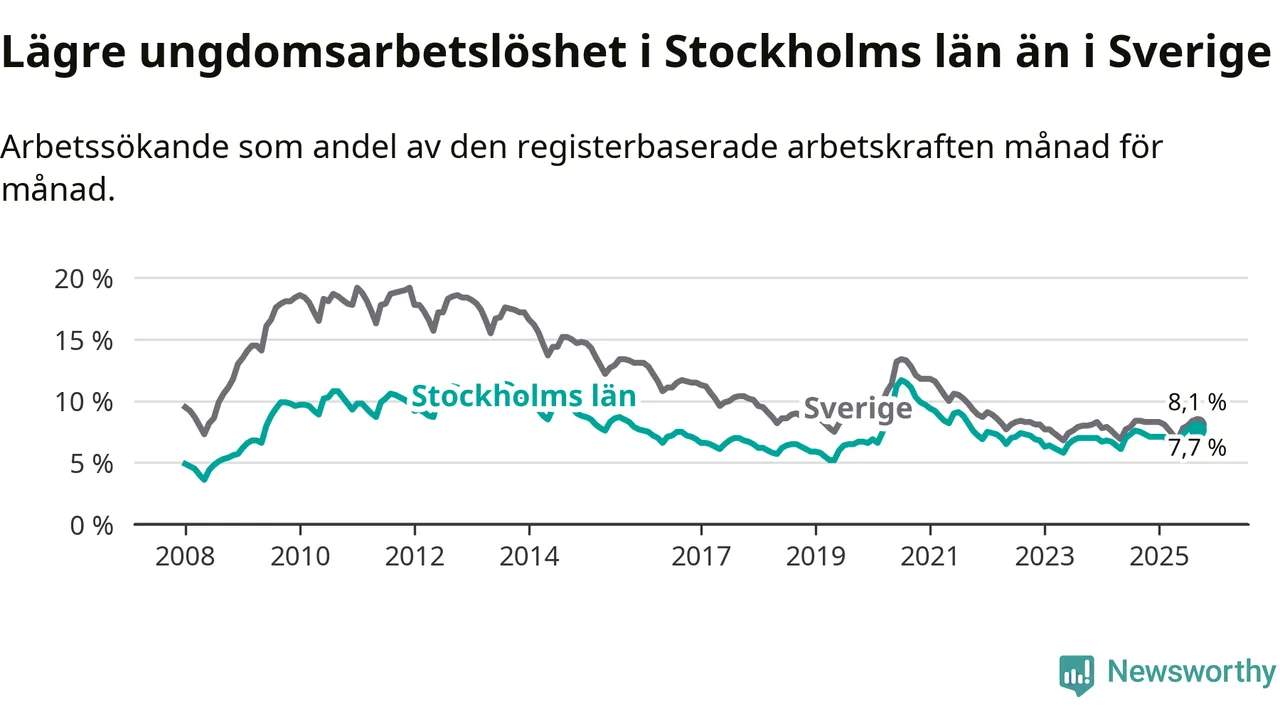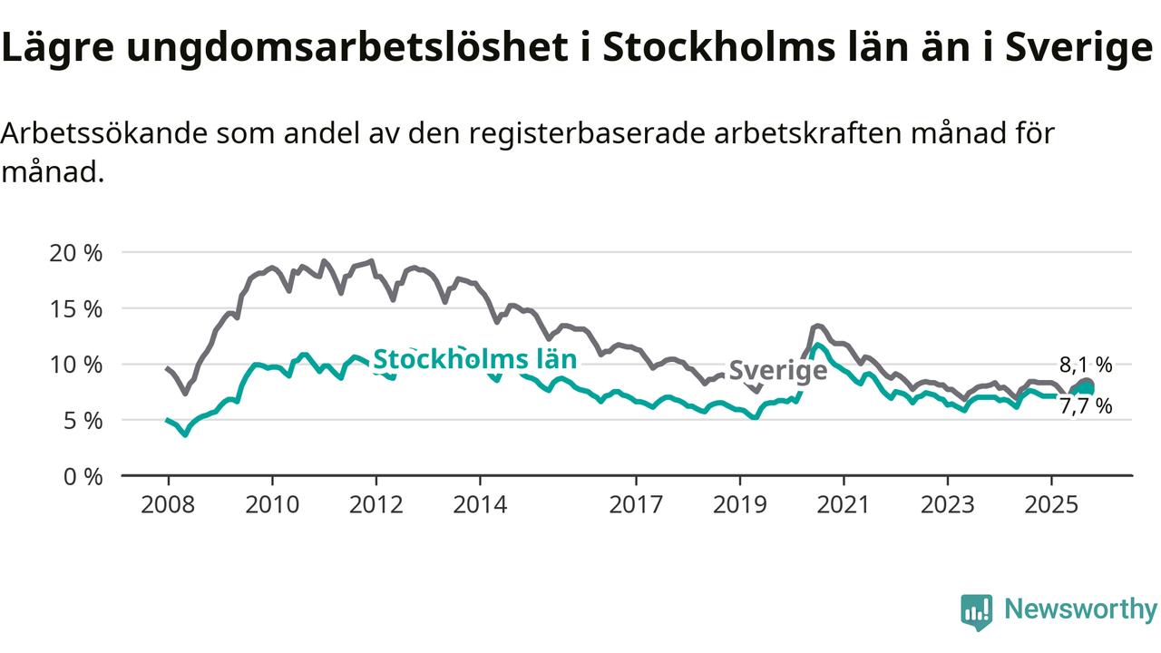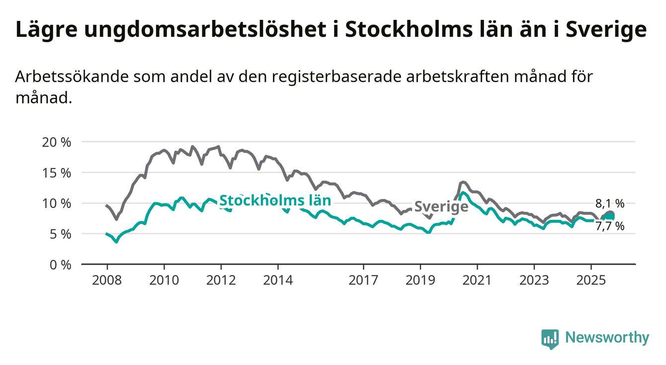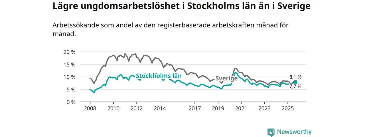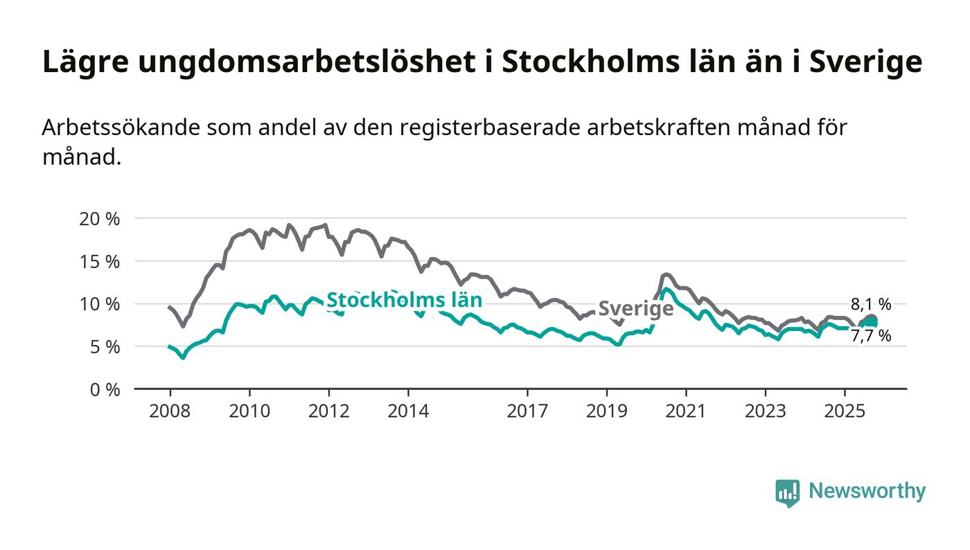 Medan Stockholms län har högre total arbetslöshet än Sverige, ligger ungdomsarbetslösheten 0,4 procentenheter lägre i Stockholm.
