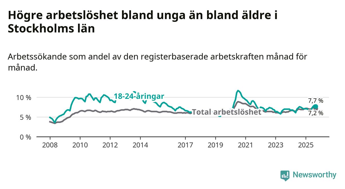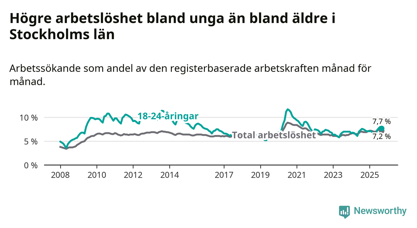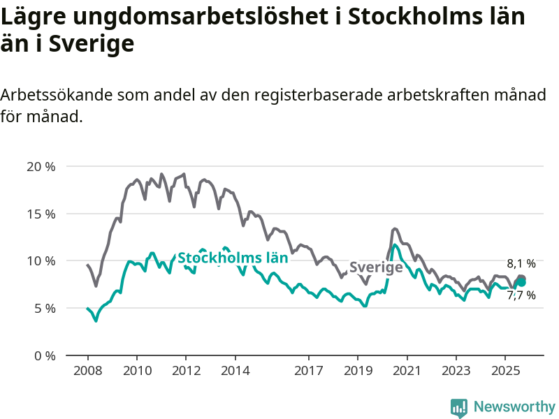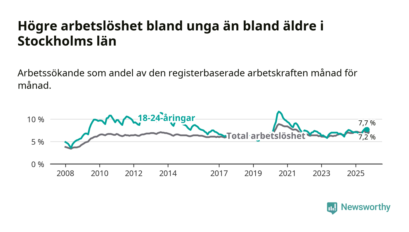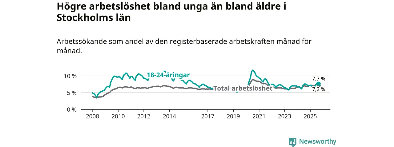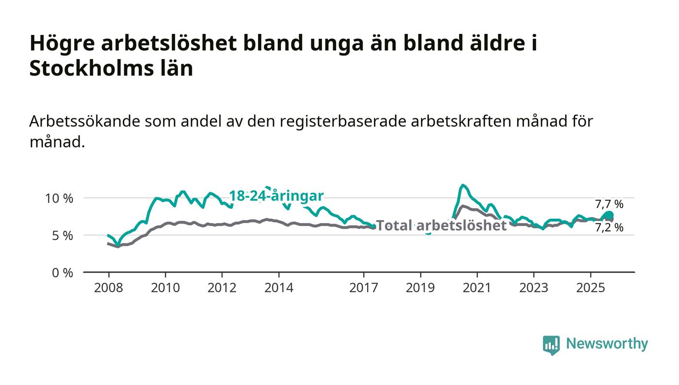 Medan Stockholms län har högre total arbetslöshet än Sverige, ligger ungdomsarbetslösheten 0,4 procentenheter lägre i Stockholm.