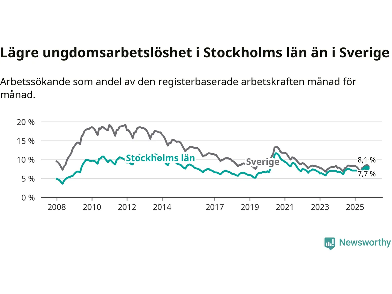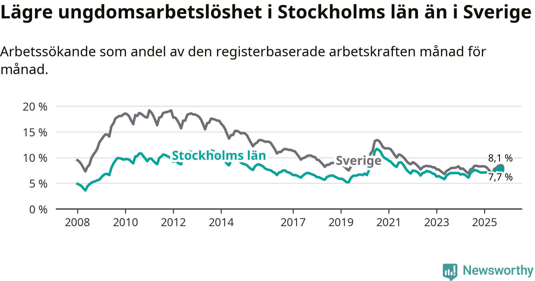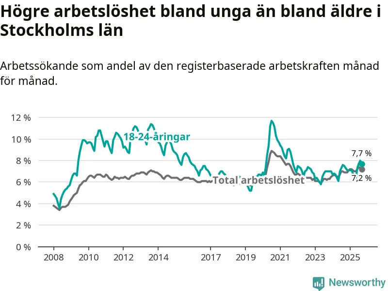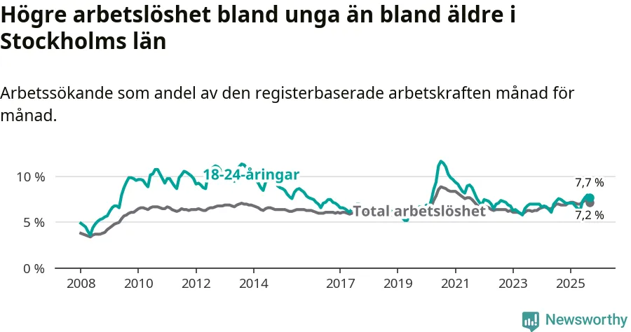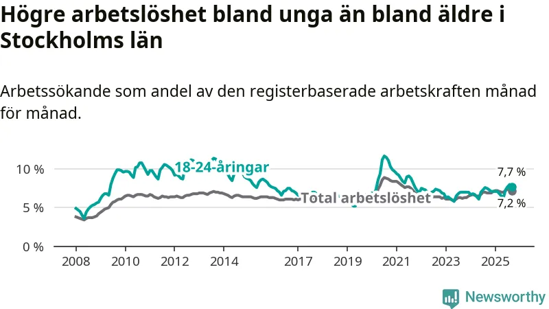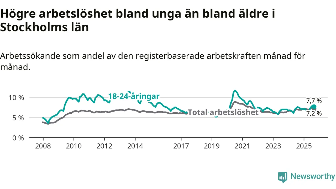Medan Stockholms län har högre total arbetslöshet än Sverige, ligger ungdomsarbetslösheten 0,4 procentenheter lägre i Stockholm.
