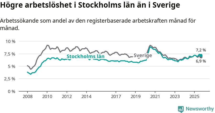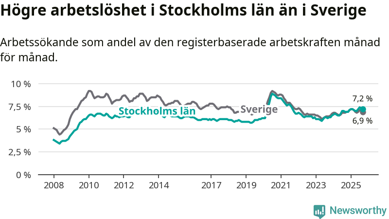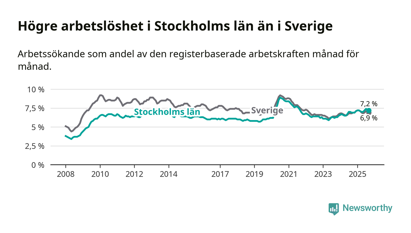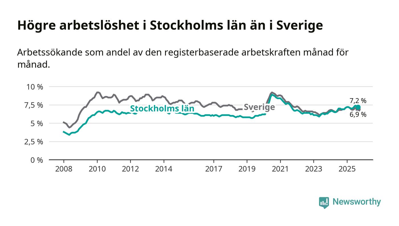 Stockholms län hade redan tidigare högre arbetslöshet än snittet i hela Sverige och nu växer klyftan (7,2 procent i länet, jämfört med 6,9 procent i hela riket). Norrbotten har den lägsta arbetslösheten i riket (3,8 procent), medan Skåne har den högsta (8,9 procent). För att Stockholms län skulle komma ner i samma arbetslöshetsnivå som Norrbotten skulle 43 689 personer behöva sysselsättas.