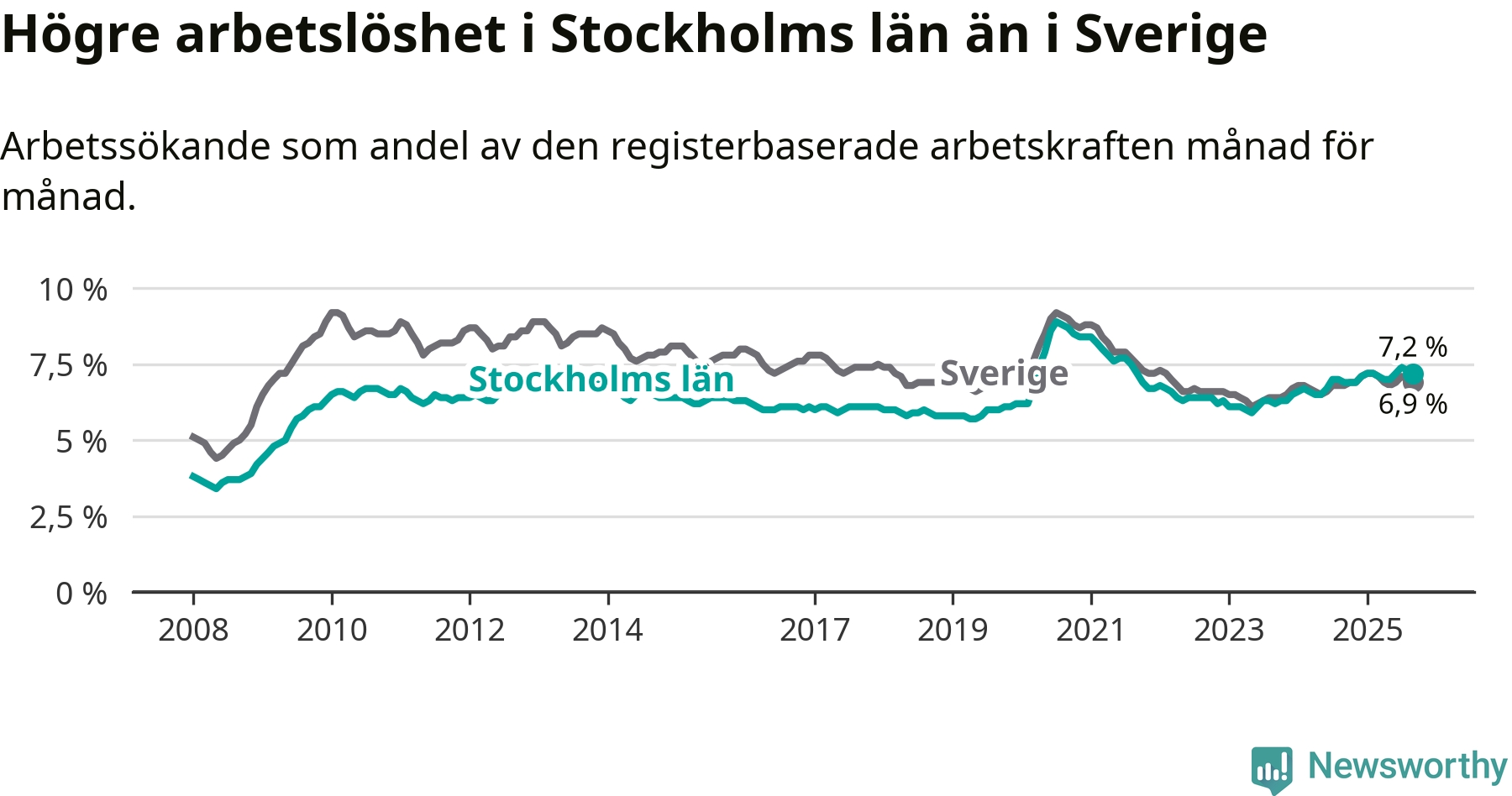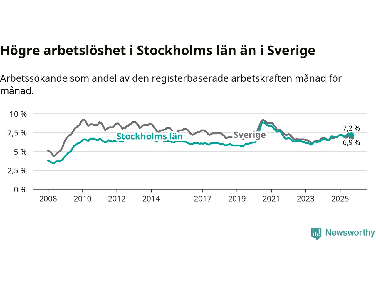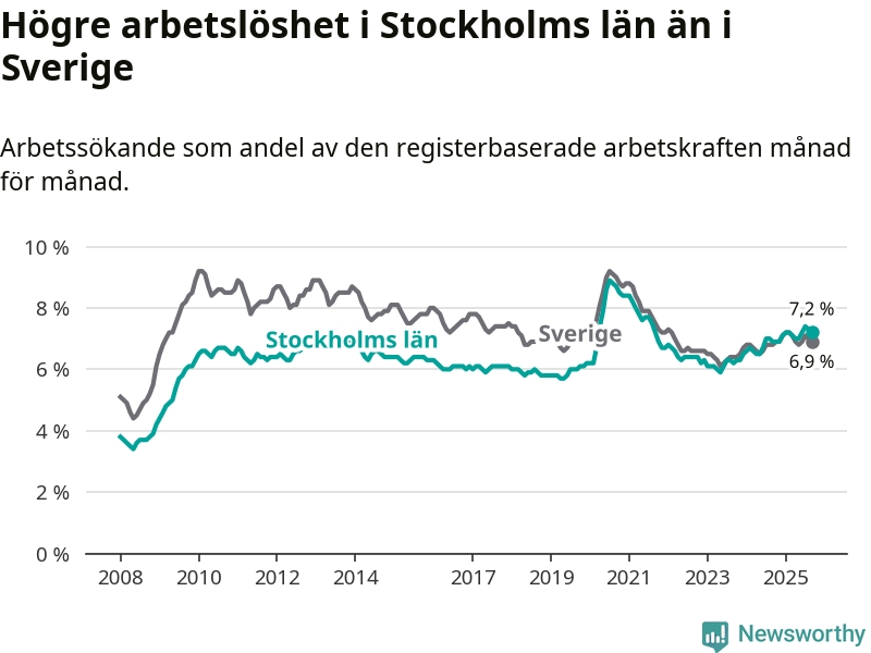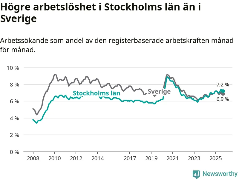 Stockholms län hade redan tidigare högre arbetslöshet än snittet i hela Sverige och nu växer klyftan (7,2 procent i länet, jämfört med 6,9 procent i hela riket). Norrbotten har den lägsta arbetslösheten i riket (3,8 procent), medan Skåne har den högsta (8,9 procent). För att Stockholms län skulle komma ner i samma arbetslöshetsnivå som Norrbotten skulle 43 689 personer behöva sysselsättas.