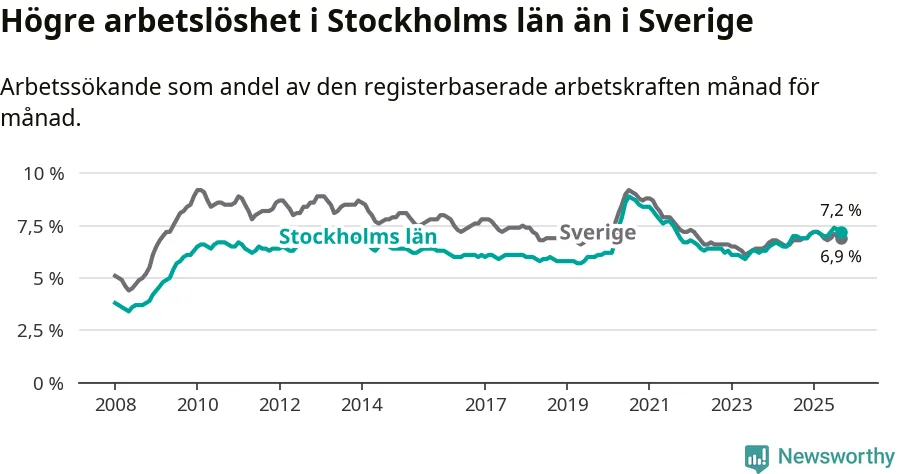 Under september månad rapporterade Stockholms län en total arbetslöshet på 7,2 procent. Det är en ökning jämfört med samma tidpunkt i fjol (+0,3 procentenheter). Även i Sverige stiger arbetslösheten något.