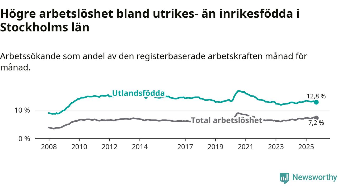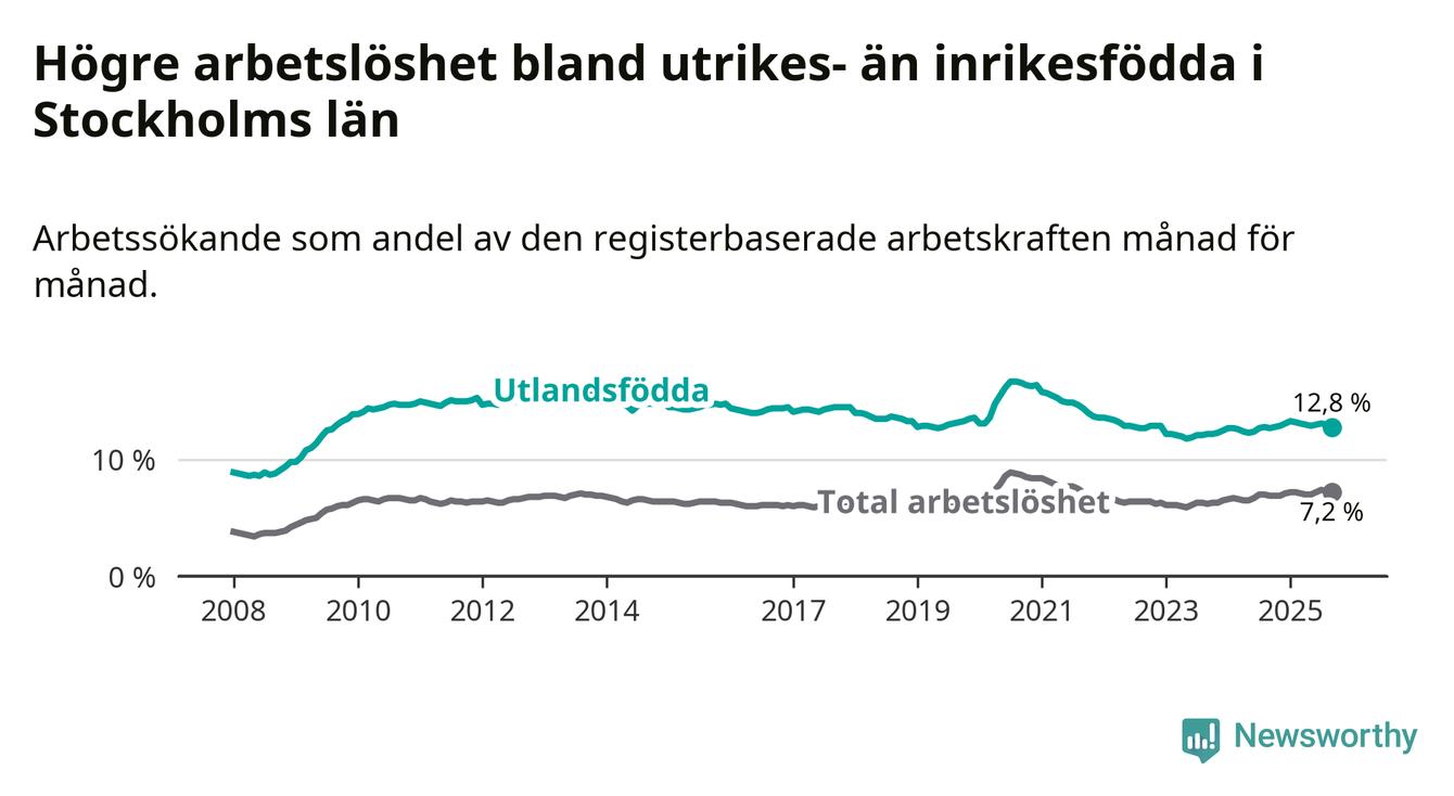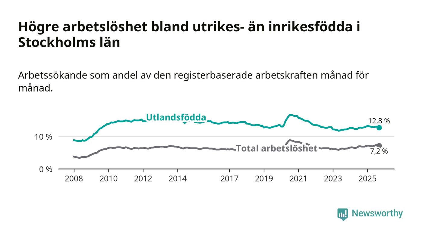 Arbetslösheten bland utlandsfödda var 12,8 procent i Stockholm under september månad, motsvarande 53 209 av 415 695 personer. Det är 0,1 procentenheter fler än vid samma tidpunkt i fjol (+934 om man räknar personer). Därmed är de utlandsföddas arbetslöshet högre än vid samma tidpunkt i fjol för 21:a månaden i följd.