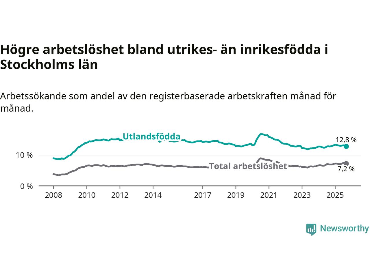 Graf: Skillnad i arbetslöshet mellan utrikesfödda och hela befolkningen i Stockholms län