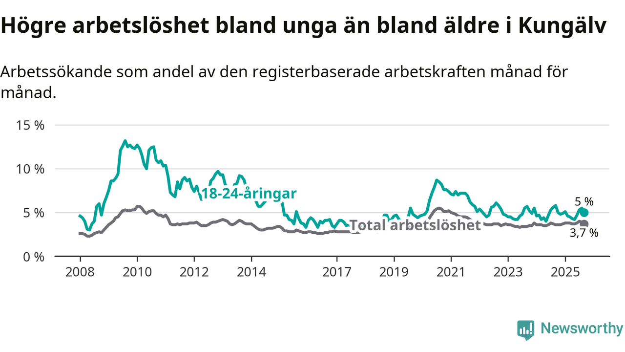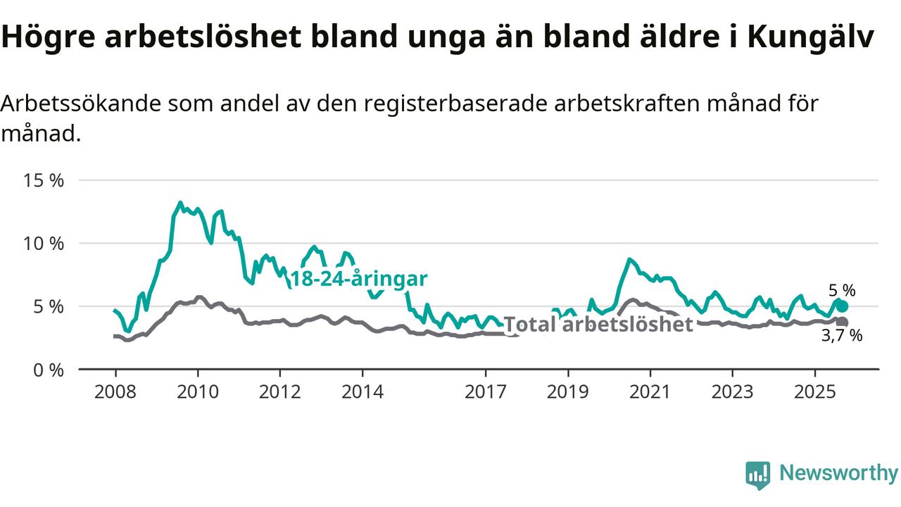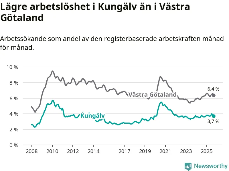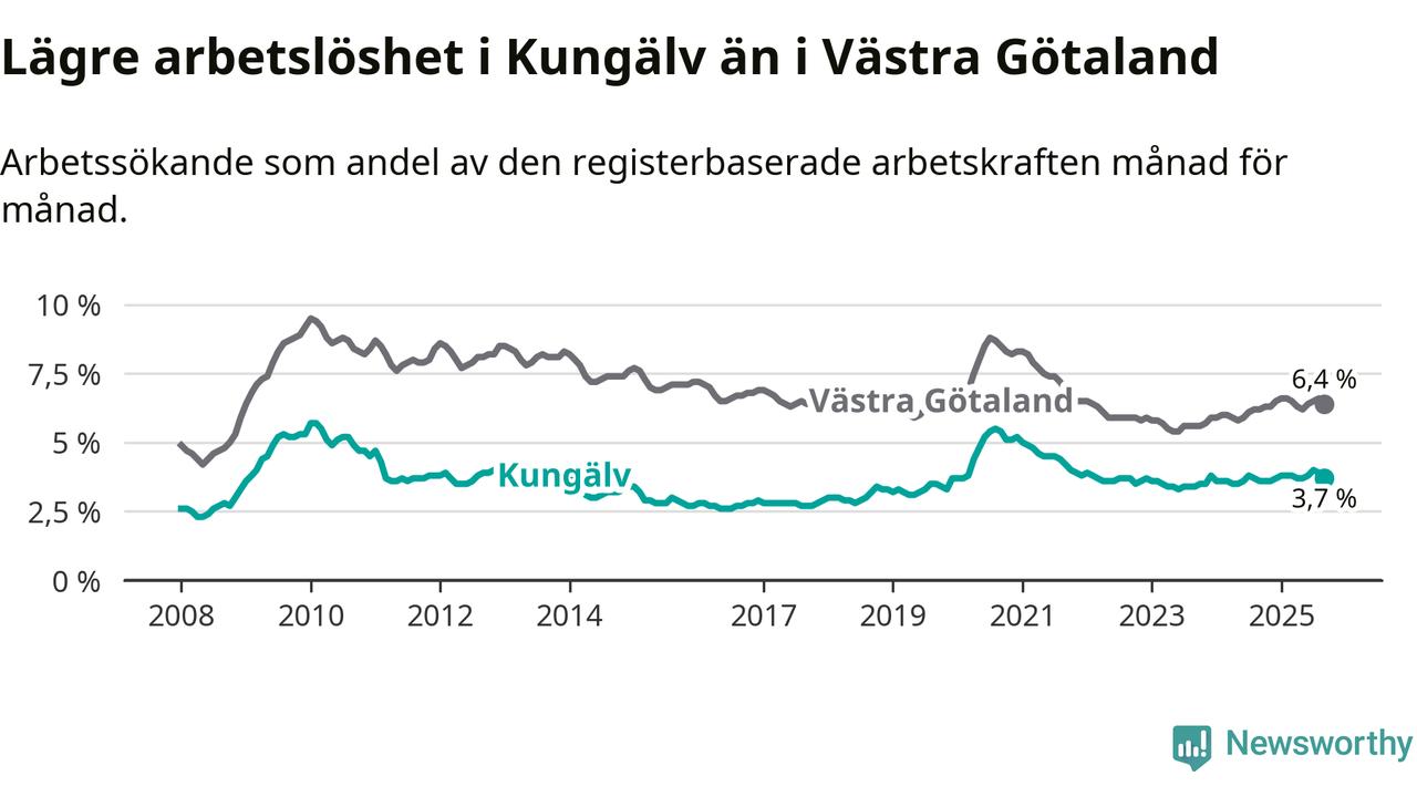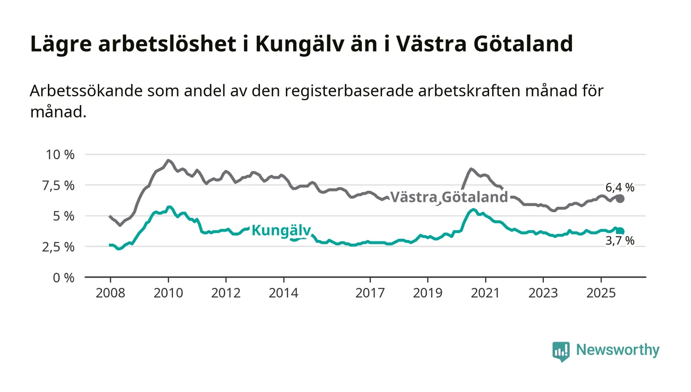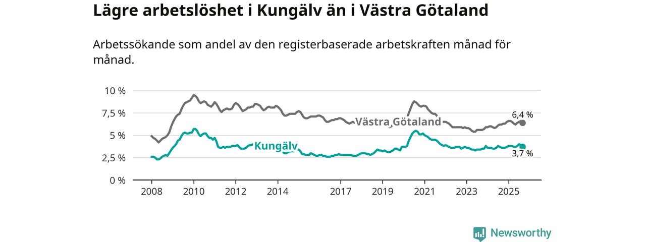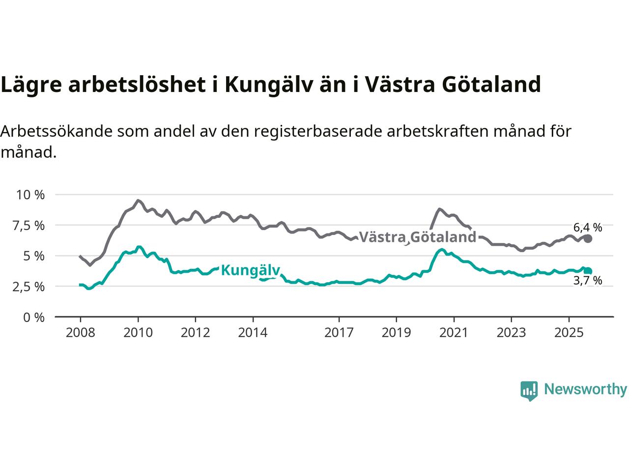 Under september månad rapporterade Kungälvs kommun en total arbetslöshet på 3,7 procent. Det är en ökning jämfört med samma tidpunkt i fjol (+0,1 procentenheter). Även i Västra Götalands län stiger arbetslösheten .