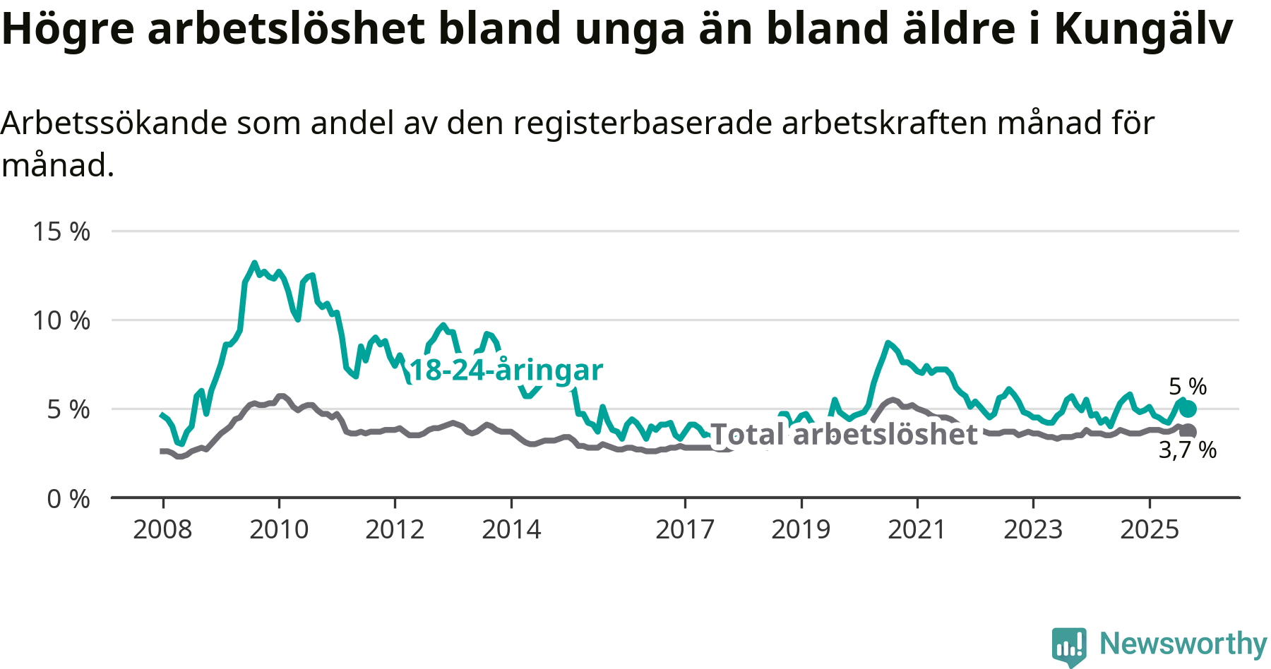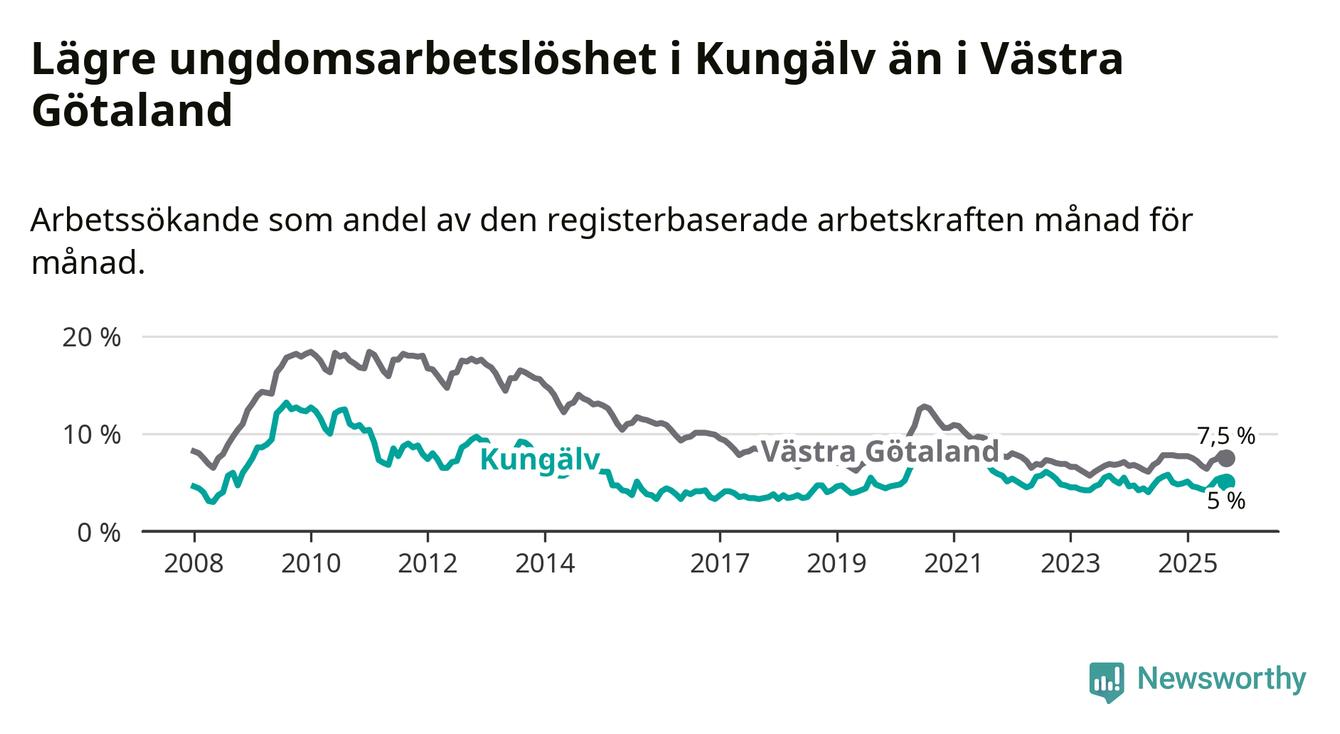 Precis som den totala arbetslösheten ligger ungdomsarbetslösheten i Kungälv lägre än i Västra Götaland som helhet. Skillnaden mellan kommunen och länet är 2,5 procentenheter.