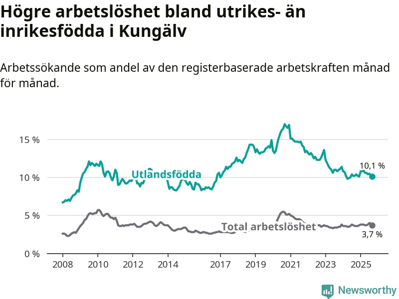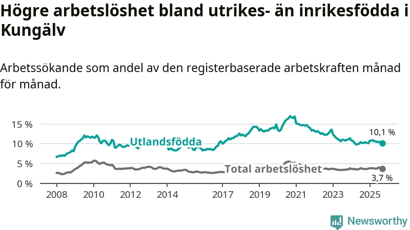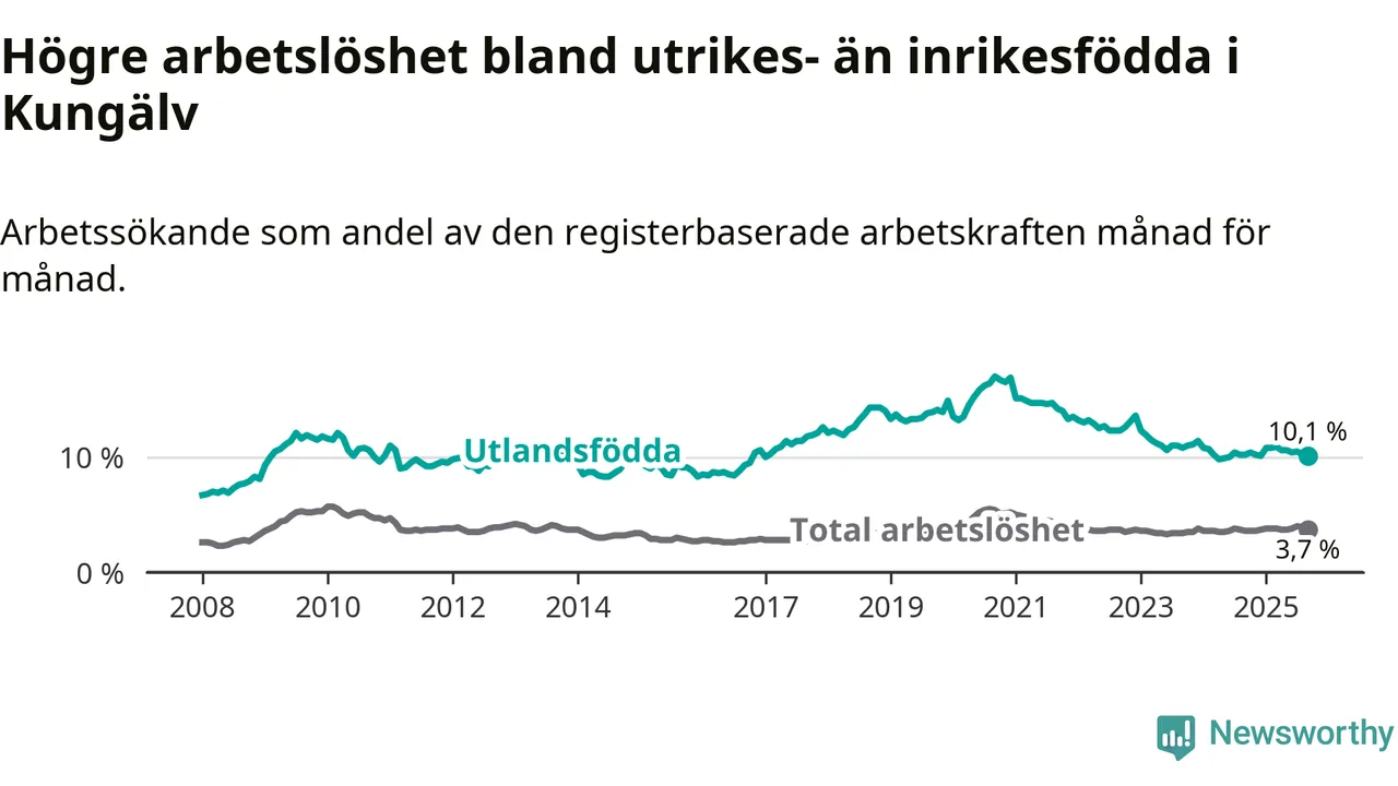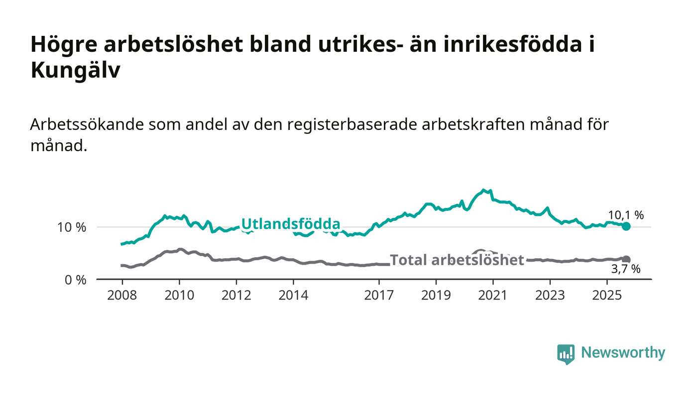 Arbetslösheten bland utlandsfödda var 10,1 procent i Kungälv under september månad, motsvarande 353 av 3 495 personer. Det är 0,1 procentenheter färre än vid samma tidpunkt i fjol (+1 om man räknar personer). Den senaste månadens nedgång innebär ett trendbrott. Under de ett föregående månaderna hade arbetslösheten bland utlandsfödda varit högre än motsvarande tidpunkt året innan.