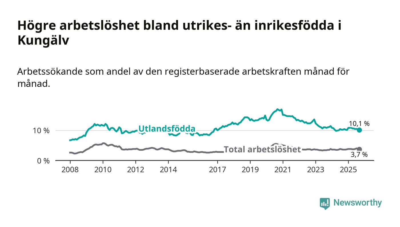 Skillnaden i arbetslöshet mellan utrikesfödda och hela befolkningen är 6,4 procentenheter i Kungälv.