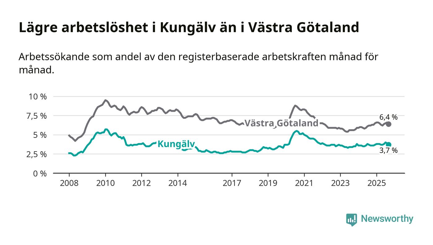 Även om arbetslösheten i Kungälv alltså ökar, så ligger den fortfarande under snittet i hela Västra Götalands län (3,7 procent i kommunen, jämfört med 6,4 procent i hela länet). Öckerö har den lägsta arbetslösheten i länet (2,7 procent), medan Gullspång har den högsta (8,5 procent). För att Kungälv skulle komma ner i samma arbetslöshetsnivå som Öckerö skulle 262 personer behöva sysselsättas.