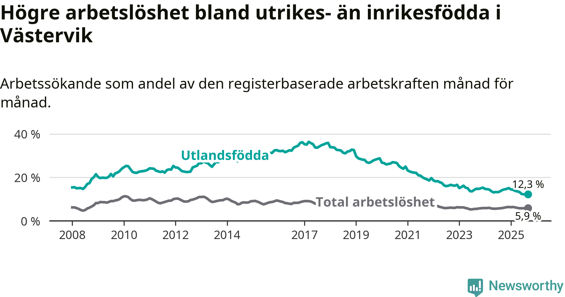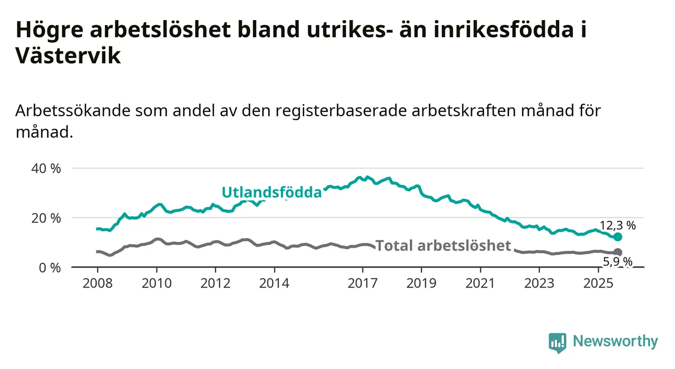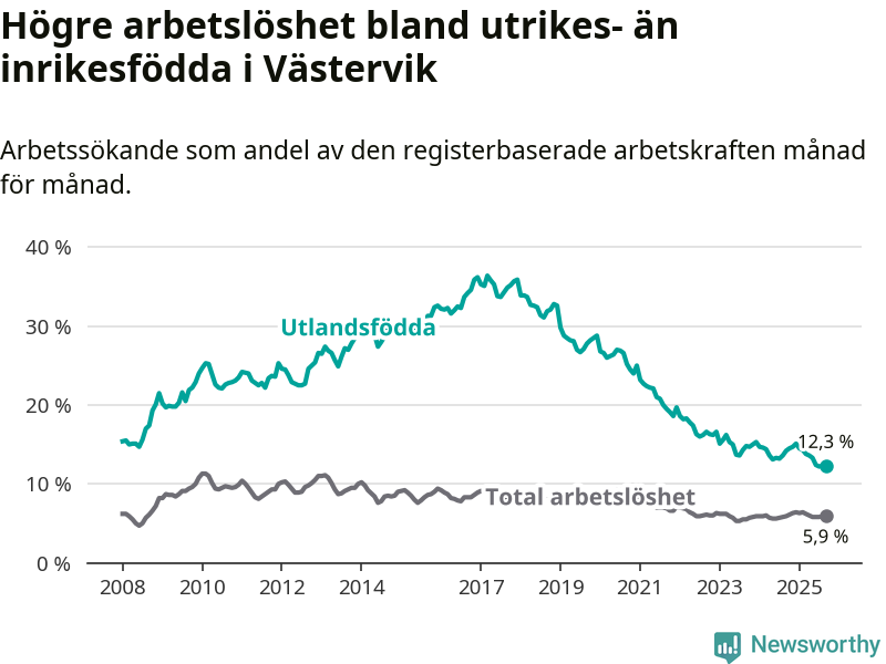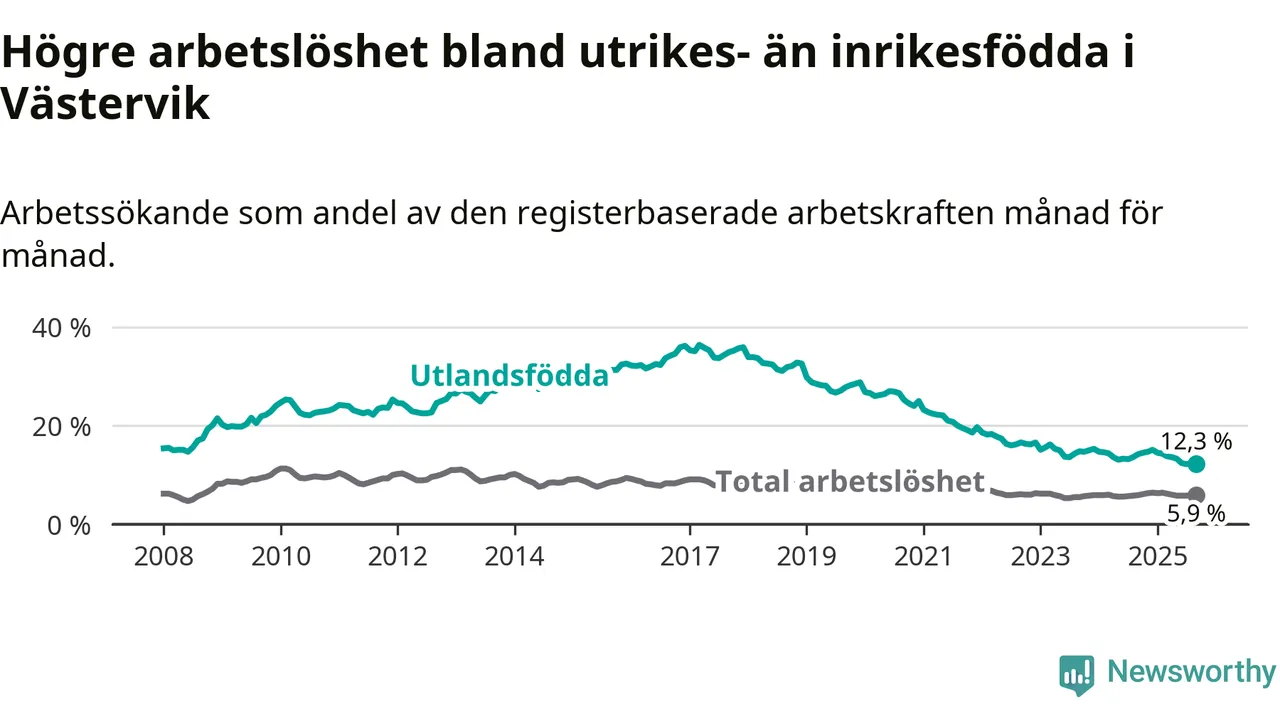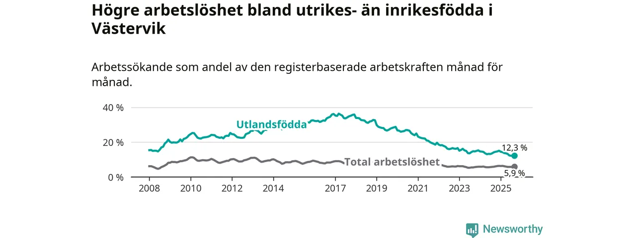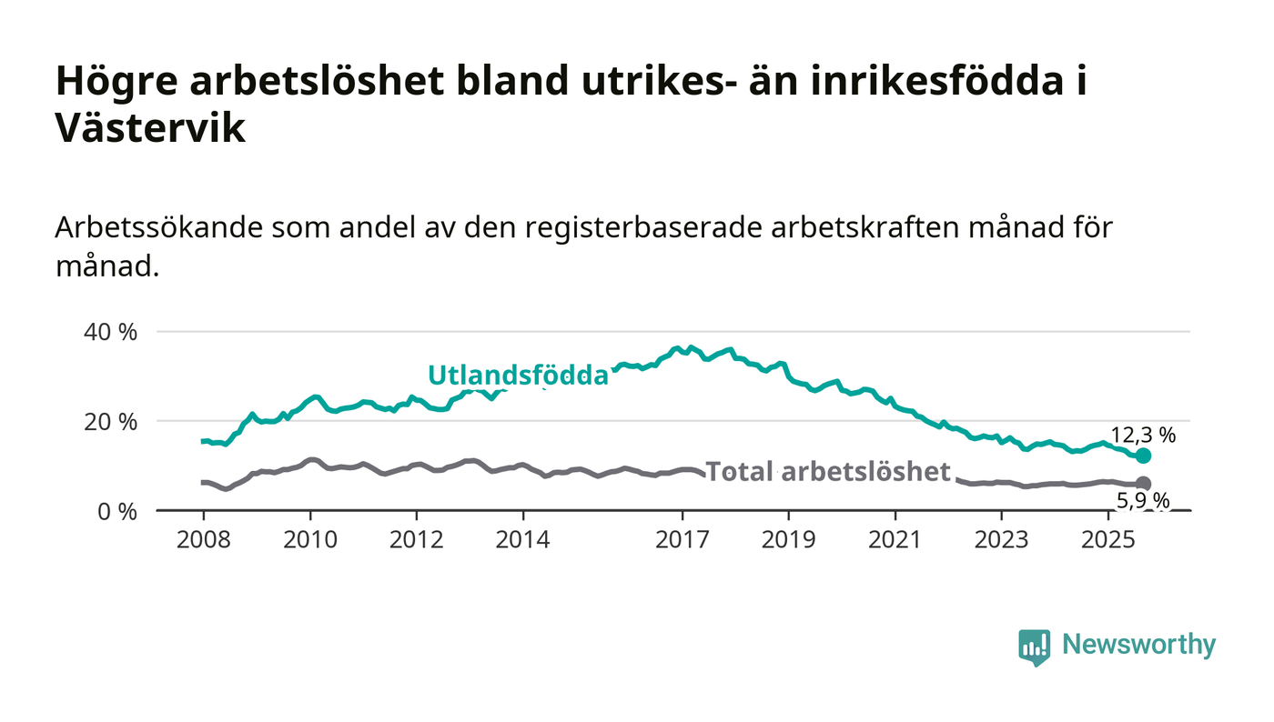 Arbetslösheten bland utlandsfödda var 12,3 procent i Västervik under september månad, motsvarande 305 av 2 480 personer. Det är 1,9 procentenheter färre än vid samma tidpunkt i fjol (−45 om man räknar personer).