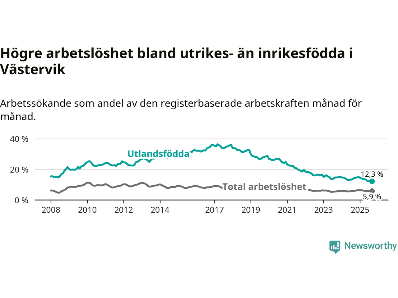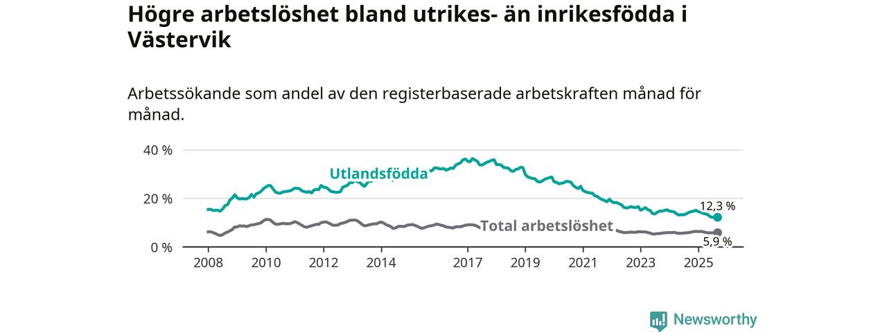 Skillnaden i arbetslöshet mellan utrikesfödda och hela befolkningen är 6,4 procentenheter i Västervik. Det är en betydligt mindre skillnad än för ett år sedan (−1,9 procentenheter).