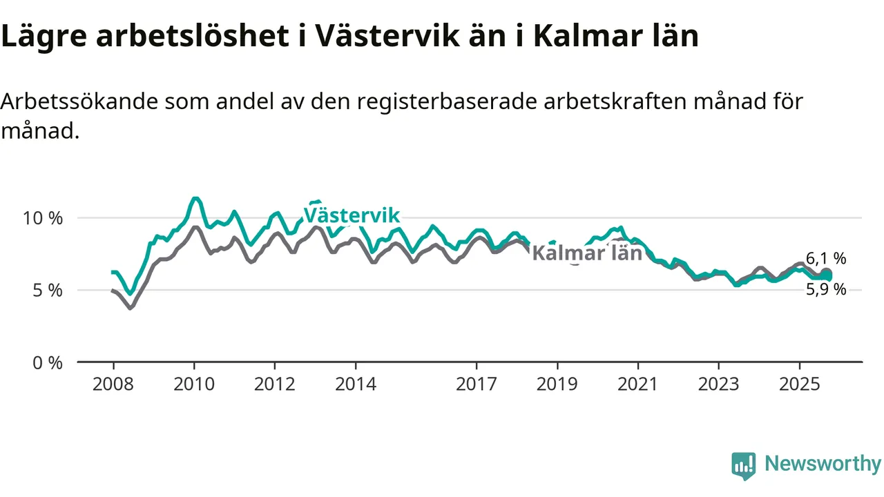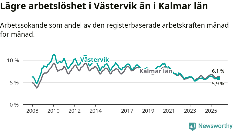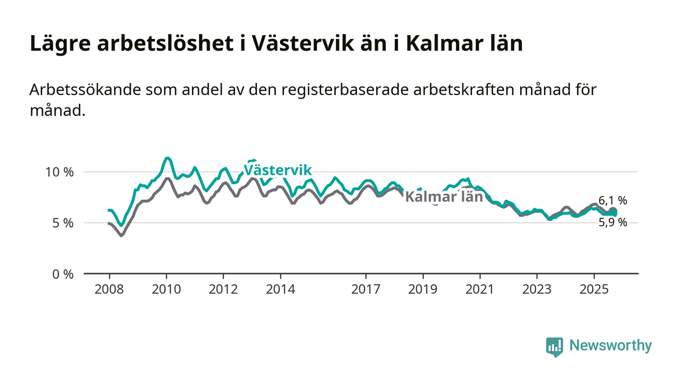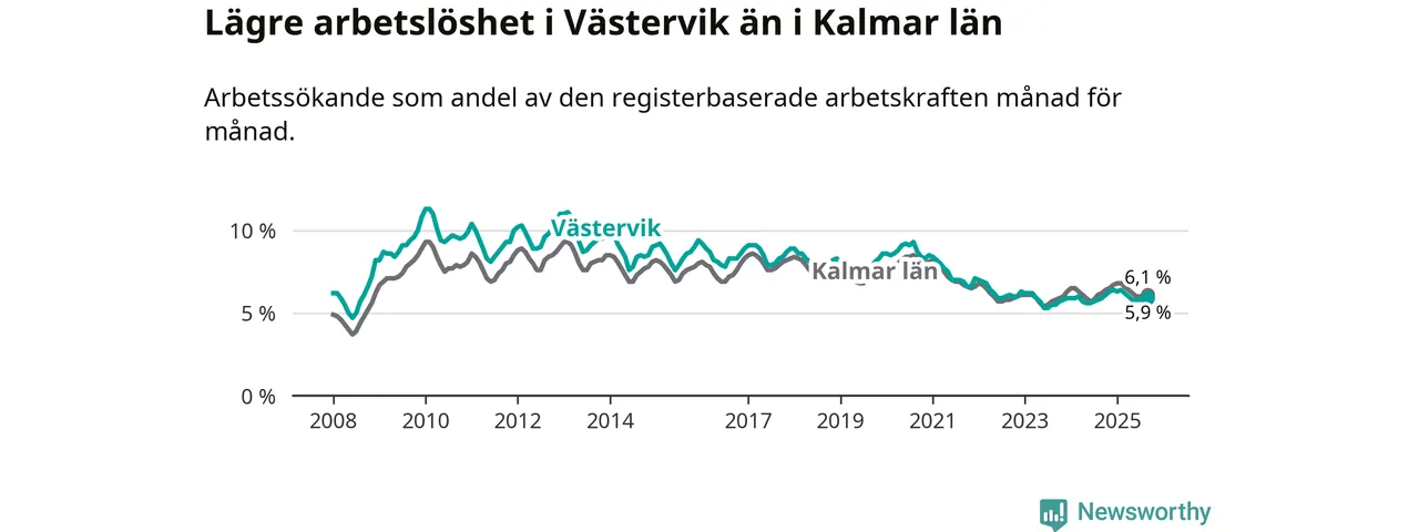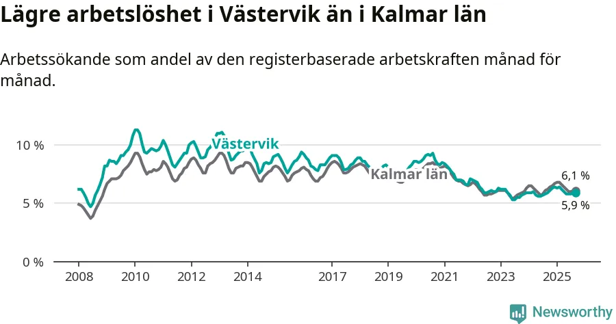 Under september månad rapporterade Västerviks kommun en total arbetslöshet på 5,9 procent. Det är i samma nivå som i september i fjol. I Kalmar län däremot sjunker arbetslösheten något