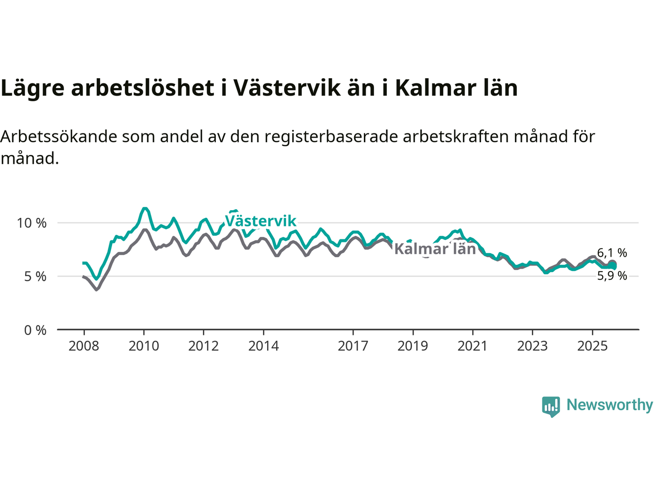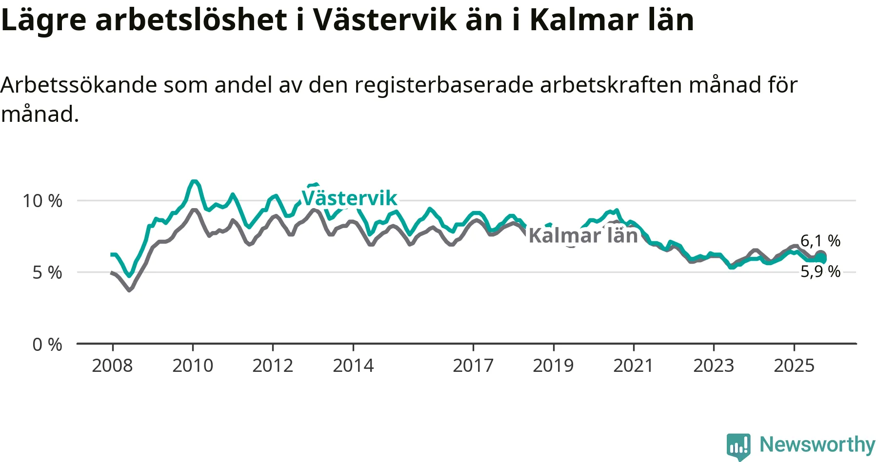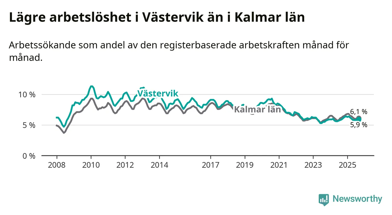 Under september månad rapporterade Västerviks kommun en total arbetslöshet på 5,9 procent. Det är i samma nivå som i september i fjol. I Kalmar län däremot sjunker arbetslösheten något
