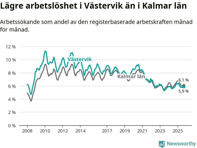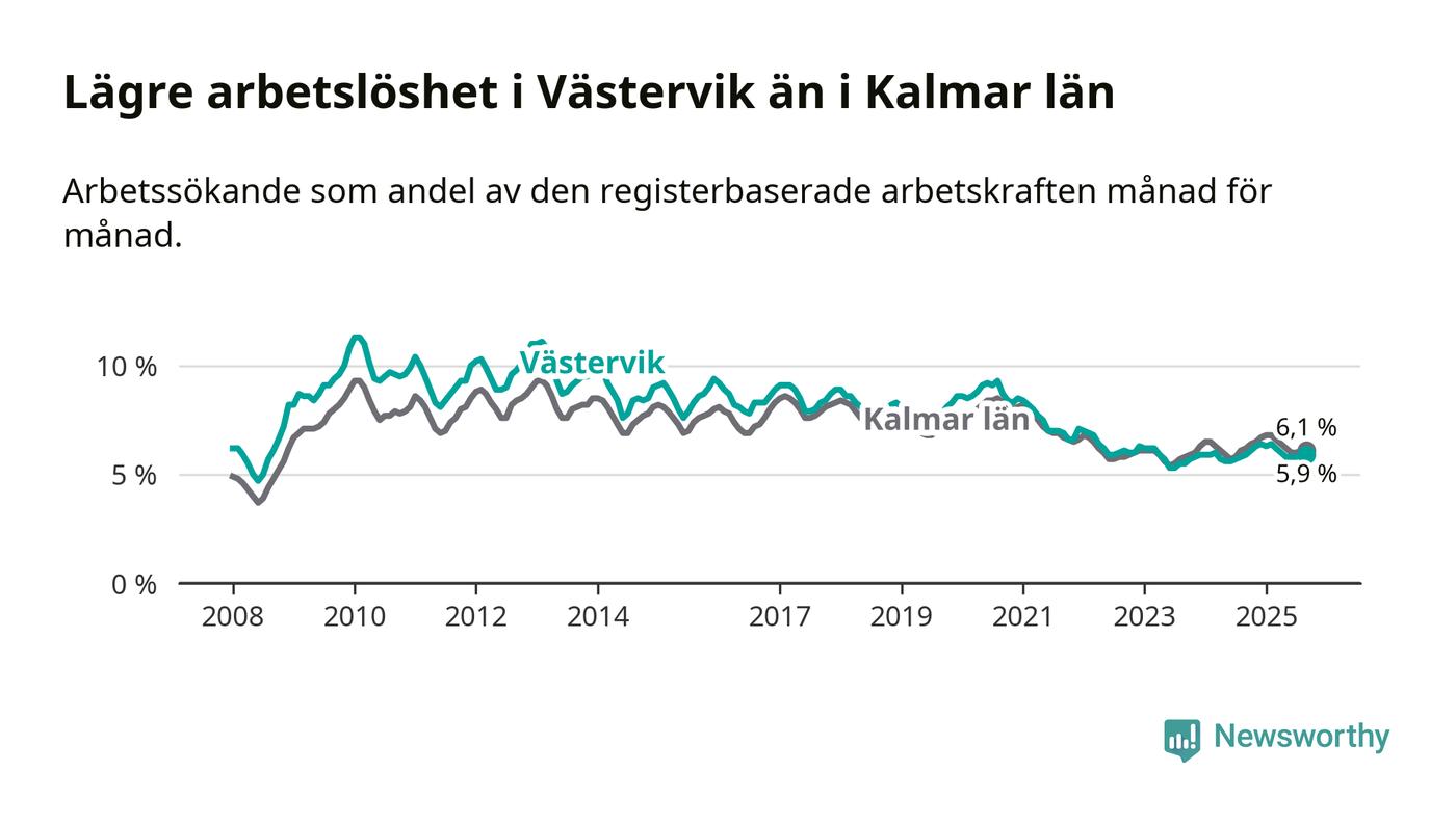 Arbetslösheten i Västervik ligger under nivån i hela Kalmar län (5,9 procent i kommunen, jämfört med 6,1 procent i hela länet). Mörbylånga har den lägsta arbetslösheten i länet (3,4 procent), medan Högsby har den högsta (8,1 procent). För att Västervik skulle komma ner i samma arbetslöshetsnivå som Mörbylånga skulle 407 personer behöva sysselsättas.
