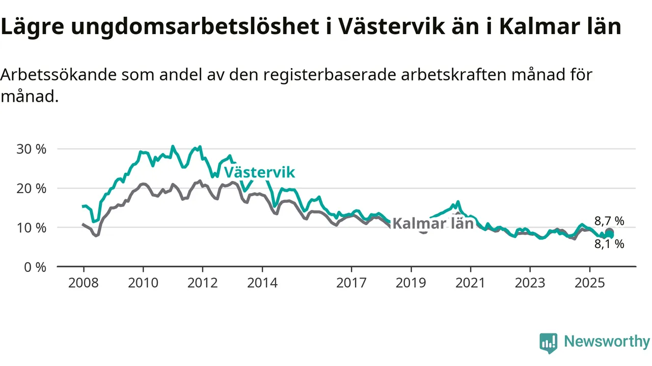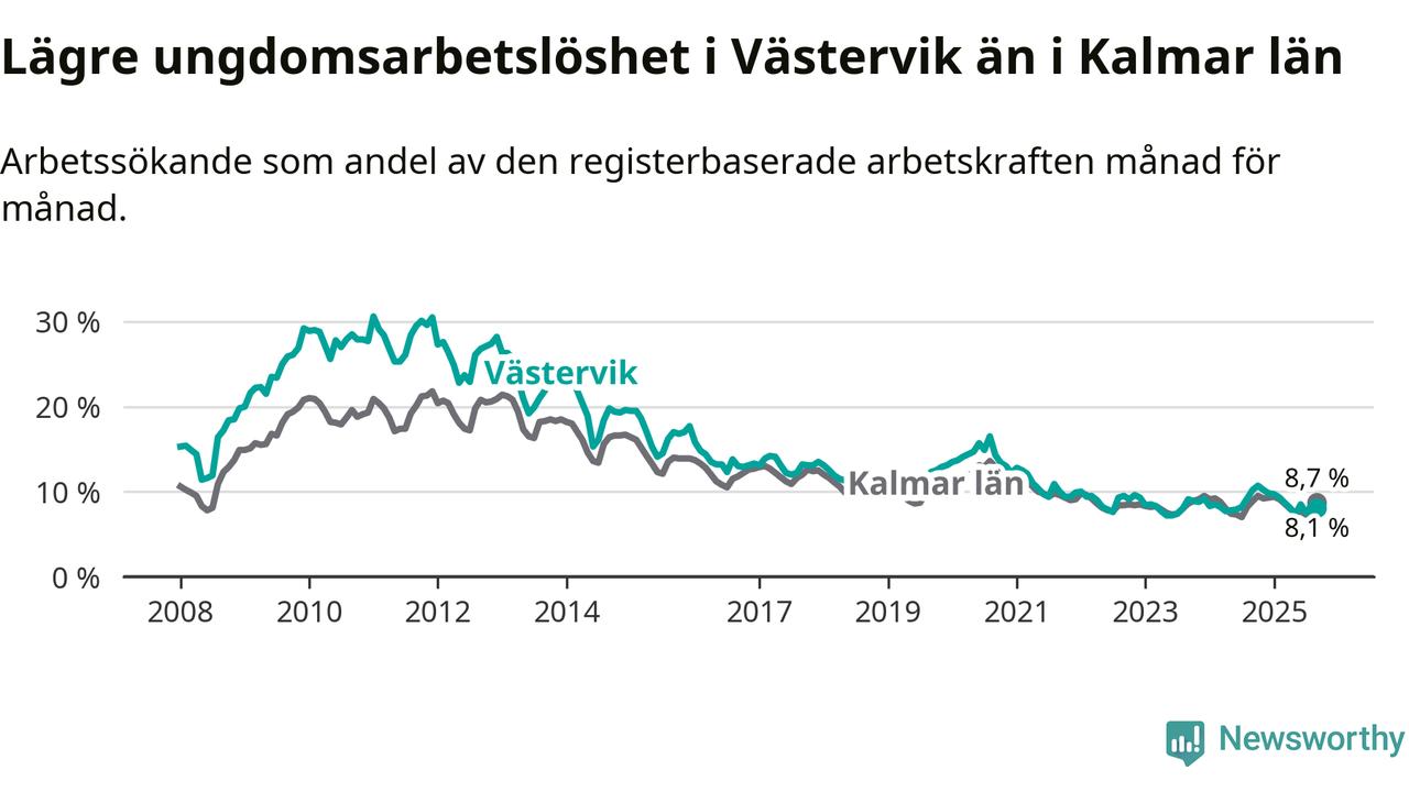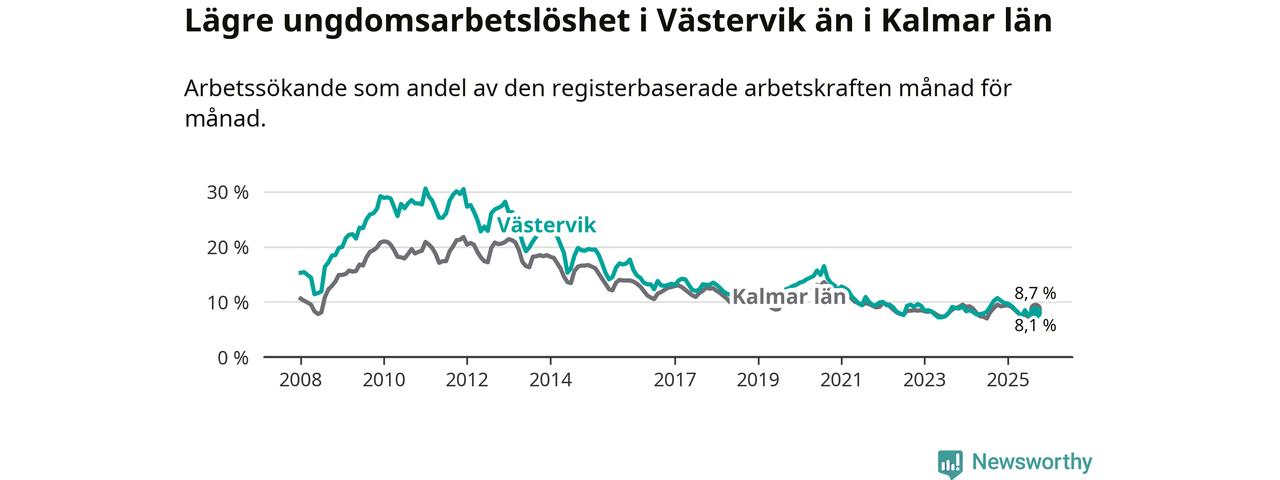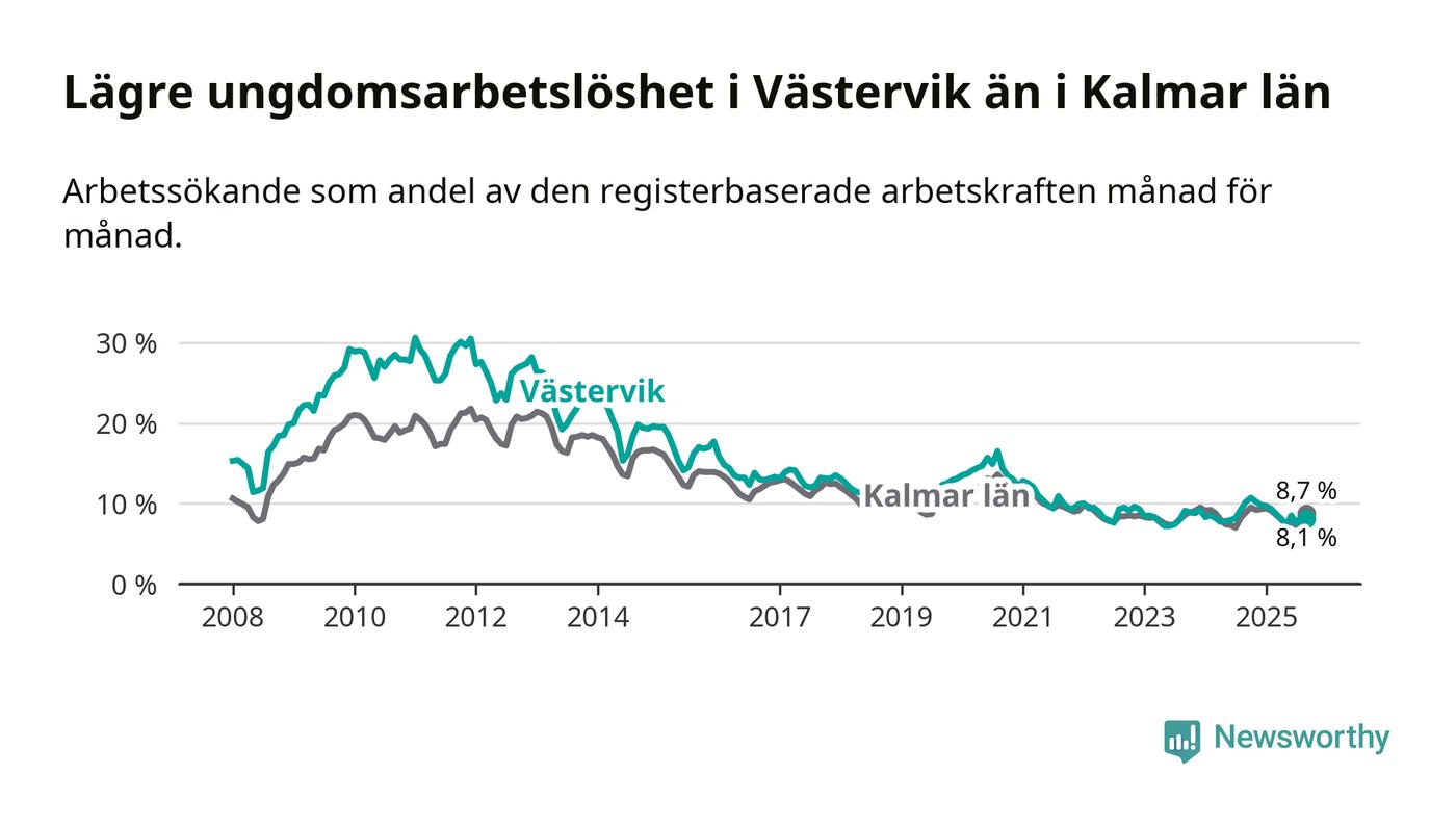 Precis som den totala arbetslösheten ligger ungdomsarbetslösheten i Västervik lägre än i Kalmar län som helhet. Skillnaden mellan kommunen och länet är 0,6 procentenheter.