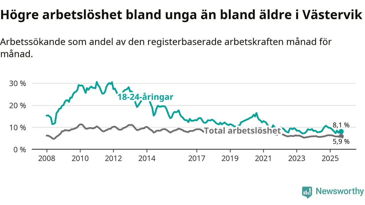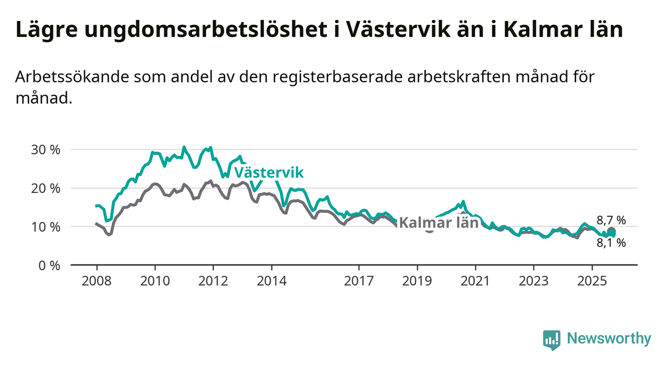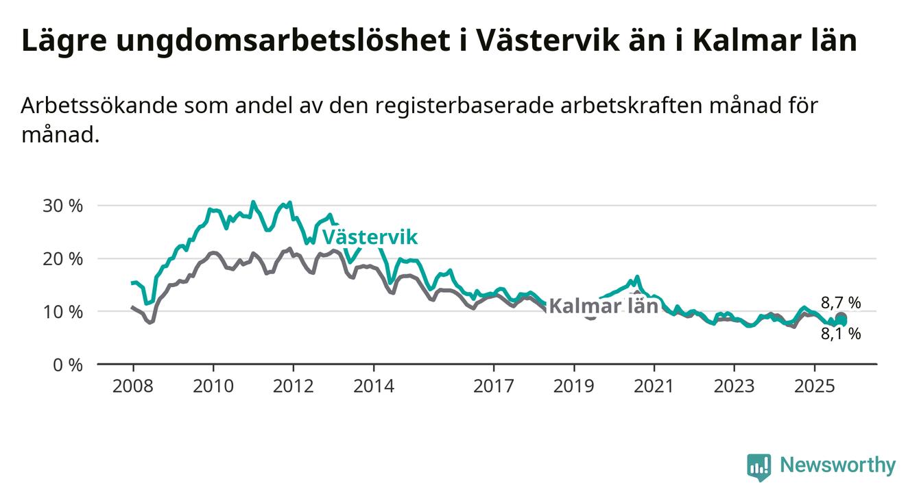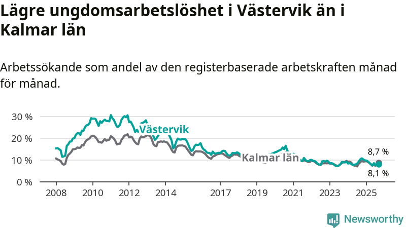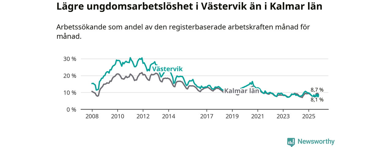 Precis som den totala arbetslösheten ligger ungdomsarbetslösheten i Västervik lägre än i Kalmar län som helhet. Skillnaden mellan kommunen och länet är 0,6 procentenheter.