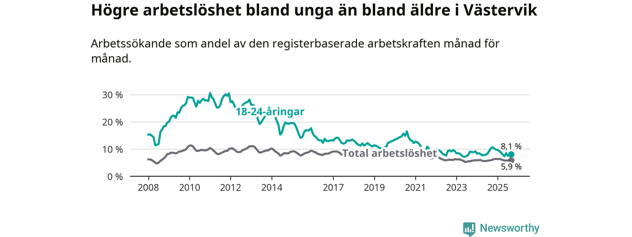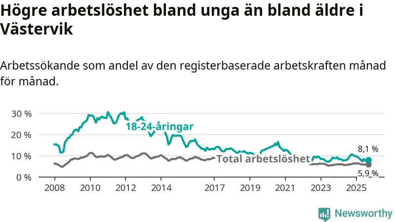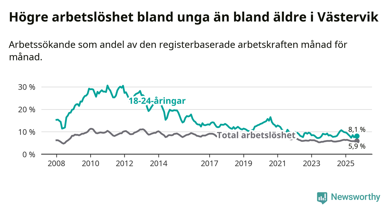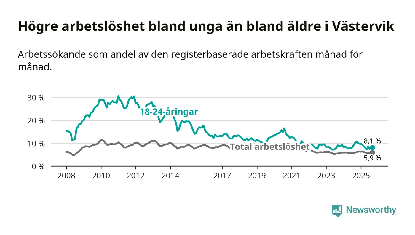 Till skillnad från den totala arbetslösheten sjunker arbetslösheten bland unga (−2,1 procentenheter). I september var 8,1 procent av 18–24-åringarna inskrivna som arbetssökande (motsvarande 131 personer). Mäter vi antalet inskrivna ser vi en minskning med 37 personer på ett års sikt.