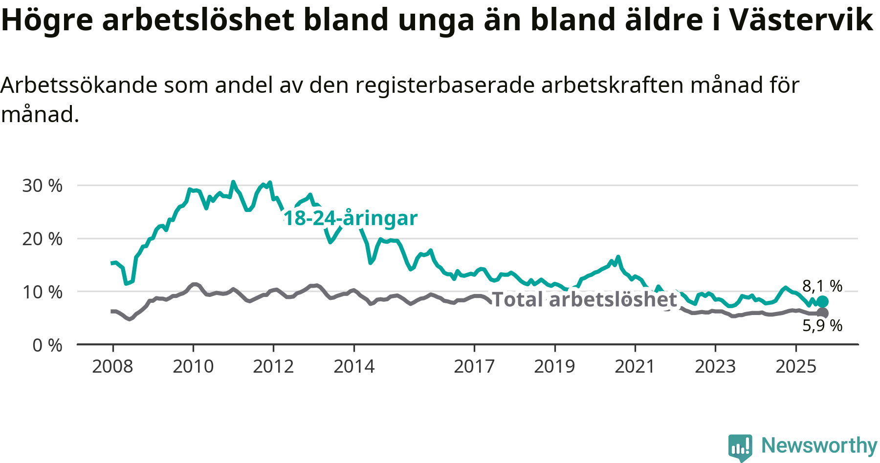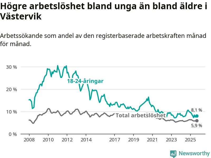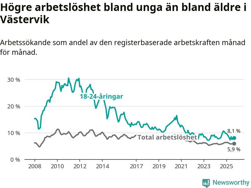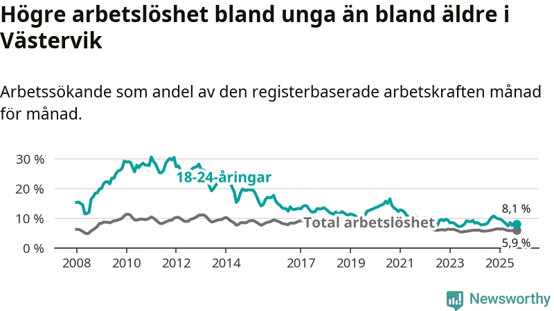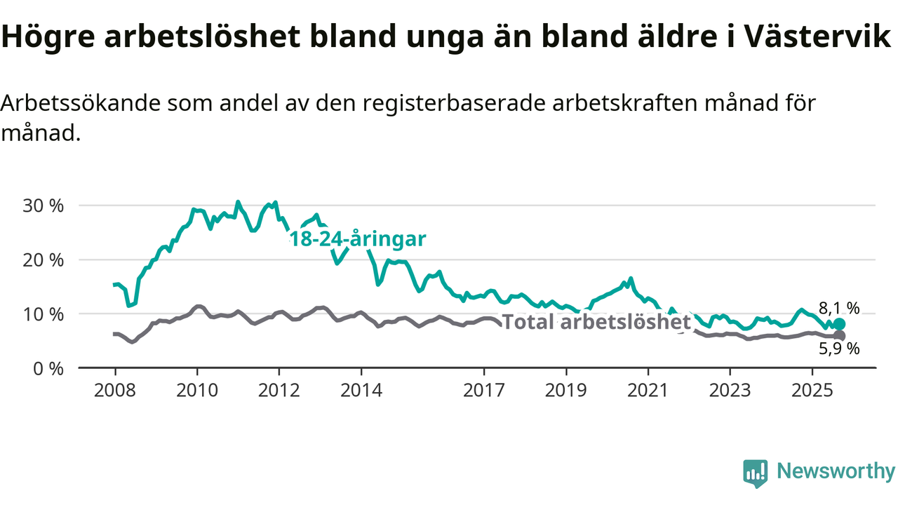 Till skillnad från den totala arbetslösheten sjunker arbetslösheten bland unga (−2,1 procentenheter). I september var 8,1 procent av 18–24-åringarna inskrivna som arbetssökande (motsvarande 131 personer). Mäter vi antalet inskrivna ser vi en minskning med 37 personer på ett års sikt.